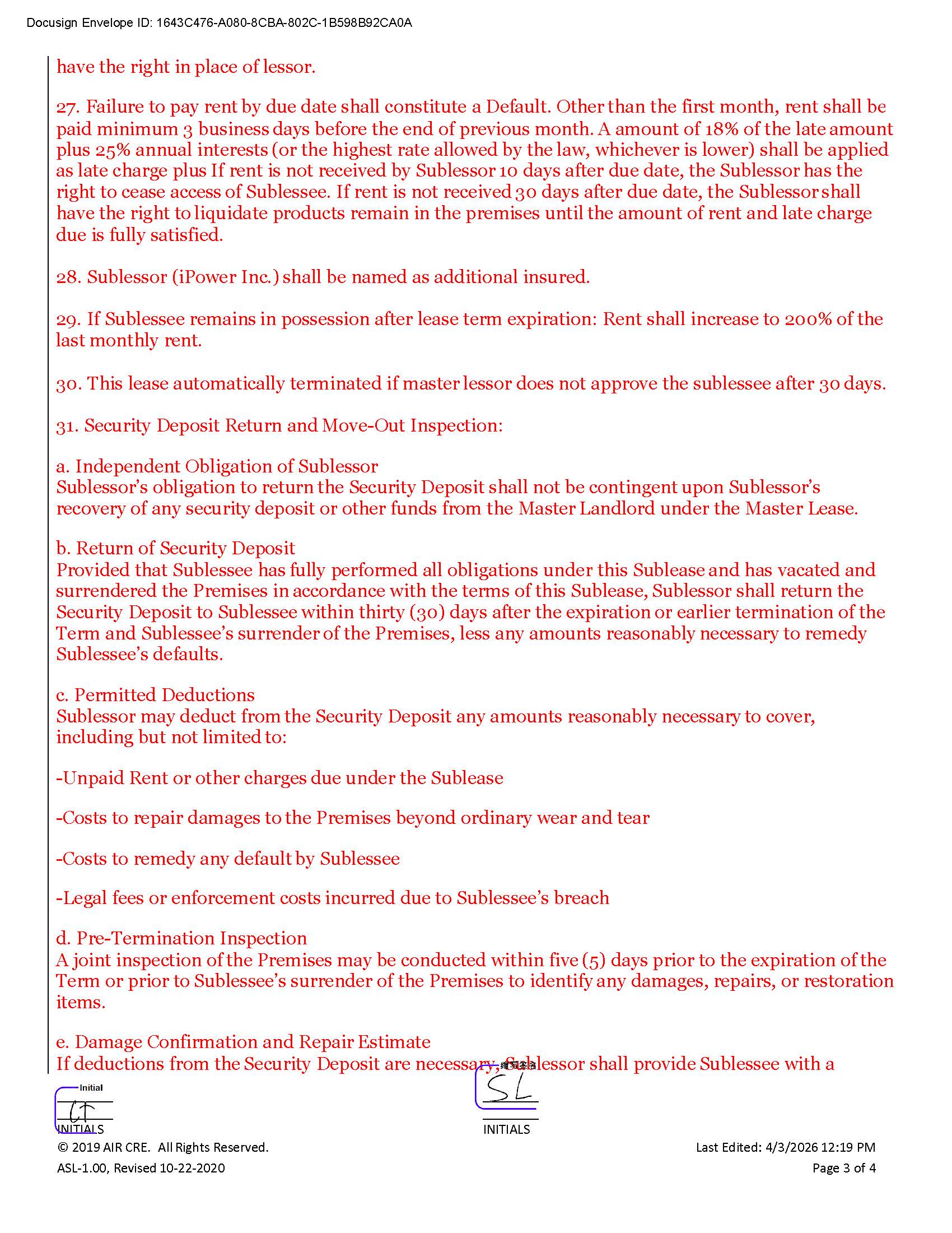 have the right in place of lessor. 27. Failure to pay rent by due date shall constitute a Default. Other than the first month, rent shall be paid minimum 3 business days before the end of previous month. A amount of 18% of the late amount plus 25% annual interests (or the highest rate allowed by the law, whichever is lower) shall be applied as late charge plus If rent is not received by Sublessor 10 days after due date, the Sublessor has the right to cease access of Sublessee. If rent is not received 30 days after due date, the Sublessor shall have the right to liquidate products remain in the premises until the amount of rent and late charge due is fully satisfied. 28. Sublessor (iPower Inc.) shall be named as additional insured. 29. If Sublessee remains in possession after lease term expiration: Rent shall increase to 200% of the last monthly rent. 30. This lease automatically terminated if master lessor does not approve the sublessee after 30 days. 31. Security Deposit Return and Move - Out Inspection: a. Independent Obligation of Sublessor Sublessor’s obligation to return the Security Deposit shall not be contingent upon Sublessor’s recovery of any security deposit or other funds from the Master Landlord under the Master Lease. b. Return of Security Deposit Provided that Sublessee has fully performed all obligations under this Sublease and has vacated and surrendered the Premises in accordance with the terms of this Sublease, Sublessor shall return the Security Deposit to Sublessee within thirty (30) days after the expiration or earlier termination of the Term and Sublessee’s surrender of the Premises, less any amounts reasonably necessary to remedy Sublessee’s defaults. c. Permitted Deductions Sublessor may deduct from the Security Deposit any amounts reasonably necessary to cover, including but not limited to: - Unpaid Rent or other charges due under the Sublease - Costs to repair damages to the Premises beyond ordinary wear and tear - Costs to remedy any default by Sublessee - Legal fees or enforcement costs incurred due to Sublessee’s breach d. Pre - Termination Inspection A joint inspection of the Premises may be conducted within five (5) days prior to the expiration of the Term or prior to Sublessee’s surrender of the Premises to identify any damages, repairs, or restoration items. e. Damage Confirmation and Repair Estimate If deductions from the Security Deposit are necessary, Sublessor shall provide Sublessee with a Docusign Envelope ID: 1643C476 - A080 - 8CBA - 802C - 1B598B92CA0A INITIALS © 2019 AIR CRE. All Rights Reserved. ASL - 1.00, Revised 10 - 22 - 2020 INITIALS Last Edited: 4/3/2026 12:19 PM Page 3 of 4