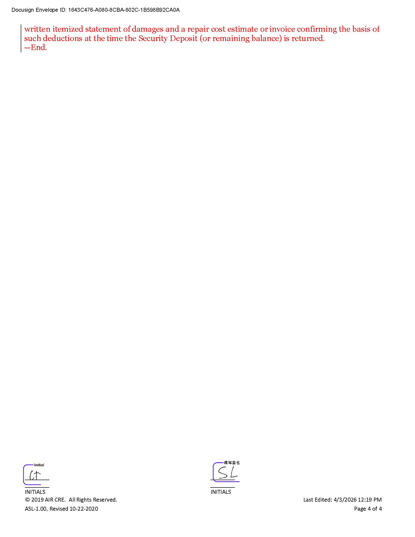 written itemized statement of damages and a repair cost estimate or invoice confirming the basis of such deductions at the time the Security Deposit (or remaining balance) is returned. - - End. Docusign Envelope ID: 1643C476 - A080 - 8CBA - 802C - 1B598B92CA0A INITIALS © 2019 AIR CRE. All Rights Reserved. ASL - 1.00, Revised 10 - 22 - 2020 INITIALS Last Edited: 4/3/2026 12:19 PM Page 4 of 4