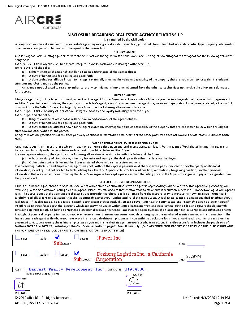 DISCLOSURE REGARDING REAL ESTATE AGENCY RELATIONSHIP (As required by the Civil Code) When you enter into a discussion with a real estate agent regarding a real estate transaction, you should from the outset understand what type of agency relationship or representation you wish to have with the agent in the transaction. SELLER'S AGENT A Seller's agent under a listing agreement with the Seller acts as the agent for the Seller only. A Seller's agent or a subagent of that agent has the following affirmative obligations: To the Seller: A fiduciary duty of utmost care, integrity, honesty and loyalty in dealings with the Seller. To the Buyer and the Seller: (a) Diligent exercise of reasonable skill and care in performance of the agent's duties. (b) A duty of honest and fair dealing and good faith. (c) A duty to disclose all facts known to the agent materially affecting the value or desirability of the property that are not known to, or within the diligent attention and observation of, the parties. An agent is not obligated to reveal to either party any confidential information obtained from the other party that does not involve the affirmative duties set forth above. BUYER'S AGENT A Buyer's agent can, with a Buyer's consent, agree to act as agent for the Buyer only. This includes a Buyer's agent under a buyer - broker representation agreement with the Buyer. In these situations, the agent is not the Seller's agent, even if by agreement the agent may receive compensation for services rendered, either in full or in part from the Seller. An agent acting only for a Buyer has the following affirmative obligations: To the Buyer: A fiduciary duty of utmost care, integrity, honesty and loyalty in dealings with the Buyer. To the Buyer and the Seller: (a) Diligent exercise of reasonable skill and care in performance of the agent's duties. (b) A duty of honest and fair dealing and good faith. (c) A duty to disclose all facts known to the agent materially affecting the value or desirability of the property that are not known to, or within the diligent attention and observation of, the parties. An agent is not obligated to reveal to either party any confidential information obtained from the other party that does not involve the affirmative duties set forth above. AGENT REPRESENTING BOTH SELLER AND BUYER A real estate agent, either acting directly or through one or more salesperson and broker associates, can legally be the agent of both the Seller and the Buyer in a transaction, but only with the knowledge and consent of both the Seller and the Buyer. In a dual agency situation, the agent has the following affirmative obligations to both the Seller and the Buyer: (a) A fiduciary duty of utmost care, integrity, honesty and loyalty in the dealings with either the Seller or the Buyer. (b) Other duties to the Seller and the Buyer as stated above in their respective sections. In representing both Seller and Buyer, a dual agent may not, without the express permission of the respective party, disclose to the other party confidential information, including, but not limited to, facts relating to either the Buyer's or Seller's financial position, motivations, bargaining position, or other personal information that may impact price, including the Seller's willingness to accept a price less than the listing price or the Buyer's willingness to pay a price greater than the price offered. SELLER AND BUYER RESPONSIBILITIES Either the purchase agreement or a separate document will contain a confirmation of which agent is representing you and whether that agent is representing you exclusively in the transaction or acting as a dual agent. Please pay attention to that confirmation to make sure it accurately reflects your understanding of your agent's role. The above duties of the agent in a real estate transaction do not relieve a Seller or Buyer from the responsibility to protect their own interests. You should carefully read all agreements to assure that they adequately express your understanding of the transaction. A real estate agent is a person qualified to advise about real estate. If legal or tax advice is desired, consult a competent professional. If you are a Buyer, you have the duty to exercise reasonable care to protect yourself, including as to those facts about the property which are known to you or within your diligent attention and observation. Both Sellers and Buyers should strongly consider obtaining tax advice from a competent professional because the federal and state tax consequences of a transaction can be complex and subject to change. Throughout your real property transaction you may receive more than one disclosure form, depending upon the number of agents assisting in the transaction. The law requires each agent with whom you have more than a casual relationship to present you with this disclosure form. You should read its contents each time it is presented to you, considering the relationship between you and the real estate agent in your specific transaction. This disclosure form includes the provisions of Sections 2079.13 to 2079.24, inclusive, of the Civil Code set forth on page 2. Read it carefully. I/WE ACKNOWLEDGE RECEIPT OF A COPY OF THIS DISCLOSURE AND THE PORTIONS OF THE CIVIL CODE PRINTED ON THE BACK (OR A SEPARATE PAGE). Sub Lessor Buyer Seller Lessee iPower Inc. Date: Buyer Seller Lessor Dezheng Logistics Inc., a California Sub Lessee Corporation Date: Agent: Harvest Realty Development Inc DRE Lic. #: 01964500 Real Estate Broker (Firm) Docusign Envelope ID: 1643C476 - A080 - 8CBA - 802C - 1B598B92CA0A 2026/4/4 INITIALS © 2019 AIR CRE. All Rights Reserved. AD - 3.11, Revised 12 - 31 - 2024 INITIALS Last Edited: 4/3/2026 12:19 PM Page 1 of 4