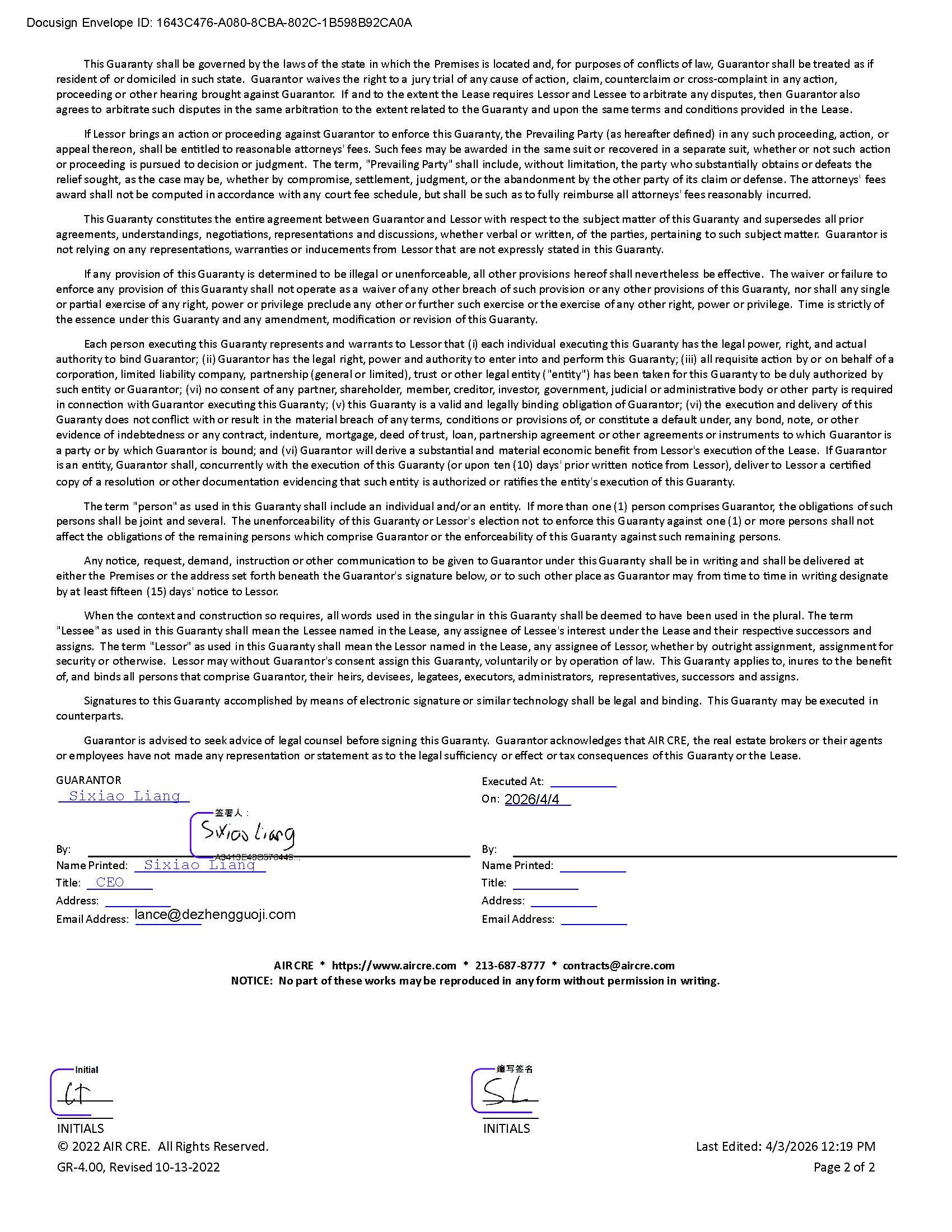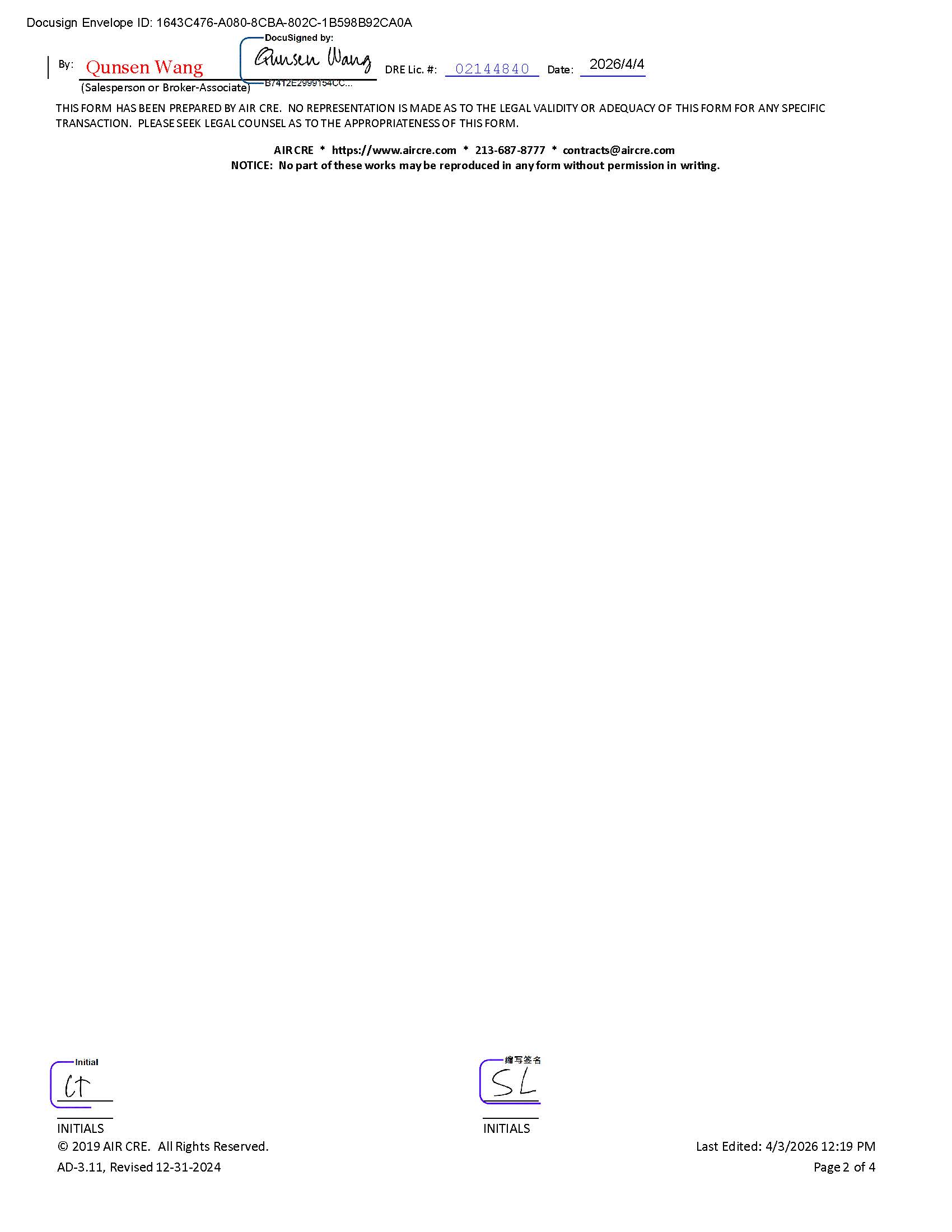 ________ By: Qunsen Wang DRE Lic. #: 02144840 Date: (Salesperson or Broker - Associate) THIS FORM HAS BEEN PREPARED BY AIR CRE. NO REPRESENTATION IS MADE AS TO THE LEGAL VALIDITY OR ADEQUACY OF THIS FORM FOR ANY SPECIFIC TRANSACTION. PLEASE SEEK LEGAL COUNSEL AS TO THE APPROPRIATENESS OF THIS FORM. AIR CRE * https://www.aircre.com * 213 - 687 - 8777 * contracts@aircre.com NOTICE: No part of these works may be reproduced in any form without permission in writing. Docusign Envelope ID: 1643C476 - A080 - 8CBA - 802C - 1B598B92CA0A 2026/4/4 INITIALS © 2019 AIR CRE. All Rights Reserved. AD - 3.11, Revised 12 - 31 - 2024 INITIALS Last Edited: 4/3/2026 12:19 PM Page 2 of 4