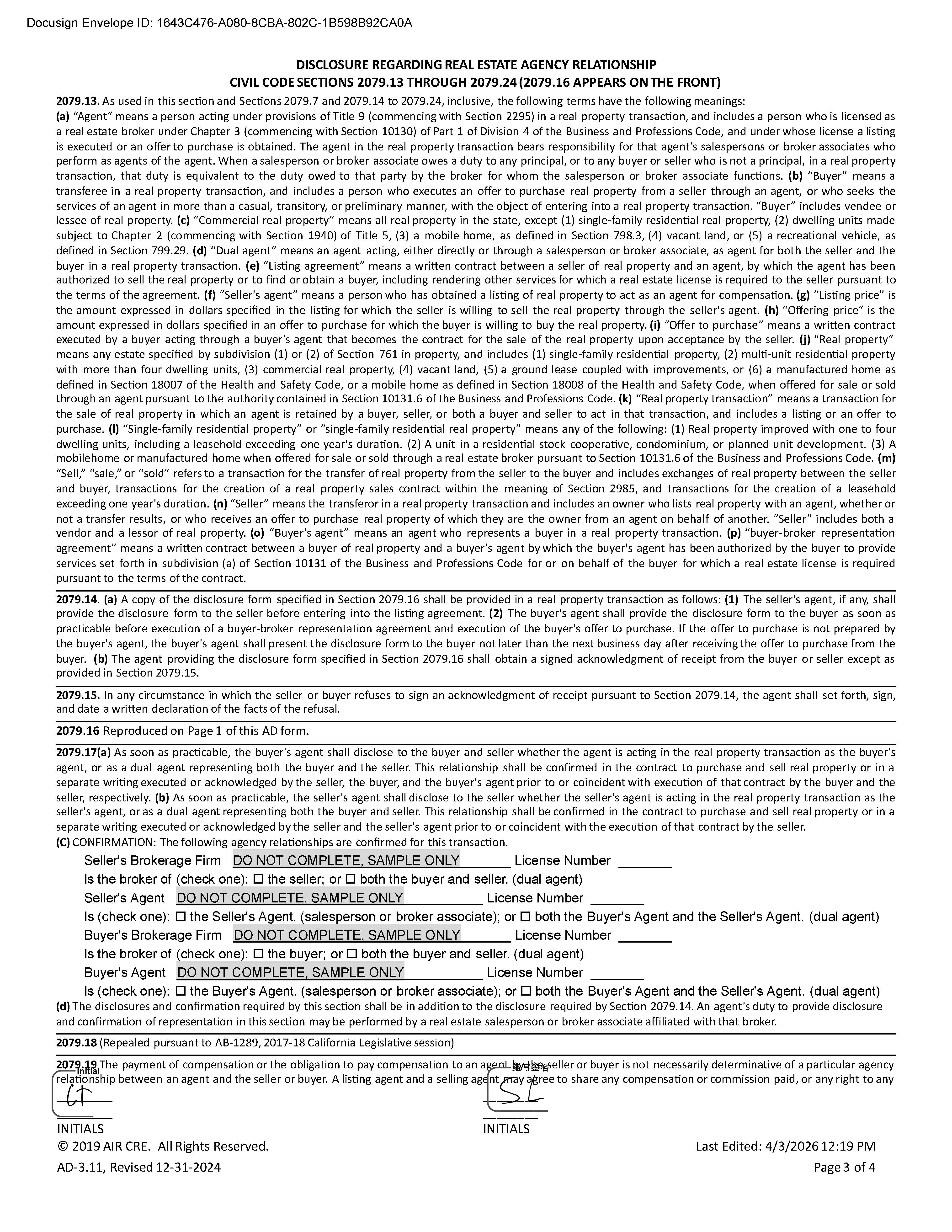 Docusign Envelope ID: 1643C476 - A080 - 8CBA - 802C - 1B598B92CA0A DISCLOSURE REGARDING REAL ESTATE AGENCY RELATIONSHIP CIVIL CODE SECTIONS 2079.13 THROUGH 2079.24 (2079.16 APPEARS ON THE FRONT) 2079 . 13 . As used in this section and Sections 2079 . 7 and 2079 . 14 to 2079 . 24 , inclusive, the following terms have the following meanings : (a) “Agent” means a person acting under provisions of Title 9 (commencing with Section 2295 ) in a real property transaction, and includes a person who is licensed as a real estate broker under Chapter 3 (commencing with Section 10130 ) of Part 1 of Division 4 of the Business and Professions Code, and under whose license a listing is executed or an offer to purchase is obtained . The agent in the real property transaction bears responsibility for that agent's salespersons or broker associates who perform as agents of the agent . When a salesperson or broker associate owes a duty to any principal, or to any buyer or seller who is not a principal, in a real property transaction, that duty is equivalent to the duty owed to that party by the broker for whom the salesperson or broker associate functions . (b) “Buyer” means a transferee in a real property transaction, and includes a person who executes an offer to purchase real property from a seller through an agent, or who seeks the services of an agent in more than a casual, transitory, or preliminary manner, with the object of entering into a real property transaction . “Buyer” includes vendee or lessee of real property . (c) “Commercial real property” means all real property in the state, except ( 1 ) single - family residential real property, ( 2 ) dwelling units made subject to Chapter 2 (commencing with Section 1940 ) of Title 5 , ( 3 ) a mobile home, as defined in Section 798 . 3 , ( 4 ) vacant land, or ( 5 ) a recreational vehicle, as defined in Section 799 . 29 . (d) “Dual agent” means an agent acting, either directly or through a salesperson or broker associate, as agent for both the seller and the buyer in a real property transaction . (e) “Listing agreement” means a written contract between a seller of real property and an agent, by which the agent has been authorized to sell the real property or to find or obtain a buyer, including rendering other services for which a real estate license is required to the seller pursuant to the terms of the agreement . (f) “Seller's agent” means a person who has obtained a listing of real property to act as an agent for compensation . (g) “Listing price” is the amount expressed in dollars specified in the listing for which the seller is willing to sell the real property through the seller's agent . (h) “Offering price” is the amount expressed in dollars specified in an offer to purchase for which the buyer is willing to buy the real property . (i) “Offer to purchase” means a written contract executed by a buyer acting through a buyer's agent that becomes the contract for the sale of the real property upon acceptance by the seller . (j) “Real property” means any estate specified by subdivision ( 1 ) or ( 2 ) of Section 76 1 in property, and includes ( 1 ) single - family residential property, ( 2 ) multi - unit residential property with more than four dwelling units, ( 3 ) commercial real property, ( 4 ) vacant land, ( 5 ) a ground lease coupled with improvements, or ( 6 ) a manufactured home as defined in Section 1800 7 of the Health and Safety Code, or a mobile home as defined in Section 1800 8 of the Health and Safety Code, when offered for sale or sold through an agent pursuant to the authority contained in Section 10131 . 6 of the Business and Professions Code . (k) “Real property transaction” means a transaction for the sale of real property in which an agent is retained by a buyer, seller, or both a buyer and seller to act in that transaction, and includes a listing or an offer to purchase . (l) “Single - family residential property” or “single - family residential real property” means any of the following : ( 1 ) Real property improved with one to four dwelling units, including a leasehold exceeding one year's duration . ( 2 ) A unit in a residential stock cooperative, condominium, or planned unit development . ( 3 ) A mobilehome or manufactured home when offered for sale or sold through a real estate broker pursuant to Section 10131 . 6 of the Business and Professions Code . (m) “Sell,” “sale,” or “sold” refers to a transaction for the transfer of real property from the seller to the buyer and includes exchanges of real property between the seller and buyer, transactions for the creation of a real property sales contract within the meaning of Section 2985 , and transactions for the creation of a leasehold exceeding one year's duration . (n) “Seller” means the transferor in a real property transaction and includes an owner who lists real property with an agent, whether or not a transfer results, or who receives an offer to purchase real property of which they are the owner from an agent on behalf of another . “Seller” includes both a vendor and a lessor of real property . (o) “Buyer's agent” means an agent who represents a buyer in a real property transaction . (p) “buyer - broker representation agreement” means a written contract between a buyer of real property and a buyer's agent by which the buyer's agent has been authorized by the buyer to provide services set forth in subdivision (a) of Section 1013 1 of the Business and Professions Code for or on behalf of the buyer for which a real estate license is required pursuant to the terms of the contract . 2079 . 14 . (a) A copy of the disclosure form specified in Section 2079 . 16 shall be provided in a real property transaction as follows : ( 1 ) The seller's agent, if any, shall provide the disclosure form to the seller before entering into the listing agreement . ( 2 ) The buyer's agent shall provide the disclosure 
