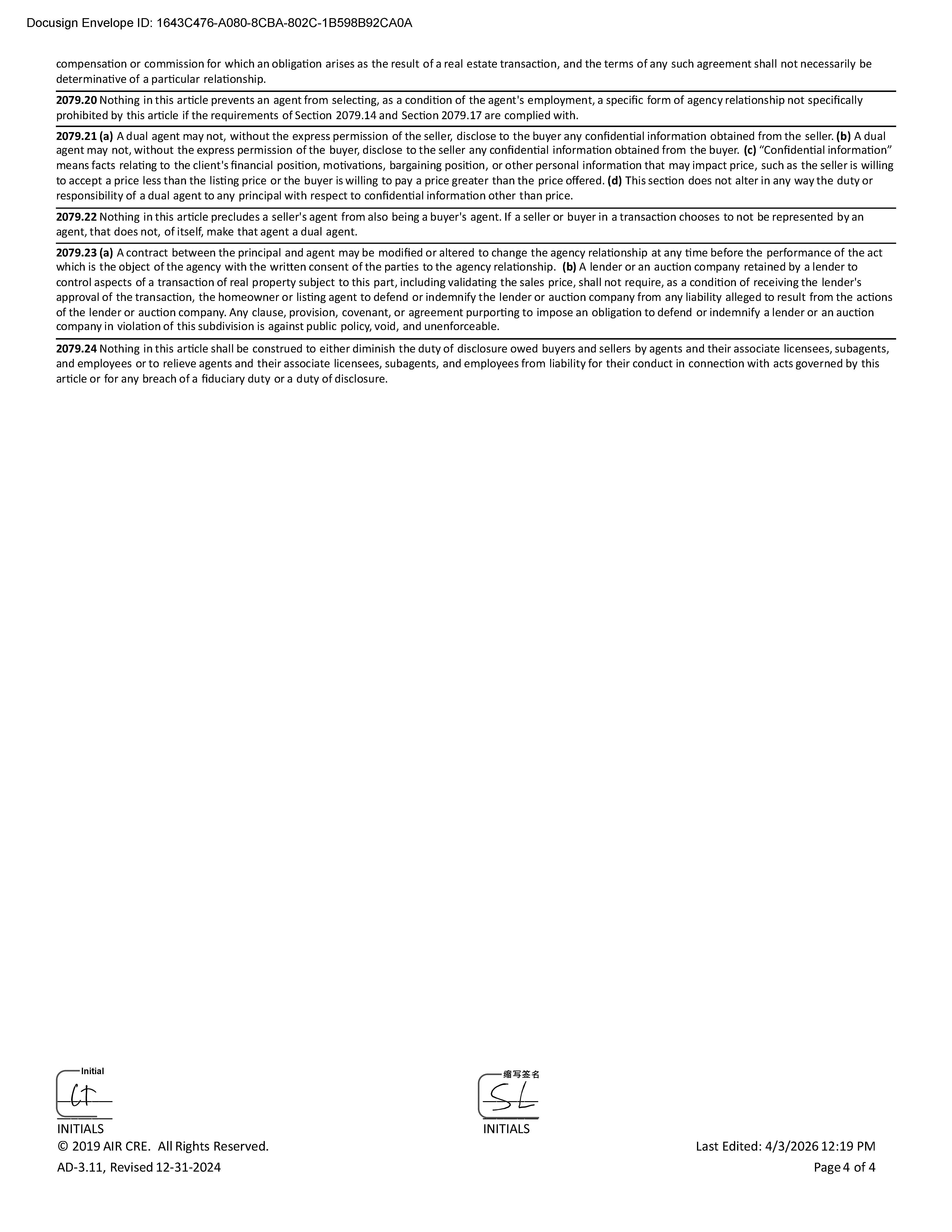 Docusign Envelope ID: 1643C476 - A080 - 8CBA - 802C - 1B598B92CA0A compensation or commission for which an obligation arises as the result of a real estate transaction, and the terms of any such agreement shall not necessarily be determinative of a particular relationship. 2079.20 Nothing in this article prevents an agent from selecting, as a condition of the agent's employment, a specific form of agency relationship not specifically prohibited by this article if the requirements of Section 2079.14 and Section 2079.17 are complied with. 2079.21 (a) A dual agent may not, without the express permission of the seller, disclose to the buyer any confidential information obtained from the seller. (b) A dual agent may not, without the express permission of the buyer, disclose to the seller any confidential information obtained from the buyer. (c) “Confidential information” means facts relating to the client's financial position, motivations, bargaining position, or other personal information that may impact price, such as the seller is willing to accept a price less than the listing price or the buyer is willing to pay a price greater than the price offered. (d) This section does not alter in any way the duty or responsibility of a dual agent to any principal with respect to confidential information other than price. 2079.22 Nothing in this article precludes a seller's agent from also being a buyer's agent. If a seller or buyer in a transaction chooses to not be represented by an agent, that does not, of itself, make that agent a dual agent. 2079.23 (a) A contract between the principal and agent may be modified or altered to change the agency relationship at any time before the performance of the act which is the object of the agency with the written consent of the parties to the agency relationship. (b) A lender or an auction company retained by a lender to control aspects of a transaction of real property subject to this part, including validating the sales price, shall not require, as a condition of receiving the lender's approval of the transaction, the homeowner or listing agent to defend or indemnify the lender or auction company from any liability alleged to result from the actions of the lender or auction company. Any clause, provision, covenant, or agreement purporting to impose an obligation to defend or indemnify a lender or an auction company in violation of this subdivision is against public policy, void, and unenforceable. 2079.24 Nothing in this article shall be construed to either diminish the duty of disclosure owed buyers and sellers by agents and their associate licensees, subagents, and employees or to relieve agents and their associate licensees, subagents, and employees from liability for their conduct in connection with acts governed by this article or for any breach of a fiduciary duty or a duty of disclosure. INITIALS © 2019 AIR CRE. All Rights Reserved. AD - 3.11, Revised 12 - 31 - 2024 INITIALS Last Edited: 4/3/2026 12:19 PM Page 4 of 4