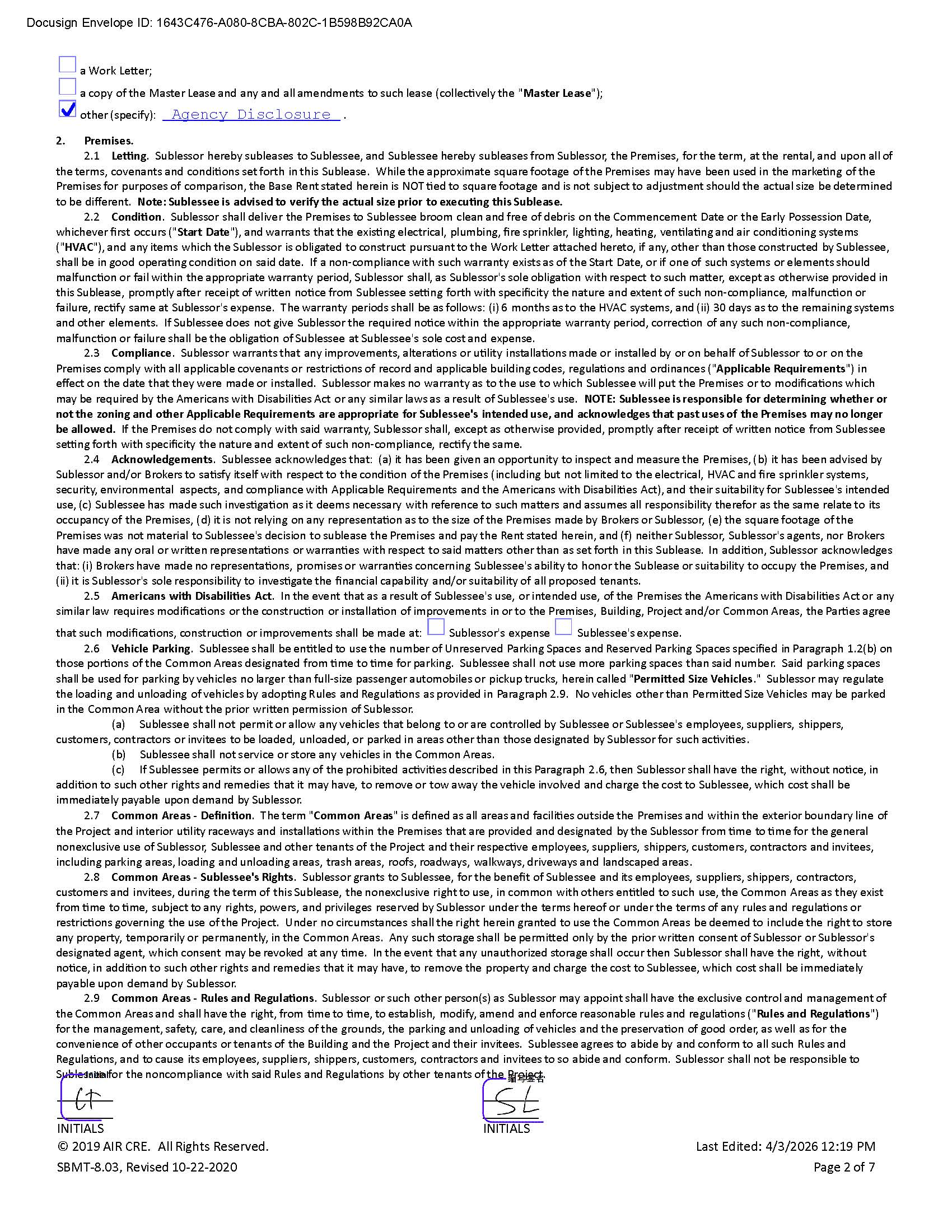 Docusign Envelope ID: 1643C476 - A080 - 8CBA - 802C - 1B598B92CA0A a Work Letter; a copy of the Master Lease and any and all amendments to such lease (collectively the " Master Lease "); other (specify): Agency Disclosure . 2. Premises. 1. Letting . Sublessor hereby subleases to Sublessee, and Sublessee hereby subleases from Sublessor, the Premises, for the term, at the rental, and upon all of the terms, covenants and conditions set forth in this Sublease. While the approximate square footage of the Premises may have been used in the marketing of the Premises for purposes of comparison, the Base Rent stated herein is NOT tied to square footage and is not subject to adjustment should the actual size be determined to be different. Note: Sublessee is advised to verify the actual size prior to executing this Sublease. 2. Condition . Sublessor shall deliver the Premises to Sublessee broom clean and free of debris on the Commencement Date or the Early Possession Date, whichever first occurs (" Start Date "), and warrants that the existing electrical, plumbing, fire sprinkler, lighting, heating, ventilating and air conditioning systems (" HVAC "), and any items which the Sublessor is obligated to construct pursuant to the Work Letter attached hereto, if any, other than those constructed by Sublessee, shall be in good operating condition on said date. If a non - compliance with such warranty exists as of the Start Date, or if one of such systems or elements should malfunction or fail within the appropriate warranty period, Sublessor shall, as Sublessor's sole obligation with respect to such matter, except as otherwise provided in this Sublease, promptly after receipt of written notice from Sublessee setting forth with specificity the nature and extent of such non - compliance, malfunction or failure, rectify same at Sublessor's expense. The warranty periods shall be as follows: (i) 6 months as to the HVAC systems, and (ii) 30 days as to the remaining systems and other elements. If Sublessee does not give Sublessor the required notice within the appropriate warranty period, correction of any such non - compliance, malfunction or failure shall be the obligation of Sublessee at Sublessee's sole cost and expense. 3. Compliance . Sublessor warrants that any improvements, alterations or utility installations made or installed by or on behalf of Sublessor to or on the Premises comply with all applicable covenants or restrictions of record and applicable building codes, regulations and ordinances (" Applicable Requirements ") in effect on the date that they were made or installed. Sublessor makes no warranty as to the use to which Sublessee will put the Premises or to modifications which may be required by the Americans with Disabilities Act or any similar laws as a result of Sublessee's use. NOTE: Sublessee is responsible for determining whether or not the zoning and other Applicable Requirements are appropriate for Sublessee's intended use, and acknowledges that past uses of the Premises may no longer be allowed. If the Premises do not comply with said warranty, Sublessor shall, except as otherwise provided, promptly after receipt of written notice from Sublessee setting forth with specificity the nature and extent of such non - compliance, rectify the same. 4. Acknowledgements . Sublessee acknowledges that: (a) it has been given an opportunity to inspect and measure the Premises, (b) it has been advised by Sublessor and/or Brokers to satisfy itself with respect to the condition of the Premises (including but not limited to the electrical, HVAC and fire sprinkler systems, security, environmental aspects, and compliance with Applicable Requirements and the Americans with Disabilities Act), and their suitability for Sublessee's intended use, (c) Sublessee has made such investigation as it deems necessary with reference to such matters and assumes all responsibility therefor as the same relate to its occupancy of the Premises, (d) it is not relying on any representation as to the size of the Premises made by Brokers or Sublessor, (e) the square footage of the Premises was not material to Sublessee's decision to sublease the Premises and pay the Rent stated herein, and (f) neither Sublessor, Sublessor's agents, nor Brokers have made any oral or written representations or warranties with respect to said matters other than as set forth in this Sublease. In addition, Sublessor acknowledges that: (i) Brokers have made no representations, promises or warranties concerning Sublessee's ability to honor the Sublease or suitability to occupy the Premises, and (ii) it is Sublessor's sole responsibility to investigate the financial capability and/or suitability of all proposed tenants. 5. Americans with Disabilities Act . In the event that as a result of Sublessee's use, or intended use, of the Premises the Americans with Disabilities Act or any similar law requires modifications or the construction or installation of improvements in or to the Premises, Building, Project and/or Common Areas, the Parties agree that such modifications, construction or improvements shall be made at: Sublessor's expense Sublessee's expense. 6. Vehicle Parking . Sublessee shall be entitled to use the number of Unreserved Parking Spaces and Reserved Parking Spaces specified in Paragraph 1.2(b) on those portions of the Common Areas designated from time to time for parking. Sublessee shall not use more parking spaces than said number. Said parking spaces shall be used for parking by vehicles no larger than full - size passenger automobiles or pickup trucks, herein called " Permitted Size Vehicles ." Sublessor may regulate the loading and unloading of vehicles by adopting Rules and Regulations as provided in Paragraph 2.9. No vehicles other than Permitted Size Vehicles may be parked in the Common Area without the prior written permission of Sublessor. (a) Sublessee shall not permit or allow any vehicles that belong to or are controlled by Su
