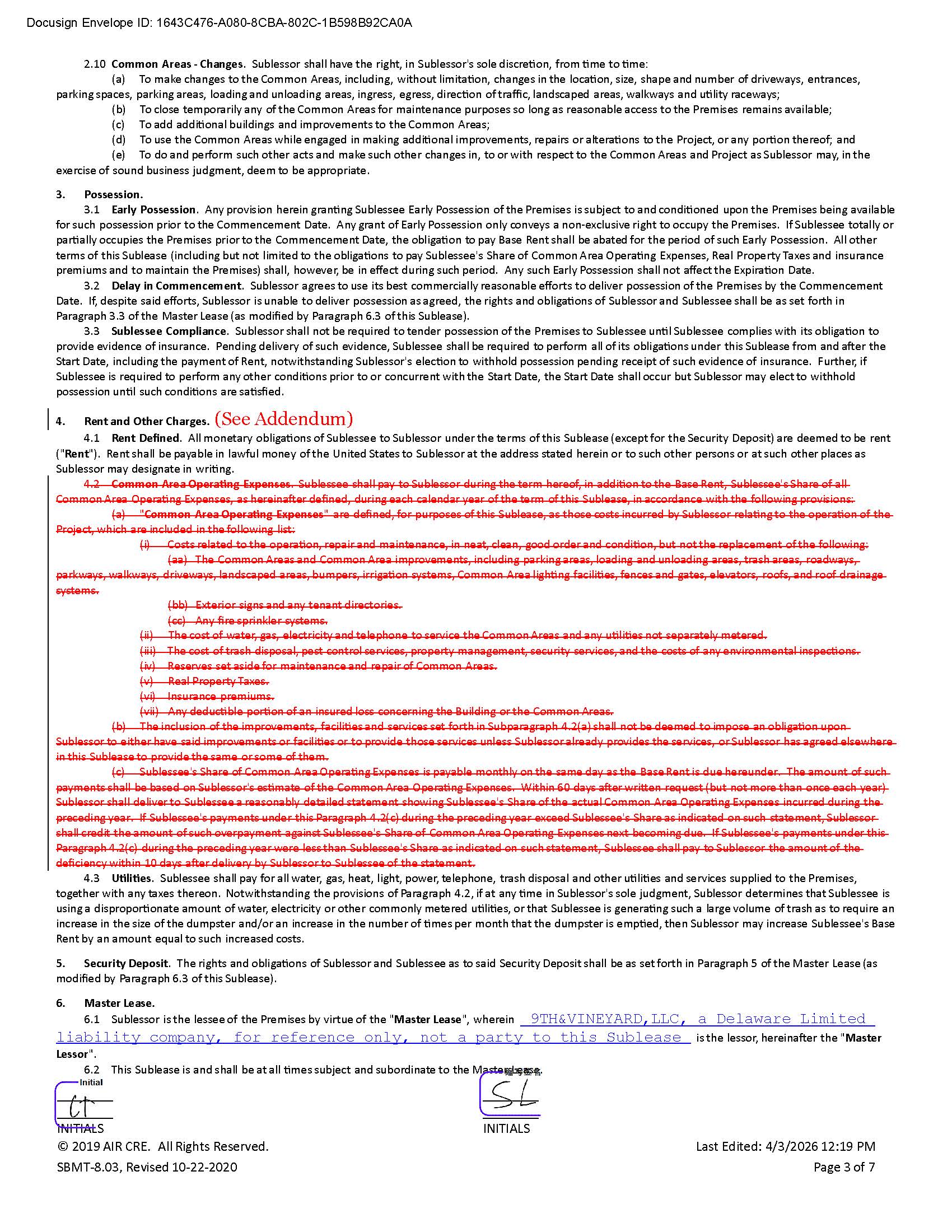 Docusign Envelope ID: 1643C476 - A080 - 8CBA - 802C - 1B598B92CA0A 2.10 Common Areas - Changes . Sublessor shall have the right, in Sublessor's sole discretion, from time to time: (a) To make changes to the Common Areas, including, without limitation, changes in the location, size, shape and number of driveways, entrances, parking spaces, parking areas, loading and unloading areas, ingress, egress, direction of traffic, landscaped areas, walkways and utility raceways; (b) To close temporarily any of the Common Areas for maintenance purposes so long as reasonable access to the Premises remains available; (c) To add additional buildings and improvements to the Common Areas; (d) To use the Common Areas while engaged in making additional improvements, repairs or alterations to the Project, or any portion thereof; and (e) To do and perform such other acts and make such other changes in, to or with respect to the Common Areas and Project as Sublessor may, in the exercise of sound business judgment, deem to be appropriate. 3. Possession. 1. Early Possession . Any provision herein granting Sublessee Early Possession of the Premises is subject to and conditioned upon the Premises being available for such possession prior to the Commencement Date. Any grant of Early Possession only conveys a non - exclusive right to occupy the Premises. If Sublessee totally or partially occupies the Premises prior to the Commencement Date, the obligation to pay Base Rent shall be abated for the period of such Early Possession. All other terms of this Sublease (including but not limited to the obligations to pay Sublessee's Share of Common Area Operating Expenses, Real Property Taxes and insurance premiums and to maintain the Premises) shall, however, be in effect during such period. Any such Early Possession shall not affect the Expiration Date. 2. Delay in Commencement . Sublessor agrees to use its best commercially reasonable efforts to deliver possession of the Premises by the Commencement Date. If, despite said efforts, Sublessor is unable to deliver possession as agreed, the rights and obligations of Sublessor and Sublessee shall be as set forth in Paragraph 3.3 of the Master Lease (as modified by Paragraph 6.3 of this Sublease). 3. Sublessee Compliance . Sublessor shall not be required to tender possession of the Premises to Sublessee until Sublessee complies with its obligation to provide evidence of insurance. Pending delivery of such evidence, Sublessee shall be required to perform all of its obligations under this Sublease from and after the Start Date, including the payment of Rent, notwithstanding Sublessor's election to withhold possession pending receipt of such evidence of insurance. Further, if Sublessee is required to perform any other conditions prior to or concurrent with the Start Date, the Start Date shall occur but Sublessor may elect to withhold possession until such conditions are satisfied. 4. Rent and Other Charges. (See Addendum) 1. Rent Defined . All monetary obligations of Sublessee to Sublessor under the terms of this Sublease (except for the Security Deposit) are deemed to be rent (" Rent "). Rent shall be payable in lawful money of the United States to Sublessor at the address stated herein or to such other persons or at such other places as Sublessor may designate in writing. 2. Common Area Operating Expenses . Sublessee shall pay to Sublessor during the term hereof, in addition to the Base Rent, Sublessee's Share of all Common Area Operating Expenses, as hereinafter defined, during each calendar year of the term of this Sublease, in accordance with the following provisions: (a) " Common Area Operating Expenses " are defined, for purposes of this Sublease, as those costs incurred by Sublessor relating to the operation of the Project, which are included in the following list: (i) Costs related to the operation, repair and maintenance, in neat, clean, good order and condition, but not the replacement of the following : (aa) The Common Areas and Common Area improvements, including parking areas, loading and unloading areas, trash areas, roadways, parkways, walkways, driveways, landscaped areas, bumpers, irrigation systems, Common Area lighting facilities, fences and gates, elevators, roofs, and roof drainage systems. (bb) Exterior signs and any tenant directories. (cc) Any fire sprinkler systems . (ii) The cost of water, gas, electricity and telephone to service the Common Areas and any utilities not separately metered . (iii) The cost of trash disposal, pest control services, property management, security services, and the costs of any environmental inspections. (iv) Reserves set aside for maintenance and repair of Common Areas . (v) Real Property Taxes. (vi) Insurance premiums . (vii) Any deductible portion of an insured loss concerning the Building or the Common Areas. (b) The inclusion of the improvements, facilities and services set forth in Subparagraph 4.2(a) shall not be deemed to impose an obligation upon Sublessor to either have said improvements or facilities or to provide those services unless Sublessor already provides the services, or Sublessor has agreed elsewhere in this Sublease to provide the same or some of them . (c) Sublessee's Share of Common Area Operating Expenses is payable monthly on the same day as the Base Rent is due hereunder. The amount of such payments shall be based on Sublessor's estimate of the Common Area Operating Expenses. Within 60 days after written request (but not more than once each year) Sublessor shall deliver to Sublessee a reasonably detailed statement showing Sublessee's Share of the actual Common Area Operating Expenses incurred during the preceding year. If Sublessee's payments under this Paragraph 4.2(c) during the preceding year exceed Sublessee's Share as indicated on such statement, Sublessor shall credit the amount of such overpayment against Sublessee's Share of Common Area Operating Expenses next becoming due. If Sublessee's pay
