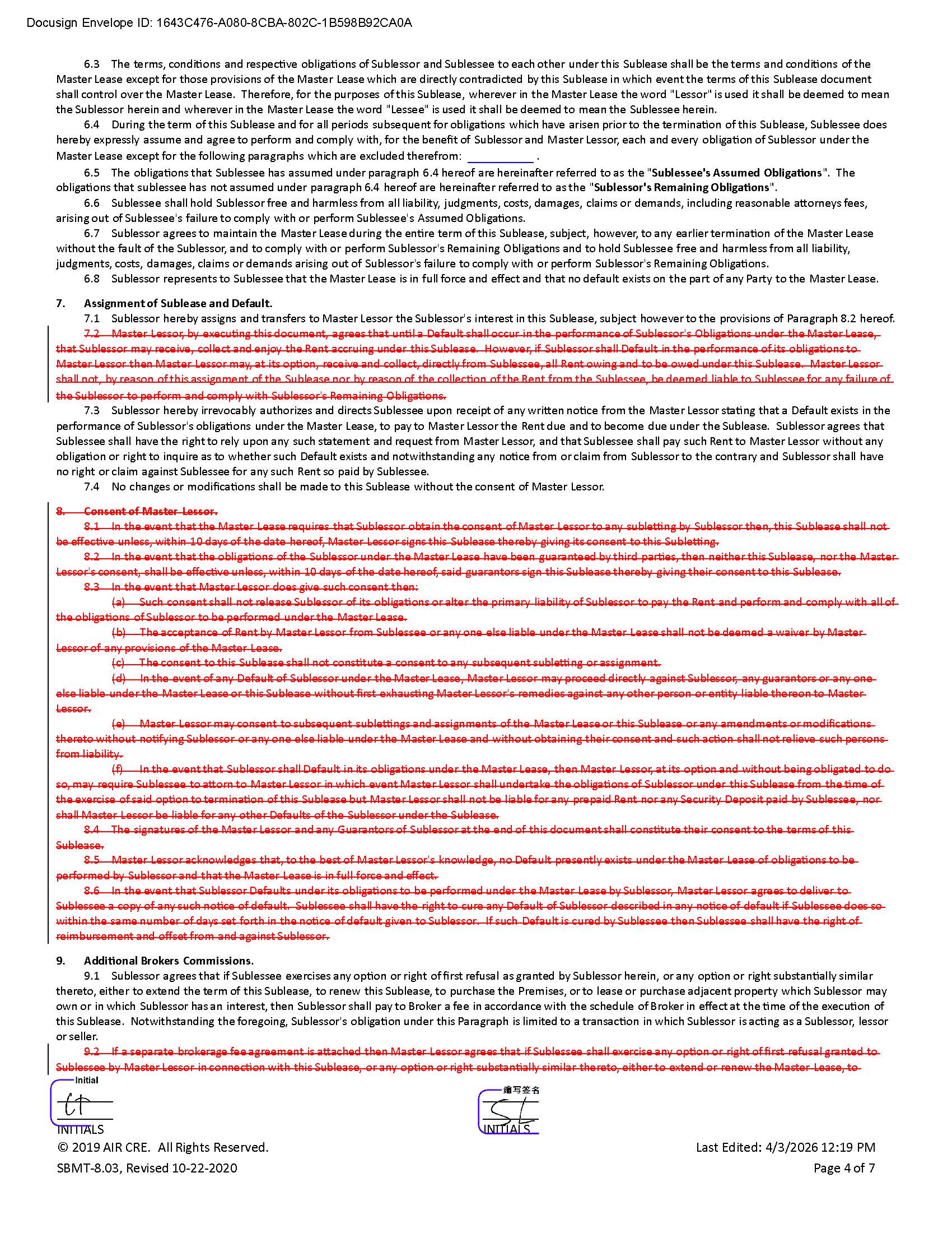 Docusign Envelope ID: 1643C476 - A080 - 8CBA - 802C - 1B598B92CA0A 3. The terms, conditions and respective obligations of Sublessor and Sublessee to each other under this Sublease shall be the terms and conditions of the Master Lease except for those provisions of the Master Lease which are directly contradicted by this Sublease in which event the terms of this Sublease document shall control over the Master Lease. Therefore, for the purposes of this Sublease, wherever in the Master Lease the word "Lessor" is used it shall be deemed to mean the Sublessor herein and wherever in the Master Lease the word "Lessee" is used it shall be deemed to mean the Sublessee herein. 4. During the term of this Sublease and for all periods subsequent for obligations which have arisen prior to the termination of this Sublease, Sublessee does hereby expressly assume and agree to perform and comply with, for the benefit of Sublessor and Master Lessor, each and every obligation of Sublessor under the Master Lease except for the following paragraphs which are excluded therefrom: . 5. The obligations that Sublessee has assumed under paragraph 6.4 hereof are hereinafter referred to as the " Sublessee's Assumed Obligations ". The obligations that sublessee has not assumed under paragraph 6.4 hereof are hereinafter referred to as the " Sublessor's Remaining Obligations ". 6. Sublessee shall hold Sublessor free and harmless from all liability, judgments, costs, damages, claims or demands, including reasonable attorneys fees, arising out of Sublessee's failure to comply with or perform Sublessee's Assumed Obligations. 7. Sublessor agrees to maintain the Master Lease during the entire term of this Sublease, subject, however, to any earlier termination of the Master Lease without the fault of the Sublessor, and to comply with or perform Sublessor's Remaining Obligations and to hold Sublessee free and harmless from all liability, judgments, costs, damages, claims or demands arising out of Sublessor's failure to comply with or perform Sublessor's Remaining Obligations. 8. Sublessor represents to Sublessee that the Master Lease is in full force and effect and that no default exists on the part of any Party to the Master Lease. 7. Assignment of Sublease and Default. 1. Sublessor hereby assigns and transfers to Master Lessor the Sublessor's interest in this Sublease, subject however to the provisions of Paragraph 8.2 hereof. 2. Master Lessor, by executing this document, agrees that until a Default shall occur in the performance of Sublessor's Obligations under the Master Lease, that Sublessor may receive, collect and enjoy the Rent accruing under this Sublease. However, if Sublessor shall Default in the performance of its obligations to Master Lessor then Master Lessor may, at its option, receive and collect, directly from Sublessee, all Rent owing and to be owed under this Sublease. Master Lessor shall not, by reason of this assignment of the Sublease nor by reason of the collection of the Rent from the Sublessee, be deemed liable to Sublessee for any failure of the Sublessor to perform and comply with Sublessor's Remaining Obligations . 3. Sublessor hereby irrevocably authorizes and directs Sublessee upon receipt of any written notice from the Master Lessor stating that a Default exists in the performance of Sublessor's obligations under the Master Lease, to pay to Master Lessor the Rent due and to become due under the Sublease. Sublessor agrees that Sublessee shall have the right to rely upon any such statement and request from Master Lessor, and that Sublessee shall pay such Rent to Master Lessor without any obligation or right to inquire as to whether such Default exists and notwithstanding any notice from or claim from Sublessor to the contrary and Sublessor shall have no right or claim against Sublessee for any such Rent so paid by Sublessee. 4. No changes or modifications shall be made to this Sublease without the consent of Master Lessor. 7. Consent of Master Lessor. 1. In the event that the Master Lease requires that Sublessor obtain the consent of Master Lessor to any subletting by Sublessor then, this Sublease shall not be effective unless, within 10 days of the date hereof, Master Lessor signs this Sublease thereby giving its consent to this Subletting . 2. In the event that the obligations of the Sublessor under the Master Lease have been guaranteed by third parties, then neither this Sublease, nor the Master Lessor's consent, shall be effective unless, within 10 days of the date hereof, said guarantors sign this Sublease thereby giving their consent to this Sublease . 3. In the event that Master Lessor does give such consent then : (a) Such consent shall not release Sublessor of its obligations or alter the primary liability of Sublessor to pay the Rent and perform and comply with all of the obligations of Sublessor to be performed under the Master Lease. (b) The acceptance of Rent by Master Lessor from Sublessee or any one else liable under the Master Lease shall not be deemed a waiver by Master Lessor of any provisions of the Master Lease . (c) The consent to this Sublease shall not constitute a consent to any subsequent subletting or assignment. (d) In the event of any Default of Sublessor under the Master Lease, Master Lessor may proceed directly against Sublessor, any guarantors or any one else liable under the Master Lease or this Sublease without first exhausting Master Lessor's remedies against any other person or entity liable thereon to Master Lessor. (e) Master Lessor may consent to subsequent sublettings and assignments of the Master Lease or this Sublease or any amendments or modifications thereto without notifying Sublessor or any one else liable under the Master Lease and without obtaining their consent and such action shall not relieve such persons from liability. (f) In the event that Sublessor shall Default in its obligations under the Master Lease, then Master Lessor, at its option and wit