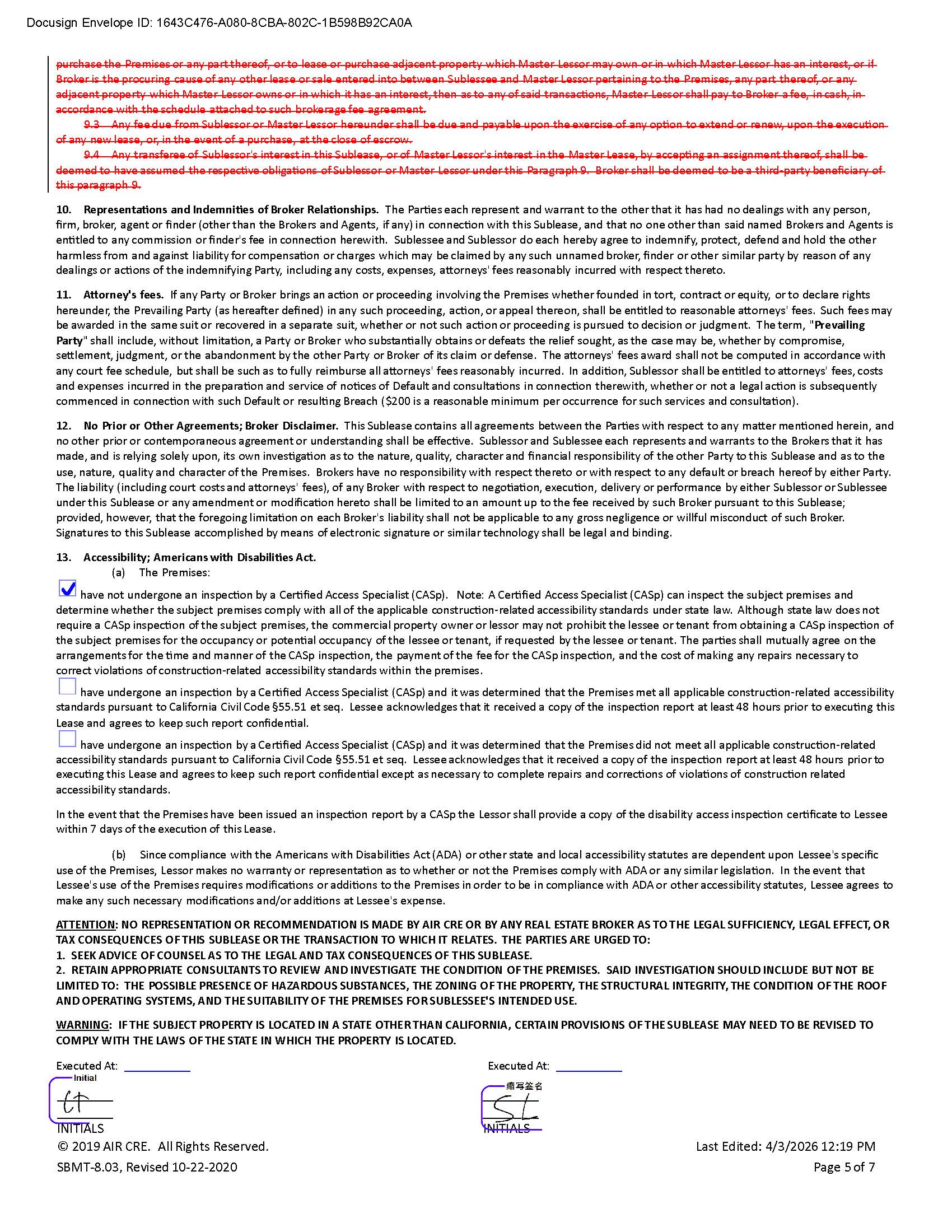 Docusign Envelope ID: 1643C476 - A080 - 8CBA - 802C - 1B598B92CA0A purchase the Premises or any part thereof, or to lease or purchase adjacent property which Master Lessor may own or in which Master Lessor has an interest, or if Broker is the procuring cause of any other lease or sale entered into between Sublessee and Master Lessor pertaining to the Premises, any part thereof, or any adjacent property which Master Lessor owns or in which it has an interest, then as to any of said transactions, Master Lessor shall pay to Broker a fee, in cash, in accordance with the schedule attached to such brokerage fee agreement . 3. Any fee due from Sublessor or Master Lessor hereunder shall be due and payable upon the exercise of any option to extend or renew, upon the execution of any new lease, or, in the event of a purchase, at the close of escrow. 4. Any transferee of Sublessor's interest in this Sublease, or of Master Lessor's interest in the Master Lease, by accepting an assignment thereof, shall be deemed to have assumed the respective obligations of Sublessor or Master Lessor under this Paragraph 9. Broker shall be deemed to be a third - party beneficiary of this paragraph 9 . 10. Representations and Indemnities of Broker Relationships. The Parties each represent and warrant to the other that it has had no dealings with any person, firm, broker, agent or finder (other than the Brokers and Agents, if any) in connection with this Sublease, and that no one other than said named Brokers and Agents is entitled to any commission or finder's fee in connection herewith. Sublessee and Sublessor do each hereby agree to indemnify, protect, defend and hold the other harmless from and against liability for compensation or charges which may be claimed by any such unnamed broker, finder or other similar party by reason of any dealings or actions of the indemnifying Party, including any costs, expenses, attorneys' fees reasonably incurred with respect thereto. 11. Attorney's fees. If any Party or Broker brings an action or proceeding involving the Premises whether founded in tort, contract or equity, or to declare rights hereunder, the Prevailing Party (as hereafter defined) in any such proceeding, action, or appeal thereon, shall be entitled to reasonable attorneys' fees. Such fees may be awarded in the same suit or recovered in a separate suit, whether or not such action or proceeding is pursued to decision or judgment. The term, " Prevailing Party " shall include, without limitation, a Party or Broker who substantially obtains or defeats the relief sought, as the case may be, whether by compromise, settlement, judgment, or the abandonment by the other Party or Broker of its claim or defense. The attorneys' fees award shall not be computed in accordance with any court fee schedule, but shall be such as to fully reimburse all attorneys' fees reasonably incurred. In addition, Sublessor shall be entitled to attorneys' fees, costs and expenses incurred in the preparation and service of notices of Default and consultations in connection therewith, whether or not a legal action is subsequently commenced in connection with such Default or resulting Breach ($200 is a reasonable minimum per occurrence for such services and consultation). 12. No Prior or Other Agreements; Broker Disclaimer. This Sublease contains all agreements between the Parties with respect to any matter mentioned herein, and no other prior or contemporaneous agreement or understanding shall be effective. Sublessor and Sublessee each represents and warrants to the Brokers that it has made, and is relying solely upon, its own investigation as to the nature, quality, character and financial responsibility of the other Party to this Sublease and as to the use, nature, quality and character of the Premises. Brokers have no responsibility with respect thereto or with respect to any default or breach hereof by either Party. The liability (including court costs and attorneys' fees), of any Broker with respect to negotiation, execution, delivery or performance by either Sublessor or Sublessee under this Sublease or any amendment or modification hereto shall be limited to an amount up to the fee received by such Broker pursuant to this Sublease; provided, however, that the foregoing limitation on each Broker's liability shall not be applicable to any gross negligence or willful misconduct of such Broker. Signatures to this Sublease accomplished by means of electronic signature or similar technology shall be legal and binding. 13. Accessibility; Americans with Disabilities Act. (a) The Premises: have not undergone an inspection by a Certified Access Specialist (CASp). Note: A Certified Access Specialist (CASp) can inspect the subject premises and determine whether the subject premises comply with all of the applicable construction - related accessibility standards under state law. Although state law does not require a CASp inspection of the subject premises, the commercial property owner or lessor may not prohibit the lessee or tenant from obtaining a CASp inspection of the subject premises for the occupancy or potential occupancy of the lessee or tenant, if requested by the lessee or tenant. The parties shall mutually agree on the arrangements for the time and manner of the CASp inspection, the payment of the fee for the CASp inspection, and the cost of making any repairs necessary to correct violations of construction - related accessibility standards within the premises. have undergone an inspection by a Certified Access Specialist (CASp) and it was determined that the Premises met all applicable construction - related accessibility standards pursuant to California Civil Code Α 55 . 51 et seq . Lessee acknowledges that it received a copy of the inspection report at least 4 8 hours prior to executing this Lease and agrees to keep such report confidential . have undergone an inspection by a Certified Access Specialist (CASp) and it was determined that t