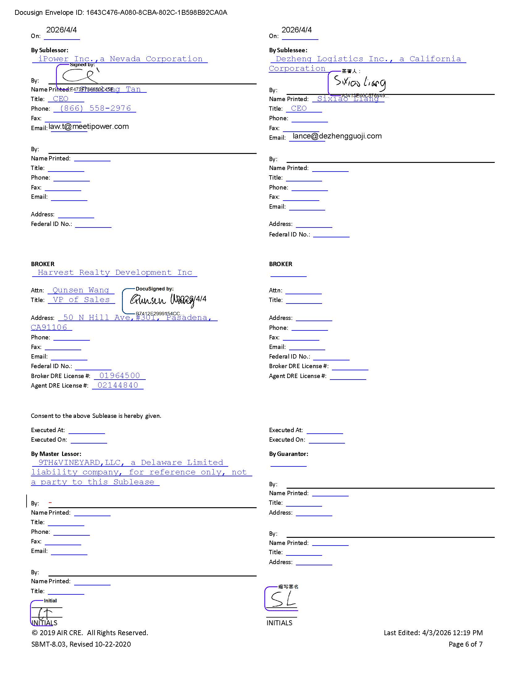 ________ 2026/4/4 On: By Sublessor: iPower Inc.,a Nevada Corporation Chenlon By: Name Printed: Title: Phone: Fax: Email: Address: Federal ID No.: 2026/4/4 On: By Sublessee: Dezheng Logistics Inc., a California Corporation By: Name Printed: Sixiao Liang Title: CEO Phone: Fax: Email: By: Name Printed: Title: Phone: Fax: Email: Address: Federal ID No.: BROKER Harvest Realty Development Inc Attn: Qunsen Wang BROKER Title: VP of Sales Address: 50 N Hill Ave,#301, Pasadena, CA91106 Phone: Fax: Email: Federal ID No.: Broker DRE License #: 01964500 Agent DRE License #: 02144840 Attn: Title: Address: Phone: Fax: Email: Federal ID No.: Broker DRE License #: Agent DRE License #: Consent to the above Sublease is hereby given. Executed At: Executed On: By Master Lessor: 9TH&VINEYARD,LLC, a Delaware Limited liability company, for reference only, not a party to this Sublease By Guarantor: By: Name Printed: Title: Phone: Fax: Email: By: Name Printed: Title: Executed At: Executed On: By: Name Printed: Title: Address: By: Name Printed: Title: Address: Docusign Envelope ID: 1643C476 - A080 - 8CBA - 802C - 1B598B92CA0A lance@dezhengguoji.com 2026/4/4 By: Name Printed: g Tan Title: CEO Phone: (866) 558 - 2976 Fax: Email: law.t@meetipower.com INITIALS © 2019 AIR CRE. All Rights Reserved. SBMT - 8.03, Revised 10 - 22 - 2020 INITIALS Last Edited: 4/3/2026 12:19 PM Page 6 of 7