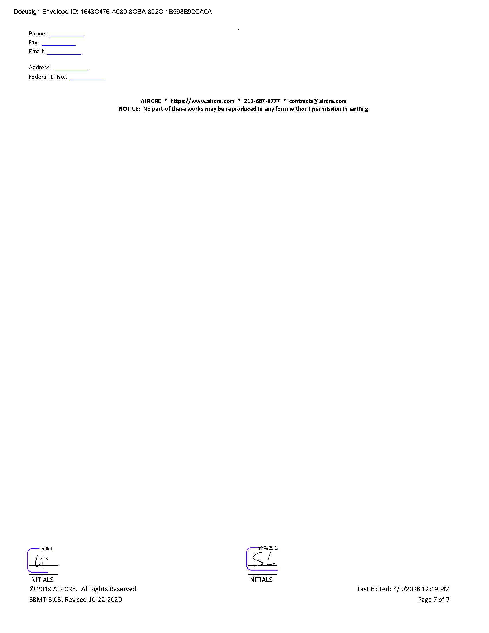 Docusign Envelope ID: 1643C476 - A080 - 8CBA - 802C - 1B598B92CA0A Phone: Fax: Email: Address: Federal ID No.: AIR CRE * https://www.aircre.com * 213 - 687 - 8777 * contracts@aircre.com NOTICE: No part of these works may be reproduced in any form without permission in writing. INITIALS © 2019 AIR CRE. All Rights Reserved. SBMT - 8.03, Revised 10 - 22 - 2020 INITIALS Last Edited: 4/3/2026 12:19 PM Page 7 of 7
