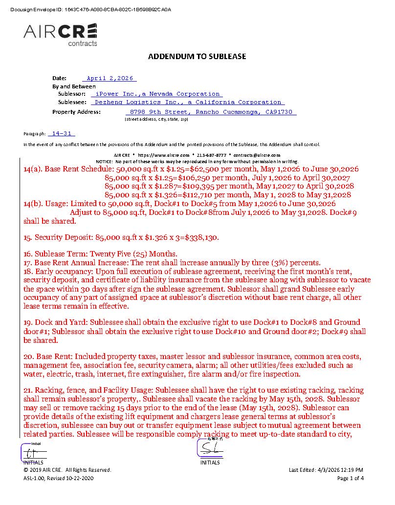 ADDENDUM TO SUBLEASE Date: April 2,2026 By and Between Sublessor: iPower Inc.,a Nevada Corporation Sublessee: Dezheng Logistics Inc., a California Corporation Property Address: 8798 9th Street, Rancho Cucamonga, CA91730 (street address, city, state, zip) Paragraph: 14 - 31 In the event of any conflict between the provisions of this Addendum and the printed provisions of the Sublease, this Addendum shall control. AIR CRE * https://www.aircre.com * 213 - 687 - 8777 * contracts@aircre.com NOTICE: No part of these works may be reproduced in any form without permission in writing. (a) Base Rent Schedule: 50,000 sq.ft x $1.25=$62,500 per month, May 1,2026 to June 30,2026 85,000 sq.ft x $1.25=$106,250 per month, July 1,2026 to April 30,2027 85,000 sq.ft x $1.287=$109,395 per month, May 1,2027 to April 30,2028 85,000 sq.ft x $1.326=$112,710 per month, May 1, 2028 to May 31,2028 (b) Usage: Limited to 50,000 sq.ft, Dock#1 to Dock#5 from May 1,2026 to June 30,2026 Adjust to 85,000 sq.ft, Dock#1 to Dock#8from July 1,2026 to May 31,2028. Dock#9 shall be shared. 15. Security Deposit: 85,000 sq.ft x $1.326 x 3=$338,130. 16. Sublease Term: Twenty Five (25) Months. 17. Base Rent Annual Increase: The rent shall increase annually by three (3%) percents. 18. Early occupancy: Upon full execution of sublease agreement, receiving the first month's rent, security deposit, and certificate of liability insurance from the sublessee along with sublessor to vacate the space within 30 days after sign the sublease agreement. Sublessor shall grand Sublessee early occupancy of any part of assigned space at sublessor's discretion without base rent charge, all other lease terms remain in effective. 19. Dock and Yard: Sublessee shall obtain the exclusive right to use Dock#1 to Dock#8 and Ground door#1; Sublessor shall obtain the exclusive right to use Dock#10 and Ground door#2; Dock#9 shall be shared. 20. Base Rent: Included property taxes, master lessor and sublessor insurance, common area costs, management fee, association fee, security camera, alarm; all other utilities/fees excluded such as water, electric, trash, internet, fire extinguisher, fire alarm and/or fire inspection. 21. Racking, fence, and Facility Usage: Sublessee shall have the right to use existing racking, racking shall remain sublessor’s property,. Sublessee shall vacate the racking by May 15th, 2028. Sublessor may sell or remove racking 15 days prior to the end of the lease (May 15th, 2028). Sublessor can provide details of the existing lift equipment and chargers lease general terms at sublessor’s discretion, sublessee can buy out or transfer equipment lease subject to mutual agreement between related parties. Sublessee will be responsible comply racking to meet up - to - date standard to city, Docusign Envelope ID: 1643C476 - A080 - 8CBA - 802C - 1B598B92CA0A INITIALS © 2019 AIR CRE. All Rights Reserved. ASL - 1.00, Revised 10 - 22 - 2020 INITIALS Last Edited: 4/3/2026 12:19 PM Page 1 of 4