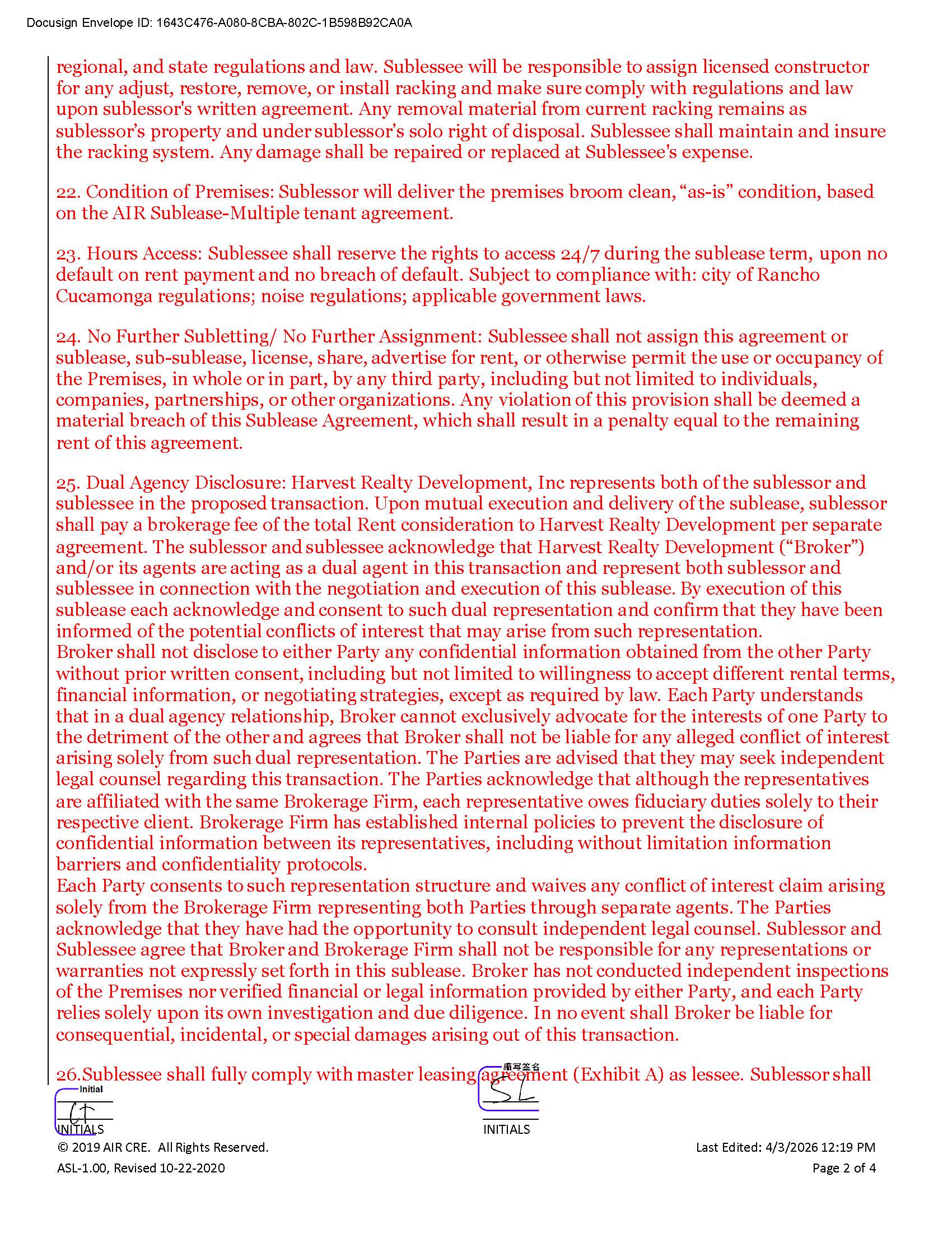 regional, and state regulations and law. Sublessee will be responsible to assign licensed constructor for any adjust, restore, remove, or install racking and make sure comply with regulations and law upon sublessor's written agreement. Any removal material from current racking remains as sublessor’s property and under sublessor’s solo right of disposal. Sublessee shall maintain and insure the racking system. Any damage shall be repaired or replaced at Sublessee's expense. 22. Condition of Premises: Sublessor will deliver the premises broom clean, “as - is” condition, based on the AIR Sublease - Multiple tenant agreement. 23. Hours Access: Sublessee shall reserve the rights to access 24/7 during the sublease term, upon no default on rent payment and no breach of default. Subject to compliance with: city of Rancho Cucamonga regulations; noise regulations; applicable government laws. 24. No Further Subletting/ No Further Assignment: Sublessee shall not assign this agreement or sublease, sub - sublease, license, share, advertise for rent, or otherwise permit the use or occupancy of the Premises, in whole or in part, by any third party, including but not limited to individuals, companies, partnerships, or other organizations. Any violation of this provision shall be deemed a material breach of this Sublease Agreement, which shall result in a penalty equal to the remaining rent of this agreement. 25. Dual Agency Disclosure: Harvest Realty Development, Inc represents both of the sublessor and sublessee in the proposed transaction. Upon mutual execution and delivery of the sublease, sublessor shall pay a brokerage fee of the total Rent consideration to Harvest Realty Development per separate agreement. The sublessor and sublessee acknowledge that Harvest Realty Development (“Broker”) and/or its agents are acting as a dual agent in this transaction and represent both sublessor and sublessee in connection with the negotiation and execution of this sublease. By execution of this sublease each acknowledge and consent to such dual representation and confirm that they have been informed of the potential conflicts of interest that may arise from such representation. Broker shall not disclose to either Party any confidential information obtained from the other Party without prior written consent, including but not limited to willingness to accept different rental terms, financial information, or negotiating strategies, except as required by law. Each Party understands that in a dual agency relationship, Broker cannot exclusively advocate for the interests of one Party to the detriment of the other and agrees that Broker shall not be liable for any alleged conflict of interest arising solely from such dual representation. The Parties are advised that they may seek independent legal counsel regarding this transaction. The Parties acknowledge that although the representatives are affiliated with the same Brokerage Firm, each representative owes fiduciary duties solely to their respective client. Brokerage Firm has established internal policies to prevent the disclosure of confidential information between its representatives, including without limitation information barriers and confidentiality protocols. Each Party consents to such representation structure and waives any conflict of interest claim arising solely from the Brokerage Firm representing both Parties through separate agents. The Parties acknowledge that they have had the opportunity to consult independent legal counsel. Sublessor and Sublessee agree that Broker and Brokerage Firm shall not be responsible for any representations or warranties not expressly set forth in this sublease. Broker has not conducted independent inspections of the Premises nor verified financial or legal information provided by either Party, and each Party relies solely upon its own investigation and due diligence. In no event shall Broker be liable for consequential, incidental, or special damages arising out of this transaction. 26. Sublessee shall fully comply with master leasing agreement (Exhibit A) as lessee. Sublessor shall Docusign Envelope ID: 1643C476 - A080 - 8CBA - 802C - 1B598B92CA0A INITIALS © 2019 AIR CRE. All Rights Reserved. ASL - 1.00, Revised 10 - 22 - 2020 INITIALS Last Edited: 4/3/2026 12:19 PM Page 2 of 4