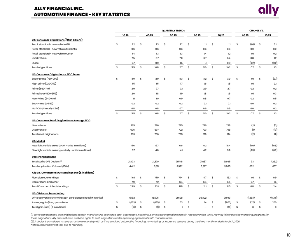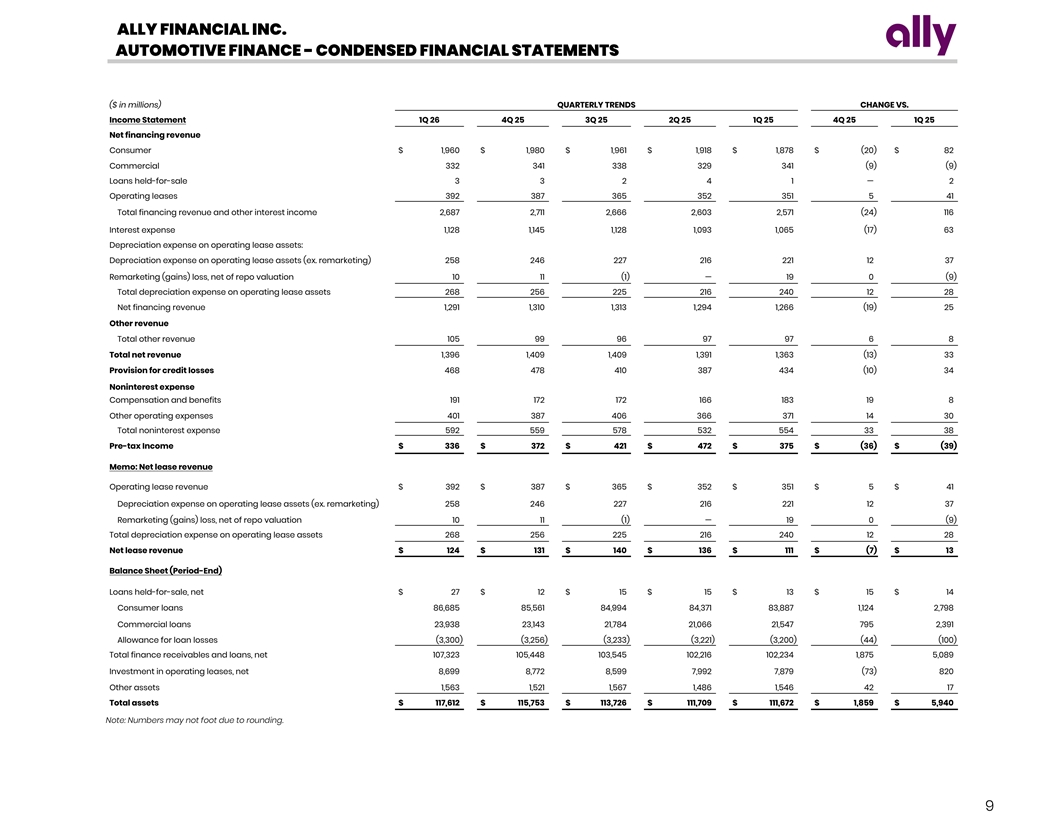ALLY FINANCIAL INC. AUTOMOTIVE FINANCE - CONDENSED FINANCIAL STATEMENTS ($ in millions) QUARTERLY TRENDS CHANGE VS. Income Statement 1Q 26 4Q 25 3Q 25 2Q 25 1Q 25 4Q 25 1Q 25 Net financing revenue Consumer $ 1,960 $ 1,980 $ 1,961 $ 1,918 $ 1,878 $ (20) $ 82 Commercial 332 341 338 329 341 (9) (9) Loans held-for-sale 3 3 2 4 1 — 2 Operating leases 392 387 365 352 351 5 41 Total financing revenue and other interest income 2,687 2,711 2,666 2,603 2,571 (24) 116 Interest expense 1,128 1,145 1,128 1,093 1,065 (17) 63 Depreciation expense on operating lease assets: Depreciation expense on operating lease assets (ex. remarketing) 258 246 227 216 221 12 37 Remarketing (gains) loss, net of repo valuation 10 11 (1) — 19 0 (9) Total depreciation expense on operating lease assets 268 256 225 216 240 12 28 Net financing revenue 1,291 1,310 1,313 1,294 1,266 (19) 25 Other revenue Total other revenue 105 99 96 97 97 6 8 Total net revenue 1,396 1,409 1,409 1,391 1,363 (13) 33 Provision for credit losses 468 478 410 387 434 (10) 34 Noninterest expense Compensation and benefits 191 172 172 166 183 19 8 Other operating expenses 401 387 406 366 371 14 30 Total noninterest expense 592 559 578 532 554 33 38 Pre-tax Income $ 336 $ 372 $ 421 $ 472 $ 375 $ (36) $ (39) Memo: Net lease revenue Operating lease revenue $ 392 $ 387 $ 365 $ 352 $ 351 $ 5 $ 41 Depreciation expense on operating lease assets (ex. remarketing) 258 246 227 216 221 12 37 Remarketing (gains) loss, net of repo valuation 10 11 (1) — 19 0 (9) Total depreciation expense on operating lease assets 268 256 225 216 240 12 28 Net lease revenue $ 124 $ 131 $ 140 $ 136 $ 111 $ (7) $ 13 Balance Sheet (Period-End) Loans held-for-sale, net $ 27 $ 12 $ 15 $ 15 $ 13 $ 15 $ 14 Consumer loans 86,685 85,561 84,994 84,371 83,887 1,124 2,798 Commercial loans 23,938 23,143 21,784 21,066 21,547 795 2,391 Allowance for loan losses (3,300) (3,256) (3,233) (3,221) (3,200) (44) (100) Total finance receivables and loans, net 107,323 105,448 103,545 102,216 102,234 1,875 5,089 Investment in operating leases, net 8,699 8,772 8,599 7,992 7,879 (73) 820 Other assets 1,563 1,521 1,567 1,486 1,546 42 17 Total assets $ 117,612 $ 115,753 $ 113,726 $ 111,709 $ 111,672 $ 1,859 $ 5,940 Note: Numbers may not foot due to rounding. 9