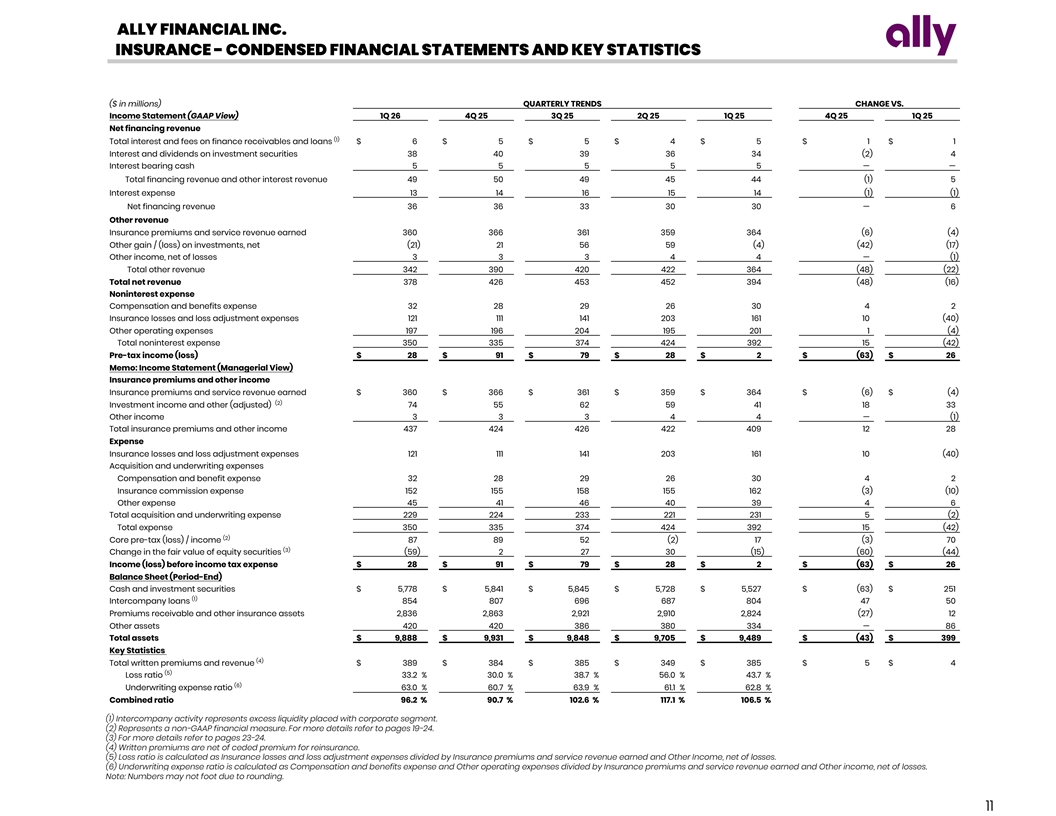 ALLY FINANCIAL INC. INSURANCE - CONDENSED FINANCIAL STATEMENTS AND KEY STATISTICS ($ in millions) QUARTERLY TRENDS CHANGE VS. Income Statement (GAAP View) 1Q 26 4Q 25 3Q 25 2Q 25 1Q 25 4Q 25 1Q 25 Net financing revenue (1) Total interest and fees on finance receivables and loans $ 6 $ 5 $ 5 $ 4 $ 5 $ 1 $ 1 Interest and dividends on investment securities 38 40 39 36 34 (2) 4 Interest bearing cash 5 5 5 5 5 — — Total financing revenue and other interest revenue 49 50 49 45 44 (1) 5 Interest expense 13 14 16 15 14 (1) (1) Net financing revenue 36 36 33 30 30 — 6 Other revenue Insurance premiums and service revenue earned 360 366 361 359 364 (6) (4) Other gain / (loss) on investments, net (21) 21 56 59 (4) (42) (17) Other income, net of losses 3 3 3 4 4 — (1) Total other revenue 342 390 420 422 364 (48) (22) Total net revenue 378 426 453 452 394 (48) (16) Noninterest expense Compensation and benefits expense 32 28 29 26 30 4 2 Insurance losses and loss adjustment expenses 121 111 141 203 161 10 (40) Other operating expenses 197 196 204 195 201 1 (4) Total noninterest expense 350 335 374 424 392 15 (42) Pre-tax income (loss) $ 28 $ 91 $ 79 $ 28 $ 2 $ (63) $ 26 Memo: Income Statement (Managerial View) Insurance premiums and other income Insurance premiums and service revenue earned $ 360 $ 366 $ 361 $ 359 $ 364 $ (6) $ (4) (2) Investment income and other (adjusted) 74 55 62 59 41 18 33 Other income 3 3 3 4 4 — (1) Total insurance premiums and other income 437 424 426 422 409 12 28 Expense Insurance losses and loss adjustment expenses 121 111 141 203 161 10 (40) Acquisition and underwriting expenses Compensation and benefit expense 32 28 29 26 30 4 2 Insurance commission expense 152 155 158 155 162 (3) (10) Other expense 45 41 46 40 39 4 6 Total acquisition and underwriting expense 229 224 233 221 231 5 (2) Total expense 350 335 374 424 392 15 (42) (2) Core pre-tax (loss) / income 87 89 52 (2) 17 (3) 70 (3) Change in the fair value of equity securities (59) 2 27 30 (15) (60) (44) Income (loss) before income tax expense $ 28 $ 91 $ 79 $ 28 $ 2 $ (63) $ 26 Balance Sheet (Period-End) Cash and investment securities $ 5,778 $ 5,841 $ 5,845 $ 5,728 $ 5,527 $ (63) $ 251 (1) Intercompany loans 854 807 696 687 804 47 50 Premiums receivable and other insurance assets 2,836 2,863 2,921 2,910 2,824 (27) 12 Other assets 420 420 386 380 334 — 86 Total assets $ 9,888 $ 9,931 $ 9,848 $ 9,705 $ 9,489 $ (43) $ 399 Key Statistics (4) Total written premiums and revenue $ 389 $ 384 $ 385 $ 349 $ 385 $ 5 $ 4 (5) Loss ratio 33.2 % 30.0 % 38.7 % 56.0 % 4 3.7 % (6) Underwriting expense ratio 6 3.0 % 6 0.7 % 6 3.9 % 61.1 % 6 2.8 % Combined ratio 96.2 % 9 0.7 % 1 02.6 % 117.1 % 106.5 % (1) Intercompany activity represents excess liquidity placed with corporate segment. (2) Represents a non-GAAP financial measure. For more details refer to pages 19-24. (3) For more details refer to pages 23-24. (4) Written premiums are net of ceded premium for reinsurance. (5) Loss ratio is calculated as Insurance losses and loss adjustment expenses divided by Insurance premiums and service revenue earned and Other Income, net of losses. (6) Underwriting expense ratio is calculated as Compensation and benefits expense and Other operating expenses divided by Insurance premiums and service revenue earned and Other income, net of losses. Note: Numbers may not foot due to rounding. 11