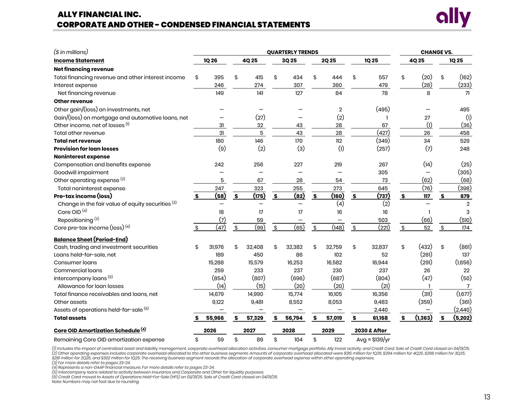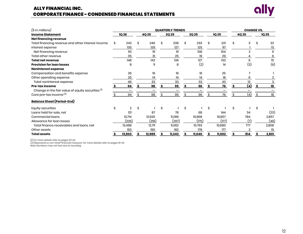 ALLY FINANCIAL INC. CORPORATE FINANCE - CONDENSED FINANCIAL STATEMENTS ($ in millions) QUARTERLY TRENDS CHANGE VS. Income Statement 1Q 26 4Q 25 3Q 25 2Q 25 1Q 25 4Q 25 1Q 25 Net financing revenue Total financing revenue and other interest income $ 243 $ 240 $ 238 $ 233 $ 221 $ 3 $ 22 Interest expense 130 129 127 125 117 1 13 Net financing revenue 113 111 111 108 104 2 9 Total other revenue 35 31 25 19 29 4 6 Total net revenue 148 142 136 127 133 6 15 Provision for loan losses 8 11 8 (2) 14 (3) (6) Noninterest expense Compensation and benefits expense 26 19 19 19 25 7 1 Other operating expense 20 14 14 14 18 6 2 Total noninterest expense 46 33 33 33 43 13 3 Pre-tax income $ 94 $ 98 $ 95 $ 96 $ 76 $ (4) $ 18 (1) Change in the fair value of equity securities — — — — — — — (2) Core pre-tax income $ 94 $ 98 $ 95 $ 96 $ 76 $ (4) $ 18 Balance Sheet (Period-End) Equity securities $ 2 $ 1 $ 1 $ 1 $ 1 $ 1 $ 1 Loans held for sale, net 121 87 78 68 144 34 (23) Commercial loans 13,714 12,930 11,289 10,968 10,857 784 2,857 Allowance for loan losses (226) (219) (207) (175) (177) (7) (49) Total finance receivables and loans, net 13,488 12,711 11,082 10,793 10,680 777 2,808 Other assets 192 190 182 178 177 2 15 Total assets $ 13,803 $ 12,989 $ 11,343 $ 11,040 $ 11,002 $ 814 $ 2,801 (1) For more details refer to pages 23-24. (2) Represents a non-GAAP financial measure. For more details refer to pages 19-24. Note: Numbers may not foot due to rounding. 12