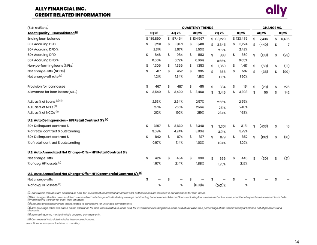 ALLY FINANCIAL INC. CORPORATE AND OTHER - CONDENSED FINANCIAL STATEMENTS ($ in millions) QUARTERLY TRENDS CHANGE VS. Income Statement 1Q 26 4Q 25 3Q 25 2Q 25 1Q 25 4Q 25 1Q 25 Net financing revenue Total financing revenue and other interest income $ 395 $ 415 $ 434 $ 444 $ 557 $ (20) $ (162) Interest expense 246 274 307 360 479 (28) (233) Net financing revenue 149 141 127 84 78 8 71 Other revenue Other gain/(loss) on investments, net — — — 2 (495) — 495 Gain/(loss) on mortgage and automotive loans, net — (27) — (2) 1 27 (1) (1) Other income, net of losses 31 32 43 28 67 (1) (36) Total other revenue 31 5 43 28 (427) 26 458 Total net revenue 180 146 170 112 (349) 34 529 Provision for loan losses (9) (2) (3) (1) (257) (7) 248 Noninterest expense Compensation and benefits expense 242 256 227 219 267 (14) (25) Goodwill impairment — — — — 305 — (305) (2) Other operating expense 5 67 28 54 73 (62) (68) Total noninterest expense 247 323 255 273 645 (76) (398) Pre-tax income (loss) $ (58) $ (175) $ (82) $ (160) $ (737) $ 117 $ 679 (3) Change in the fair value of equity securities — — — (4) (2) — 2 (4) Core OID 18 17 17 16 16 1 3 (3) Repositioning (7) 59 — — 503 (66) (510) (4) Core pre-tax income (loss) $ (47) $ (99) $ (65) $ (148) $ (221) $ 52 $ 174 Balance Sheet (Period-End) Cash, trading and investment securities $ 31,976 $ 32,408 $ 32,382 $ 32,759 $ 32,837 $ (432) $ (861) Loans held-for-sale, net 189 450 86 102 52 (261) 137 Consumer loans 15,288 15,579 16,253 16,582 16,944 (291) (1,656) Commercial loans 259 233 237 230 237 26 22 (5) Intercompany loans (854) (807) (696) (687) (804) (47) (50) Allowance for loan losses (14) (15) (20) (20) (21) 1 7 Total finance receivables and loans, net 14,679 14,990 15,774 16,105 16,356 (311) (1,677) Other assets 9,122 9,481 8,552 8,053 9,483 (359) (361) (6) Assets of operations held-for-sale — — — — 2,440 — (2,440) Total assets $ 55,966 $ 57,329 $ 56,794 $ 57,019 $ 61,168 $ (1,363) $ (5,202) (4) Core OID Amortization Schedule 2026 2027 2028 2029 2030 & After Remaining Core OID amortization expense $ 59 $ 89 $ 104 $ 122 Avg = $139/yr (1) Includes the impact of centralized asset and liability management, corporate overhead allocation activities, consumer mortgage portfolio, Ally Invest activity, and Credit Card. Sale of Credit Card closed on 04/01/25. (2) Other operating expenses includes corporate overhead allocated to the other business segments. Amounts of corporate overhead allocated were $315 million for 1Q26, $294 million for 4Q25, $298 million for 3Q25, $281 million for 2Q25, and $302 million for 1Q25. The receiving business segment records the allocation of corporate overhead expense within other operating expenses. (3) For more details refer to pages 23-24. (4) Represents a non-GAAP financial measure. For more details refer to pages 23-24. (5) Intercompany loans related to activity between Insurance and Corporate and Other for liquidity purposes. (6) Credit Card moved to Assets of Operations Held-For-Sale (HFS) on 03/31/25. Sale of Credit Card closed on 04/01/25. Note: Numbers may not foot due to rounding. 13