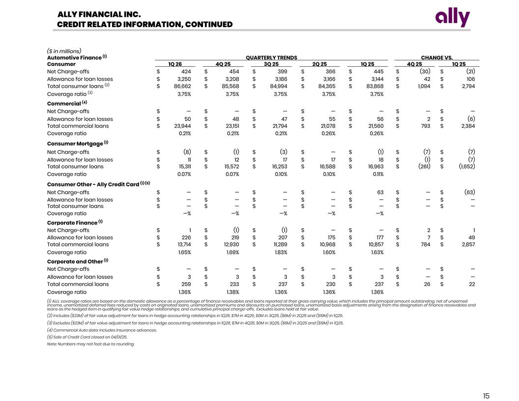 ALLY FINANCIAL INC. CREDIT RELATED INFORMATION ($ in millions) QUARTERLY TRENDS CHANGE VS. (1) Asset Quality - Consolidated 1Q 26 4Q 25 3Q 25 2Q 25 1Q 25 4Q 25 1Q 25 Ending loan balance $ 139,890 $ 137,454 $ 134,567 $ 133,485 $ 133,229 $ 2,436 $ 6,405 30+ Accruing DPD $ 3,231 $ 3,671 $ 3,401 $ 3,224 $ 3,345 $ (440) $ 7 30+ Accruing DPD % 2 .31% 2 .67% 2 .53% 2.42% 2.51 % 60+ Accruing DPD $ 846 $ 984 $ 883 $ 869 $ 883 $ (138) $ (23) 60+ Accruing DPD % 0.60% 0 .72% 0 .66% 0.65% 0 .66% Non-performing loans (NPLs) $ 1,306 $ 1,366 $ 1,353 $ 1,417 $ 1,359 $ (60) $ (111) Net charge-offs (NCOs) $ 417 $ 452 $ 395 $ 507 $ 366 $ (35) $ (90) (2) Net charge-off rate 1 .21 % 1.34% 1.18% 1 .50% 1.10% Provision for loan losses $ 467 $ 487 $ 415 $ 191 $ 384 $ (20) $ 276 Allowance for loan losses (ALLL) $ 3,540 $ 3,490 $ 3,460 $ 3,398 $ 3,416 $ 50 $ 142 (3) (4) ALLL as % of Loans 2 .53 % 2 .54% 2 .57 % 2 .55 % 2.56 % (3) ALLL as % of NPLs 271 % 2 55 % 256% 2 40% 251 % (3) ALLL as % of NCOs 2 12 % 1 92 % 2 19 % 1 68 % 234% (5) U.S. Auto Delinquencies - HFI Retail Contract $'s 30+ Delinquent contract $ $ 3,197 $ 3,630 $ 3,340 $ 3,181 $ 3,301 $ (433) $ 16 % of retail contract $ outstanding 3.69% 4 .24% 3 .93 % 3 .79 % 3 .91% 60+ Delinquent contract $ $ 842 $ 974 $ 877 $ 852 $ 879 $ (132) $ (10) % of retail contract $ outstanding 0 .97% 1.14% 1 .03 % 1 .02 % 1 .04% U.S. Auto Annualized Net Charge-Offs - HFI Retail Contract $'s Net charge-offs $ 424 $ 454 $ 399 $ 445 $ 366 $ (30) $ (21) (2) % of avg. HFI assets 1 .97% 2 .14 % 1 .88 % 2 .12 % 1 .75% (6) U.S. Auto Annualized Net Charge-Offs - HFI Commercial Contract $'s Net charge-offs $ — $ — $ — $ — $ — $ — $ — (2) % of avg. HFI assets — % —% ( 0.01)% — % (0.01) % (1) Loans within this table are classified as held-for-investment recorded at amortized cost as these loans are included in our allowance for loan losses. (2) Net charge-off ratios are calculated as annualized net charge-offs divided by average outstanding finance receivables and loans excluding loans measured at fair value, conditional repurchase loans and loans held- for-sale during the year for each loan category. (3) Excludes provision for credit losses related to our reserve for unfunded commitments. (4) ALLL coverage ratios are based on the allowance for loan losses related to loans held-for-investment excluding those loans held at fair value as a percentage of the unpaid principal balance, net of premiums and discounts. (5) Auto delinquency metrics include accruing contracts only. (6) Commercial Auto data includes Insurance advances. Note: Numbers may not foot due to rounding. 14
