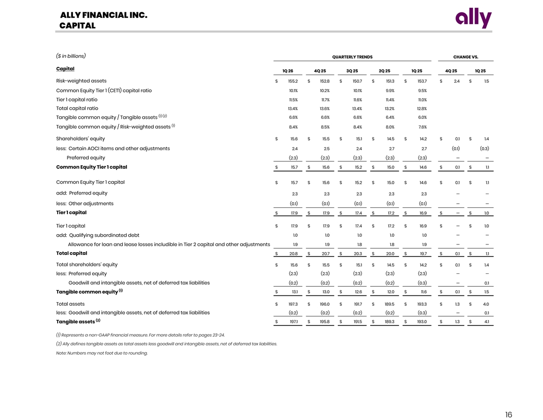ALLY FINANCIAL INC. CAPITAL ($ in billions) QUARTERLY TRENDS CHANGE VS. Capital 1Q 26 4Q 25 3Q 25 2Q 25 1Q 25 4Q 25 1Q 25 Risk-weighted assets $ 155.2 $ 152.8 $ 150.7 $ 151.3 $ 153.7 $ 2.4 $ 1.5 1 0.1 % 10.2% 10.1% 9.9 % 9.5% Common Equity Tier 1 (CET1) capital ratio Tier 1 capital ratio 11.5 % 11.7 % 11.6 % 1 1.4% 1 1.0 % Total capital ratio 1 3.4 % 13.6 % 1 3.4% 1 3.2% 12.8% (1) (2) 6.6% 6 .6% 6.6% 6 .4% 6 .0% Tangible common equity / Tangible assets (1) Tangible common equity / Risk-weighted assets 8 .4 % 8 .5 % 8.4% 8.0 % 7.6% Shareholders’ equity $ 15.6 $ 15.5 $ 15.1 $ 14.5 $ 14.2 $ 0.1 $ 1.4 less: Certain AOCI items and other adjustments 2.4 2.5 2.4 2.7 2.7 (0.1) (0.3) Preferred equity (2.3) (2.3) (2.3) (2.3) (2.3) — — Common Equity Tier 1 capital $ 15.7 $ 15.6 $ 15.2 $ 15.0 $ 14.6 $ 0.1 $ 1.1 Common Equity Tier 1 capital $ 15.7 $ 15.6 $ 15.2 $ 15.0 $ 14.6 $ 0.1 $ 1.1 add: Preferred equity 2.3 2.3 2.3 2.3 2.3 — — less: Other adjustments (0.1) (0.1) (0.1) (0.1) (0.1) — — Tier 1 capital $ 17.9 $ 17.9 $ 17.4 $ 17.2 $ 16.9 $ — $ 1.0 Tier 1 capital $ 17.9 $ 17.9 $ 17.4 $ 17.2 $ 16.9 $ — $ 1.0 add: Qualifying subordinated debt 1.0 1.0 1.0 1.0 1.0 — — Allowance for loan and lease losses includible in Tier 2 capital and other adjustments 1.9 1.9 1.8 1.8 1.9 — — Total capital $ 20.8 $ 20.7 $ 20.3 $ 20.0 $ 19.7 $ 0.1 $ 1.1 Total shareholders' equity $ 15.6 $ 15.5 $ 15.1 $ 14.5 $ 14.2 $ 0.1 $ 1.4 less: Preferred equity (2.3) (2.3) (2.3) (2.3) (2.3) — — Goodwill and intangible assets, net of deferred tax liabilities (0.2) (0.2) (0.2) (0.2) (0.3) — 0.1 (1) Tangible common equity $ 13.1 $ 13.0 $ 12.6 $ 12.0 $ 11.6 $ 0.1 $ 1.5 Total assets $ 197.3 $ 196.0 $ 191.7 $ 189.5 $ 193.3 $ 1.3 $ 4.0 less: Goodwill and intangible assets, net of deferred tax liabilities (0.2) (0.2) (0.2) (0.2) (0.3) — 0.1 (2) Tangible assets $ 197.1 $ 195.8 $ 191.5 $ 189.3 $ 193.0 $ 1.3 $ 4.1 (1) Represents a non-GAAP financial measure. For more details refer to pages 23-24. (2) Ally defines tangible assets as total assets less goodwill and intangible assets, net of deferred tax liabilities. Note: Numbers may not foot due to rounding. 16