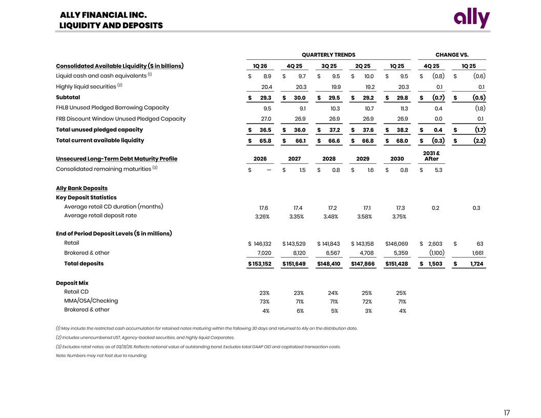 ALLY FINANCIAL INC. LIQUIDITY AND DEPOSITS QUARTERLY TRENDS CHANGE VS. Consolidated Available Liquidity ($ in billions) 1Q 26 4Q 25 3Q 25 2Q 25 1Q 25 4Q 25 1Q 25 (1) Liquid cash and cash equivalents $ 8.9 $ 9.7 $ 9.5 $ 10.0 $ 9.5 $ (0.8) $ (0.6) (2) Highly liquid securities 20.4 20.3 19.9 19.2 20.3 0.1 0.1 Subtotal $ 29.3 $ 30.0 $ 29.5 $ 29.2 $ 29.8 $ (0.7) $ (0.5) FHLB Unused Pledged Borrowing Capacity 9.5 9.1 10.3 10.7 11.3 0.4 (1.8) FRB Discount Window Unused Pledged Capacity 27.0 26.9 26.9 26.9 26.9 0.0 0.1 Total unused pledged capacity $ 36.5 $ 36.0 $ 37.2 $ 37.6 $ 38.2 $ 0.4 $ (1.7) Total current available liquidity $ 65.8 $ 66.1 $ 66.6 $ 66.8 $ 68.0 $ (0.3) $ (2.2) 2031 & Unsecured Long-Term Debt Maturity Profile 2026 2027 2028 2029 2030 After (3) Consolidated remaining maturities $ — $ 1.5 $ 0.8 $ 1.6 $ 0.8 $ 5.3 Ally Bank Deposits Key Deposit Statistics Average retail CD duration (months) 17.6 17.4 17.2 17.1 17.3 0.2 0.3 Average retail deposit rate 3 .26% 3 .35% 3 .48 % 3 .58% 3 .75% End of Period Deposit Levels ($ in millions) Retail $ 146,132 $ 143,529 $ 141,843 $ 143,158 $ 146,069 $ 2,603 $ 63 Brokered & other 7,020 8,120 6,567 4,708 5,359 (1,100) 1,661 Total deposits $ 153,152 $ 151,649 $ 148,410 $ 147,866 $ 151,428 $ 1,503 $ 1,724 Deposit Mix Retail CD 2 3 % 2 3 % 24% 2 5 % 2 5 % MMA/OSA/Checking 7 3 % 7 1 % 7 1 % 72 % 7 1 % Brokered & other 4% 6 % 5 % 3 % 4% (1) May include the restricted cash accumulation for retained notes maturing within the following 30 days and returned to Ally on the distribution date. (2) Includes unencumbered UST, Agency-backed securities, and highly liquid Corporates. (3) Excludes retail notes; as of 03/31/26. Reflects notional value of outstanding bond. Excludes total GAAP OID and capitalized transaction costs. Note: Numbers may not foot due to rounding. 17