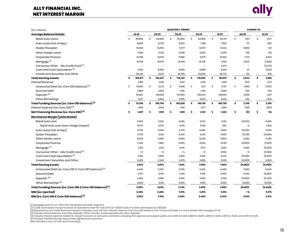 ALLY FINANCIAL INC. NET INTEREST MARGIN QUARTERLY TRENDS CHANGE VS. ($ in millions) 1Q 26 4Q 25 3Q 25 2Q 25 1Q 25 4Q 25 1Q 25 Average Balance Details $ 85,858 $ 84,865 $ 84,592 $ 83,858 $ 83,701 $ 993 $ 2,157 Retail Auto Loans 8,805 8,753 8,255 7,919 7,955 52 850 Auto Lease (net of dep.) 15,466 15,956 14,771 14,570 15,324 (490) 142 Dealer Floorplan Other Dealer Loans 7,460 6,541 6,348 6,293 6,339 919 1,121 13,348 12,078 11,085 11,079 10,304 1,270 3,044 Corporate Finance (1) 15,708 16,070 16,458 16,798 17,104 (362) (1,396) Mortgage (2) Consumer Other - Ally Credit Card — — — — 2,274 — (2,274) (6) 9,100 8,983 8,465 8,888 9,345 117 (245) Cash and Cash Equivalents 29,326 29,191 28,756 28,658 28,733 135 593 Investment Securities and Other $ 185,071 $ 182,437 $ 178,730 $ 178,063 $ 181,079 $ 2,634 $ 3,992 Total Earning Assets Interest Revenue 3,106 3,160 3,162 3,109 3,153 (54) (47) (3) $ 10,654 $ 11,273 $ 11,598 $ 11,171 $ 11,797 $ (619) $ (1,143) Unsecured Debt (ex. Core OID balance) Secured Debt 2,860 2,604 1,780 1,794 2,096 256 764 (4) 151,867 149,028 147,660 148,444 150,640 2,839 1,227 Deposits 6,137 5,845 4,590 4,352 4,204 292 1,933 Other Borrowings (3) Total Funding Sources (ex. Core OID balance) $ 171,518 $ 168,750 $ 165,628 $ 165,761 $ 168,738 $ 2,768 $ 2,780 (3) Interest Expense (ex. Core OID) 1,499 1,545 1,561 1,577 1,659 (46) (160) (3) Net Financing Revenue (ex. Core OID) $ 1,607 $ 1,615 $ 1,601 $ 1,532 $ 1,494 $ (8) $ 114 Net Interest Margin (yield details) Retail Auto Loan 9.30 % 9.32 % 9 .28 % 9 .27 % 9 .21 % ( 0.02)% 0 .09% 9 .27% 9 .27% 9.21 % 9 .19% 9 .11 % — % 0.16 % Retail Auto Loan (excl. hedge impact) 5 .73 % 5 .93 % 6 .70 % 6.88 % 5.69 % ( 0.20)% 0 .04 % Auto Lease (net of dep.) 5 .70 % 5.91 % 6 .42 % 6.41 % 6.50 % ( 0.21) % (0.80)% Dealer Floorplan 5.94% 5.68% 5.66% 5 .64% 5 .66% 0.26% 0 .28 % Other Dealer Loans Corporate Finance 7 .43 % 7 .98% 8 .59% 8.52% 8 .78% ( 0.55)% (1.35) % (1) 3.21% 3.13% 3 .14% 3 .17% 3.23 % 0.08 % ( 0.02)% Mortgage (2) Consumer Other - Ally Credit Card — % —% — % — % 21.16% —% (21.16)% (5) Cash and Cash Equivalents 3 .61% 3 .89% 4.28 % 4.32% 4.23% (0.28) % ( 0.62)% 3.28% 3 .34 % 3.47 % 3 .50 % 3 .26% ( 0.06) % 0.02% Investment Securities and Other Total Earning Assets 6.81% 6 .87% 7.02% 7 .00% 7 .06% ( 0.06) % (0.25)% (3) Unsecured Debt (ex. Core OID & Core OID balance) 6 .44 % 6 .36 % 6 .33% 6.42% 6.40% 0 .08% 0.04 % Secured Debt 5 .17% 5 .14 % 5.41% 5.51% 5 .55% 0.03 % (0.38) % (4) Deposits 3 .29% 3.38% 3.50% 3 .59% 3 .78 % ( 0.09) % ( 0.49)% (6) 4 .02% 4.21 % 4.26% 4.15 % 4.03 % (0.19) % ( 0.01) % Other Borrowings (3) 3 .55% 3.63 % 3.74 % 3.82% 3 .99 % (0.08)% (0.44)% Total Funding Sources (ex. Core OID & Core OID balance) NIM (as reported) 3.48% 3.48% 3 .51% 3.41 % 3 .31% — % 0.17% (3) 3 .52% 3.51 % 3 .55% 3 .45% 3.35 % 0.01 % 0.17 % NIM (ex. Core OID & Core OID balance) (1) Mortgage loans in run-off at the Corporate and Other segment. (2) Credit card assets moved to Assets of Operations Held-for-Sale (HFS) on 3/31/25. Sale of Credit Card closed on 04/01/25. (3) Represents a non-GAAP financial measure. Excludes Core OID from interest expense and Core OID balance from Unsecured Debt. For more details refer to pages 23-24. (4) Includes retail, brokered, and other deposits. Other includes sweep deposits and other deposits. (5) Includes interest expense related to margin received on derivative contracts. Excluding this expense, annualized yields were 3.61% for 1Q26, 3.88% for 4Q25, 4.28% for 3Q25, 4.35% for 2Q25, and 4.37% for 1Q25. (6) Includes FHLB Borrowings, Repurchase Agreements and other. Note: Numbers may not foot due to rounding. 18