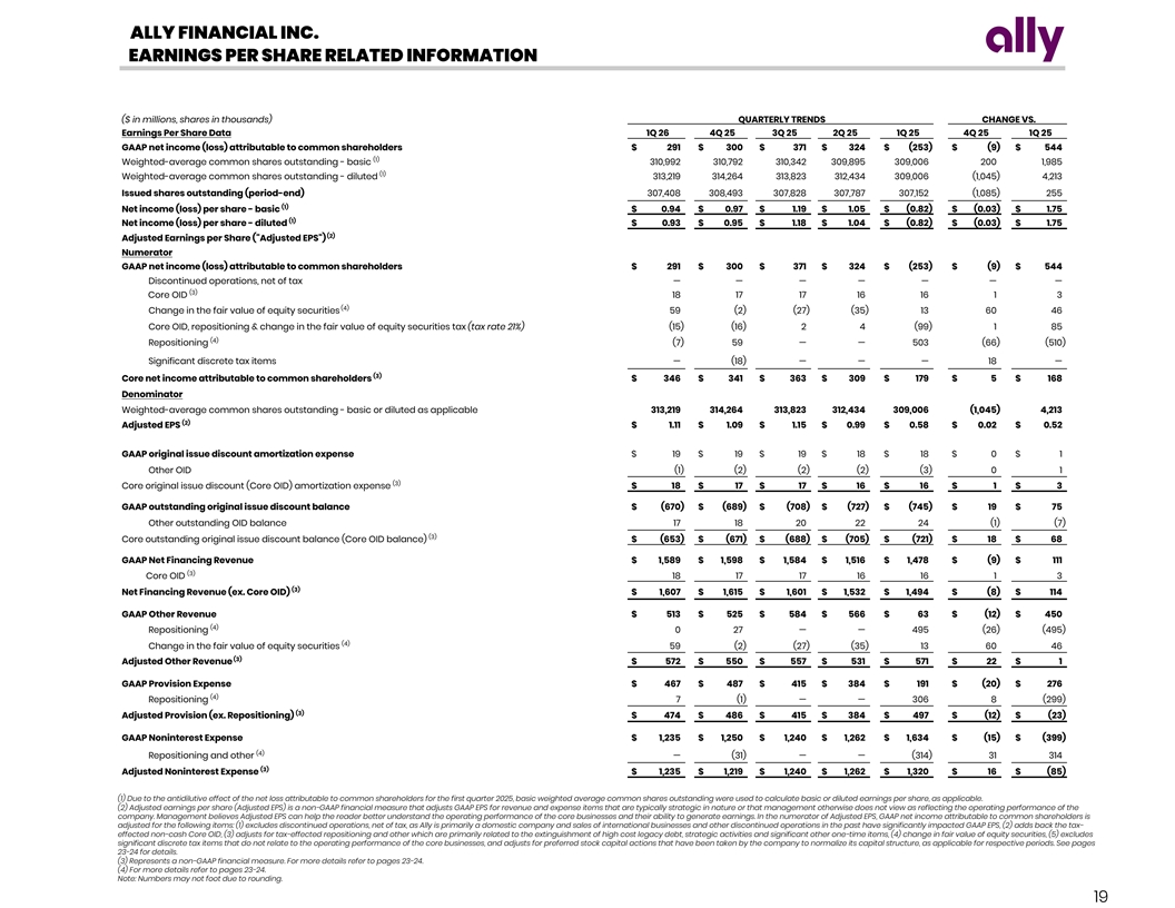 ALLY FINANCIAL INC. EARNINGS PER SHARE RELATED INFORMATION ($ in millions, shares in thousands) QUARTERLY TRENDS CHANGE VS. Earnings Per Share Data 1Q 26 4Q 25 3Q 25 2Q 25 1Q 25 4Q 25 1Q 25 GAAP net income (loss) attributable to common shareholders $ 291 $ 300 $ 371 $ 324 $ (253) $ (9) $ 544 (1) Weighted-average common shares outstanding - basic 310,992 310,792 310,342 309,895 309,006 200 1,985 (1) Weighted-average common shares outstanding - diluted 313,219 314,264 313,823 312,434 309,006 (1,045) 4,213 Issued shares outstanding (period-end) 307,408 308,493 307,828 307,787 307,152 (1,085) 255 (1) Net income (loss) per share - basic $ 0.94 $ 0.97 $ 1.19 $ 1.05 $ (0.82) $ (0.03) $ 1.75 (1) Net income (loss) per share - diluted $ 0.93 $ 0.95 $ 1.18 $ 1.04 $ (0.82) $ (0.03) $ 1.75 (2) Adjusted Earnings per Share ( Adjusted EPS ) Numerator GAAP net income (loss) attributable to common shareholders $ 291 $ 300 $ 371 $ 324 $ (253) $ (9) $ 544 Discontinued operations, net of tax — — — — — — — (3) Core OID 18 17 17 16 16 1 3 (4) Change in the fair value of equity securities 59 (2) (27) (35) 13 60 46 Core OID, repositioning & change in the fair value of equity securities tax (tax rate 21%) (15) (16) 2 4 (99) 1 85 (4) Repositioning (7) 59 — — 503 (66) (510) Significant discrete tax items — (18) — — — 18 — (3) Core net income attributable to common shareholders $ 346 $ 341 $ 363 $ 309 $ 179 $ 5 $ 168 Denominator Weighted-average common shares outstanding - basic or diluted as applicable 313,219 314,264 313,823 312,434 309,006 (1,045) 4,213 (2) Adjusted EPS $ 1.11 $ 1.09 $ 1.15 $ 0.99 $ 0.58 $ 0.02 $ 0.52 GAAP original issue discount amortization expense $ 19 $ 19 $ 19 $ 18 $ 18 $ 0 $ 1 Other OID (1) (2) (2) (2) (3) 0 1 (3) Core original issue discount (Core OID) amortization expense $ 18 $ 17 $ 17 $ 16 $ 16 $ 1 $ 3 GAAP outstanding original issue discount balance $ (670) $ (689) $ (708) $ (727) $ (745) $ 19 $ 75 Other outstanding OID balance 17 18 20 22 24 (1) (7) (3) Core outstanding original issue discount balance (Core OID balance) $ (653) $ (671) $ (688) $ (705) $ (721) $ 18 $ 68 GAAP Net Financing Revenue $ 1,589 $ 1,598 $ 1,584 $ 1,516 $ 1,478 $ (9) $ 111 (3) Core OID 18 17 17 16 16 1 3 (3) Net Financing Revenue (ex. Core OID) $ 1,607 $ 1,615 $ 1,601 $ 1,532 $ 1,494 $ (8) $ 114 GAAP Other Revenue $ 513 $ 525 $ 584 $ 566 $ 63 $ (12) $ 450 (4) Repositioning 0 27 — — 495 (26) (495) (4) Change in the fair value of equity securities 59 (2) (27) (35) 13 60 46 (3) Adjusted Other Revenue $ 572 $ 550 $ 557 $ 531 $ 571 $ 22 $ 1 GAAP Provision Expense $ 467 $ 487 $ 415 $ 384 $ 191 $ (20) $ 276 (4) Repositioning 7 (1) — — 306 8 (299) (3) Adjusted Provision (ex. Repositioning) $ 474 $ 486 $ 415 $ 384 $ 497 $ (12) $ (23) GAAP Noninterest Expense $ 1,235 $ 1,250 $ 1,240 $ 1,262 $ 1,634 $ (15) $ (399) (4) Repositioning and other — (31) — — (314) 31 314 (3) Adjusted Noninterest Expense $ 1,235 $ 1,219 $ 1,240 $ 1,262 $ 1,320 $ 16 $ (85) (1) Due to the antidilutive effect of the net loss attributable to common shareholders for the first quarter 2025, basic weighted average common shares outstanding were used to calculate basic or diluted earnings per share, as applicable. (2) Adjusted earnings per share (Adjusted EPS) is a non-GAAP financial measure that adjusts GAAP EPS for revenue and expense items that are typically strategic in nature or that management otherwise does not view as reflecting the operating performance of the company. Management believes Adjusted EPS can help the reader better understand the operating performance of the core businesses and their ability to generate earnings. In the numerator of Adjusted EPS, GAAP net income attributable to common shareholders is adjusted for the following items: (1) excludes discontinued operations, net of tax, as Ally is primarily a domestic company and sales of international businesses and other discontinued operations in the past have significantly impacted GAAP EPS, (2) adds back the tax- effected non-cash Core OID, (3) adjusts for tax-effected repositioning and other which are primarily related to the extinguishment of high cost legacy debt, strategic activities and significant other one-time items, (4) change in fair value of equity securities, (5) excludes significant discrete tax items that do not relate to the operating performance of the core businesses, and adjusts for preferred stock capital actions that have been taken by the company to normalize its capital structure, as applicable for respective periods. See pages 23-24 for details. (3) Represents a non-GAAP financial measure. For more details refer to pages 23-24. (4) For more details refer to pages 23-24. Note: Numbers may not foot due to rounding. 19