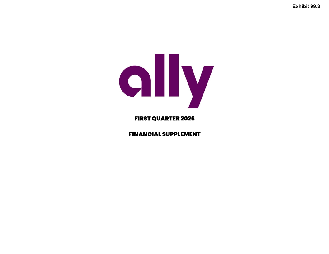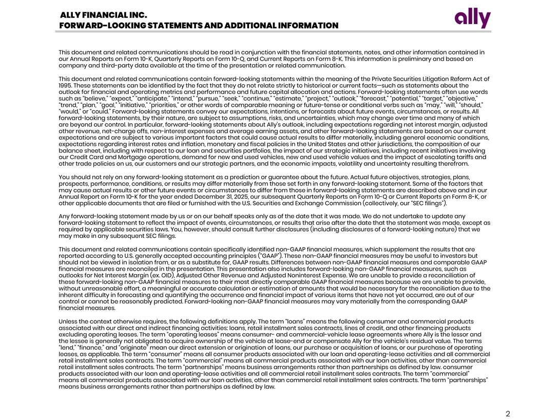 ALLY FINANCIAL INC. FORWARD-LOOKING STATEMENTS AND ADDITIONAL INFORMATION This document and related communications should be read in conjunction with the financial statements, notes, and other information contained in our Annual Reports on Form 10-K, Quarterly Reports on Form 10-Q, and Current Reports on Form 8-K. This information is preliminary and based on company and third-party data available at the time of the presentation or related communication. This document and related communications contain forward-looking statements within the meaning of the Private Securities Litigation Reform Act of 1995. These statements can be identified by the fact that they do not relate strictly to historical or current facts—such as statements about the outlook for financial and operating metrics and performance and future capital allocation and actions. Forward-looking statements often use words such as “believe,” “expect,” “anticipate,” “intend,” “pursue,” “seek,” “continue,” “estimate,” “project,” “outlook,” “forecast,” “potential,” “target,” “objective,” “trend,” “plan,” “goal,” “initiative,” “priorities,” or other words of comparable meaning or future-tense or conditional verbs such as “may,” “will,” “should,” “would,” or “could.” Forward-looking statements convey our expectations, intentions, or forecasts about future events, circumstances, or results. All forward-looking statements, by their nature, are subject to assumptions, risks, and uncertainties, which may change over time and many of which are beyond our control. In particular, forward-looking statements about Ally’s outlook, including expectations regarding net interest margin, adjusted other revenue, net-charge offs, non-interest expenses and average earning assets, and other forward-looking statements are based on our current expectations and are subject to various important factors that could cause actual results to differ materially, including general economic conditions, expectations regarding interest rates and inflation, monetary and fiscal policies in the United States and other jurisdictions, the composition of our balance sheet, including with respect to our loan and securities portfolios, the impact of our strategic initiatives, including recent initiatives involving our Credit Card and Mortgage operations, demand for new and used vehicles, new and used vehicle values and the impact of escalating tariffs and other trade policies on us, our customers and our strategic partners, and the economic impacts, volatility and uncertainty resulting therefrom. You should not rely on any forward-looking statement as a prediction or guarantee about the future. Actual future objectives, strategies, plans, prospects, performance, conditions, or results may differ materially from those set forth in any forward-looking statement. Some of the factors that may cause actual results or other future events or circumstances to differ from those in forward-looking statements are described above and in our Annual Report on Form 10-K for the year ended December 31, 2025, our subsequent Quarterly Reports on Form 10-Q or Current Reports on Form 8-K, or other applicable documents that are filed or furnished with the U.S. Securities and Exchange Commission (collectively, our “SEC filings”). Any forward-looking statement made by us or on our behalf speaks only as of the date that it was made. We do not undertake to update any forward-looking statement to reflect the impact of events, circumstances, or results that arise after the date that the statement was made, except as required by applicable securities laws. You, however, should consult further disclosures (including disclosures of a forward-looking nature) that we may make in any subsequent SEC filings. This document and related communications contain specifically identified non-GAAP financial measures, which supplement the results that are reported according to U.S. generally accepted accounting principles (“GAAP”). These non-GAAP financial measures may be useful to investors but should not be viewed in isolation from, or as a substitute for, GAAP results. Differences between non-GAAP financial measures and comparable GAAP financial measures are reconciled in the presentation. This presentation also includes forward-looking non-GAAP financial measures, such as outlooks for Net Interest Margin (ex. OID), Adjusted Other Revenue and Adjusted Noninterest Expense. We are unable to provide a reconciliation of these forward-looking non-GAAP financial measures to their most directly comparable GAAP financial measures because we are unable to provide, without unreasonable effort, a meaningful or accurate calculation or estimation of amounts that would be necessary for the reconciliation due to the inherent difficulty in forecasting and quantifying the occurrence and financial impact of various items that have not yet occurred, are out of our control or cannot be reasonably predicted. Forward-looking non-GAAP financial measures may vary materially from the corresponding GAAP financial measures. Unless the context otherwise requires, the following definitions apply. The term “loans” means the following consumer and commercial products associated with our direct and indirect financing activities: loans, retail installment sales contracts, lines of credit, and other financing products excluding operating leases. The term “operating leases” means consumer- and commercial-vehicle lease agreements where Ally is the lessor and the lessee is generally not obligated to acquire ownership of the vehicle at lease-end or compensate Ally for the vehicle’s residual value. The terms “lend,” “finance,” and “originate” mean our direct extension or origination of loans, our purchase or acquisition of loans, or our purchase of operating leases, as applicable. The term “consumer” means all consumer 