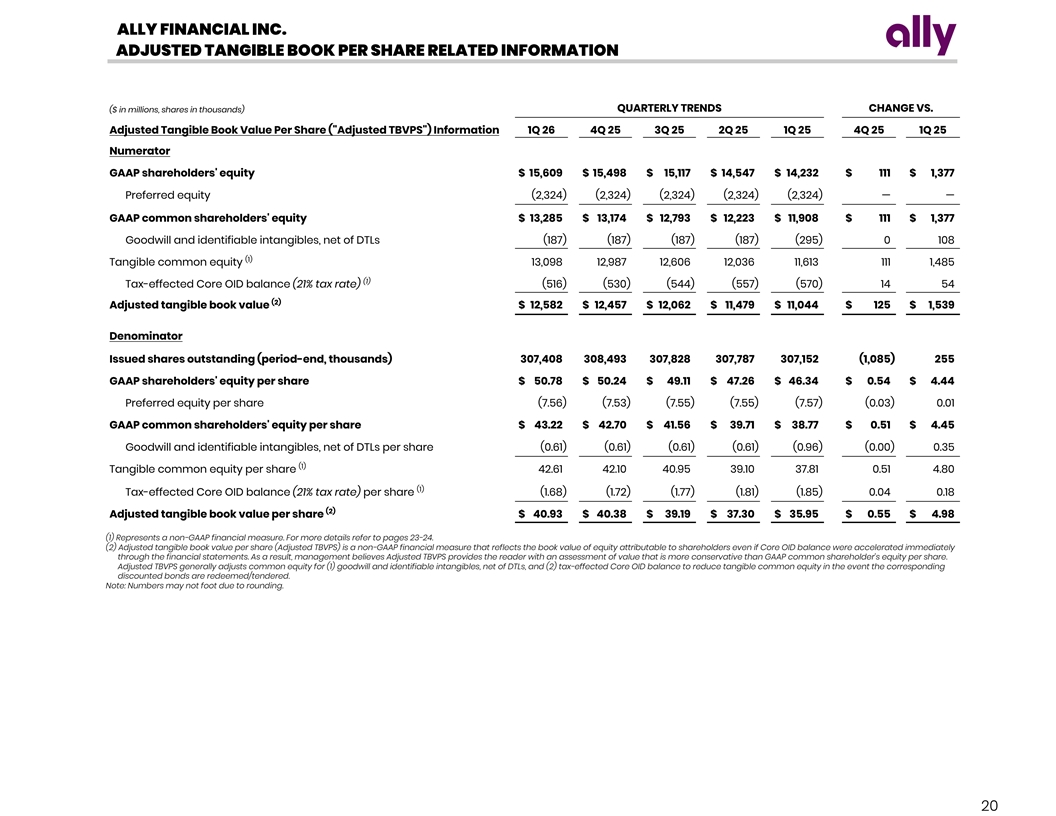 ALLY FINANCIAL INC. ADJUSTED TANGIBLE BOOK PER SHARE RELATED INFORMATION QUARTERLY TRENDS CHANGE VS. ($ in millions, shares in thousands) Adjusted Tangible Book Value Per Share ( Adjusted TBVPS ) Information 1Q 26 4Q 25 3Q 25 2Q 25 1Q 25 4Q 25 1Q 25 Numerator GAAP shareholders' equity $ 15,609 $ 15,498 $ 15,117 $ 14,547 $ 14,232 $ 111 $ 1,377 Preferred equity (2,324) (2,324) (2,324) (2,324) (2,324) — — GAAP common shareholders' equity $ 13,285 $ 13,174 $ 12,793 $ 12,223 $ 11,908 $ 111 $ 1,377 Goodwill and identifiable intangibles, net of DTLs (187) (187) (187) (187) (295) 0 108 (1) Tangible common equity 13,098 12,987 12,606 12,036 11,613 111 1,485 (1) Tax-effected Core OID balance (21% tax rate) (516) (530) (544) (557) (570) 14 54 (2) Adjusted tangible book value $ 12,582 $ 12,457 $ 12,062 $ 11,479 $ 11,044 $ 125 $ 1,539 Denominator Issued shares outstanding (period-end, thousands) 307,408 308,493 307,828 307,787 307,152 (1,085) 255 GAAP shareholders' equity per share $ 50.78 $ 50.24 $ 49.11 $ 47.26 $ 46.34 $ 0.54 $ 4.44 Preferred equity per share (7.56) (7.53) (7.55) (7.55) (7.57) (0.03) 0.01 GAAP common shareholders' equity per share $ 43.22 $ 42.70 $ 41.56 $ 39.71 $ 38.77 $ 0.51 $ 4.45 Goodwill and identifiable intangibles, net of DTLs per share (0.61) (0.61) (0.61) (0.61) (0.96) (0.00) 0.35 (1) Tangible common equity per share 42.61 42.10 40.95 39.10 37.81 0.51 4.80 (1) Tax-effected Core OID balance (21% tax rate) per share (1.68) (1.72) (1.77) (1.81) (1.85) 0.04 0.18 (2) Adjusted tangible book value per share $ 40.93 $ 40.38 $ 39.19 $ 37.30 $ 35.95 $ 0.55 $ 4.98 (1) Represents a non-GAAP financial measure. For more details refer to pages 23-24. (2) Adjusted tangible book value per share (Adjusted TBVPS) is a non-GAAP financial measure that reflects the book value of equity attributable to shareholders even if Core OID balance were accelerated immediately through the financial statements. As a result, management believes Adjusted TBVPS provides the reader with an assessment of value that is more conservative than GAAP common shareholder’s equity per share. Adjusted TBVPS generally adjusts common equity for (1) goodwill and identifiable intangibles, net of DTLs, and (2) tax-effected Core OID balance to reduce tangible common equity in the event the corresponding discounted bonds are redeemed/tendered. Note: Numbers may not foot due to rounding. 20