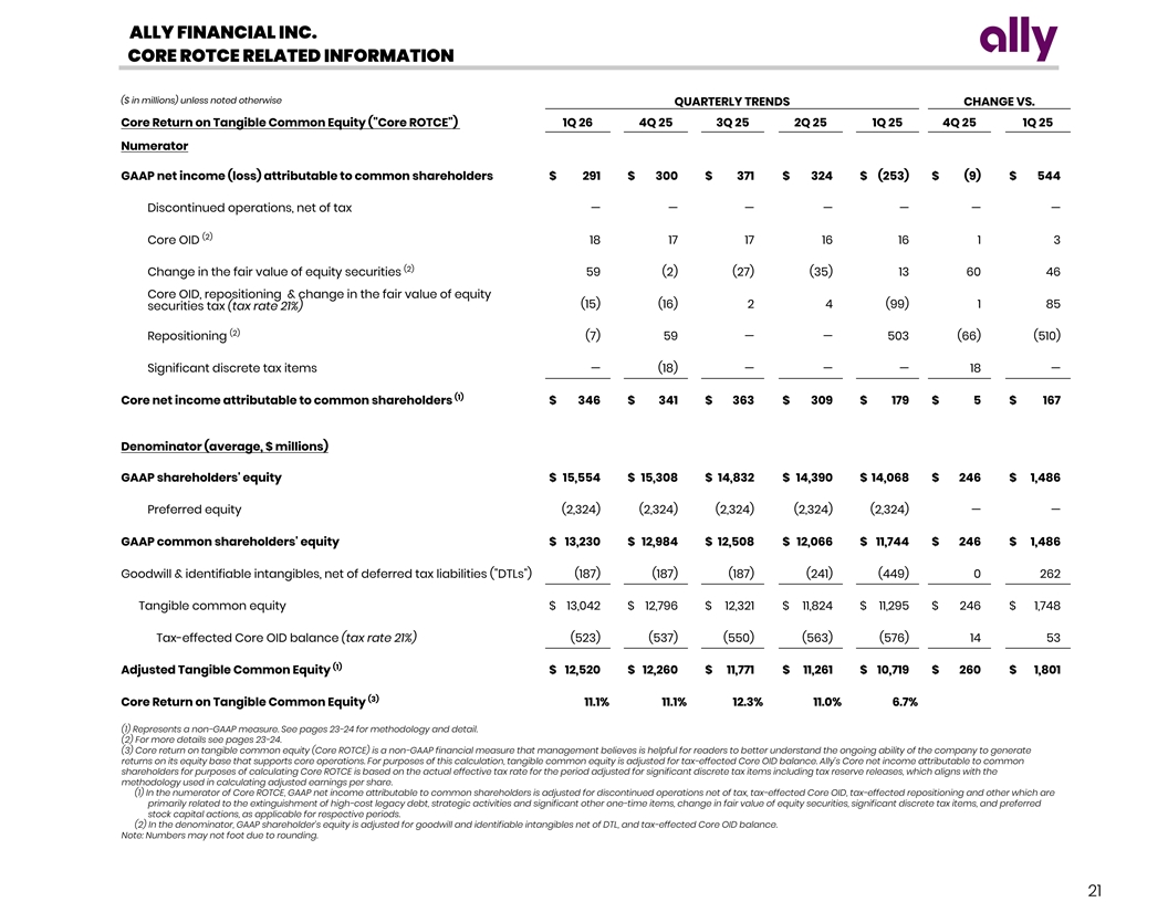 ALLY FINANCIAL INC. CORE ROTCE RELATED INFORMATION ($ in millions) unless noted otherwise QUARTERLY TRENDS CHANGE VS. Core Return on Tangible Common Equity ( Core ROTCE ) 1Q 26 4Q 25 3Q 25 2Q 25 1Q 25 4Q 25 1Q 25 Numerator GAAP net income (loss) attributable to common shareholders $ 291 $ 300 $ 371 $ 324 $ (253) $ (9) $ 544 Discontinued operations, net of tax — — — — — — — (2) Core OID 18 17 17 16 16 1 3 (2) Change in the fair value of equity securities 59 (2) (27) (35) 13 60 46 Core OID, repositioning & change in the fair value of equity (15) (16) 2 4 (99) 1 85 securities tax (tax rate 21%) (2) Repositioning (7) 59 — — 503 (66) (510) Significant discrete tax items — (18) — — — 18 — (1) Core net income attributable to common shareholders $ 346 $ 341 $ 363 $ 309 $ 179 $ 5 $ 167 Denominator (average, $ millions) GAAP shareholders' equity $ 15,554 $ 15,308 $ 14,832 $ 14,390 $ 14,068 $ 246 $ 1,486 Preferred equity (2,324) (2,324) (2,324) (2,324) (2,324) — — GAAP common shareholders' equity $ 13,230 $ 12,984 $ 12,508 $ 12,066 $ 11,744 $ 246 $ 1,486 Goodwill & identifiable intangibles, net of deferred tax liabilities ( DTLs ) (187) (187) (187) (241) (449) 0 262 Tangible common equity $ 13,042 $ 12,796 $ 12,321 $ 11,824 $ 11,295 $ 246 $ 1,748 Tax-effected Core OID balance (tax rate 21%) (523) (537) (550) (563) (576) 14 53 (1) Adjusted Tangible Common Equity $ 12,520 $ 12,260 $ 11,771 $ 11,261 $ 10,719 $ 260 $ 1,801 (3) Core Return on Tangible Common Equity 1 1.1 % 1 1.1 % 1 2.3% 1 1.0 % 6 .7% (1) Represents a non-GAAP measure. See pages 23-24 for methodology and detail. (2) For more details see pages 23-24. (3) Core return on tangible common equity (Core ROTCE) is a non-GAAP financial measure that management believes is helpful for readers to better understand the ongoing ability of the company to generate returns on its equity base that supports core operations. For purposes of this calculation, tangible common equity is adjusted for tax-effected Core OID balance. Ally’s Core net income attributable to common shareholders for purposes of calculating Core ROTCE is based on the actual effective tax rate for the period adjusted for significant discrete tax items including tax reserve releases, which aligns with the methodology used in calculating adjusted earnings per share. (1) In the numerator of Core ROTCE, GAAP net income attributable to common shareholders is adjusted for discontinued operations net of tax, tax-effected Core OID, tax-effected repositioning and other which are primarily related to the extinguishment of high-cost legacy debt, strategic activities and significant other one-time items, change in fair value of equity securities, significant discrete tax items, and preferred stock capital actions, as applicable for respective periods. (2) In the denominator, GAAP shareholder’s equity is adjusted for goodwill and identifiable intangibles net of DTL, and tax-effected Core OID balance. Note: Numbers may not foot due to rounding. 21