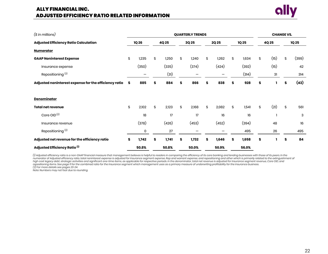 ALLY FINANCIAL INC. ADJUSTED EFFICIENCY RATIO RELATED INFORMATION ($ in millions) QUARTERLY TRENDS CHANGE VS. Adjusted Efficiency Ratio Calculation 1Q 26 4Q 25 3Q 25 2Q 25 1Q 25 4Q 25 1Q 25 Numerator GAAP Noninterest Expense $ 1,235 $ 1,250 $ 1,240 $ 1,262 $ 1,634 $ (15) $ (399) Insurance expense (350) (335) (374) (424) (392) (15) 42 (2) Repositioning — (31) — — (314) 31 314 Adjusted noninterest expense for the efficiency ratio $ 885 $ 884 $ 866 $ 838 $ 928 $ 1 $ (43) Denominator Total net revenue $ 2,102 $ 2,123 $ 2,168 $ 2,082 $ 1,541 $ (21) $ 561 (2) Core OID 18 17 17 16 16 1 3 Insurance revenue (378) (426) (453) (452) (394) 48 16 (2) Repositioning 0 27 — — 495 26 495 Adjusted net revenue for the efficiency ratio $ 1,742 $ 1,741 $ 1,732 $ 1,646 $ 1,658 $ 1 $ 84 (1) Adjusted Efficiency Ratio 50.8 % 5 0.8% 5 0.0 % 5 0.9% 56.0 % (1) Adjusted efficiency ratio is a non-GAAP financial measure that management believes is helpful to readers in comparing the efficiency of its core banking and lending businesses with those of its peers. In the numerator of Adjusted efficiency ratio, total noninterest expense is adjusted for Insurance segment expense, Rep and warrant expense, and repositioning and other which is primarily related to the extinguishment of high cost legacy debt, strategic activities and significant one-time items, as applicable for respective periods. In the denominator, total net revenue is adjusted for Insurance segment revenue, Core OID, and repositioning items. See page 11 for the combined ratio for the Insurance segment which management uses as a primary measure of underwriting profitability for the Insurance business. (2) For more details see pages 23-24. Note: Numbers may not foot due to rounding. 22