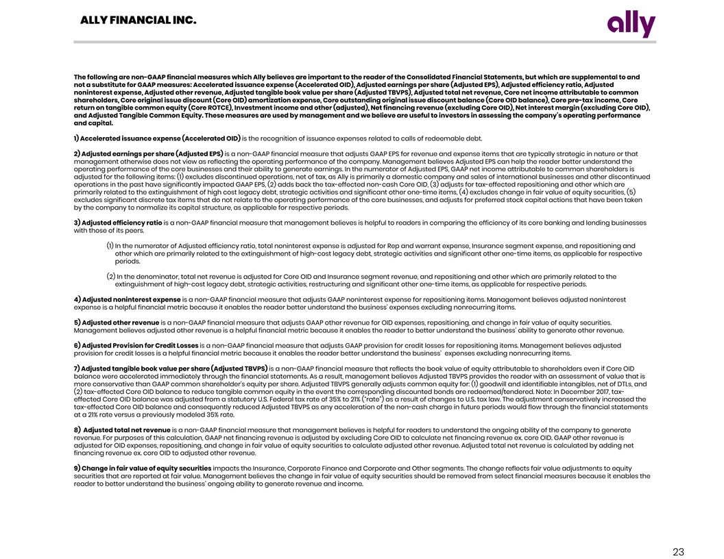 ALLY FINANCIAL INC. The following are non-GAAP financial measures which Ally believes are important to the reader of the Consolidated Financial Statements, but which are supplemental to and not a substitute for GAAP measures: Accelerated issuance expense (Accelerated OID), Adjusted earnings per share (Adjusted EPS), Adjusted efficiency ratio, Adjusted noninterest expense, Adjusted other revenue, Adjusted tangible book value per share (Adjusted TBVPS), Adjusted total net revenue, Core net income attributable to common shareholders, Core original issue discount (Core OID) amortization expense, Core outstanding original issue discount balance (Core OID balance), Core pre-tax income, Core return on tangible common equity (Core ROTCE), Investment income and other (adjusted), Net financing revenue (excluding Core OID), Net interest margin (excluding Core OID), and Adjusted Tangible Common Equity. These measures are used by management and we believe are useful to investors in assessing the company’s operating performance and capital. 1) Accelerated issuance expense (Accelerated OID) is the recognition of issuance expenses related to calls of redeemable debt. 2) Adjusted earnings per share (Adjusted EPS) is a non-GAAP financial measure that adjusts GAAP EPS for revenue and expense items that are typically strategic in nature or that management otherwise does not view as reflecting the operating performance of the company. Management believes Adjusted EPS can help the reader better understand the operating performance of the core businesses and their ability to generate earnings. In the numerator of Adjusted EPS, GAAP net income attributable to common shareholders is adjusted for the following items: (1) excludes discontinued operations, net of tax, as Ally is primarily a domestic company and sales of international businesses and other discontinued operations in the past have significantly impacted GAAP EPS, (2) adds back the tax-effected non-cash Core OID, (3) adjusts for tax-effected repositioning and other which are primarily related to the extinguishment of high cost legacy debt, strategic activities and significant other one-time items, (4) excludes change in fair value of equity securities, (5) excludes significant discrete tax items that do not relate to the operating performance of the core businesses, and adjusts for preferred stock capital actions that have been taken by the company to normalize its capital structure, as applicable for respective periods. 3) Adjusted efficiency ratio is a non-GAAP financial measure that management believes is helpful to readers in comparing the efficiency of its core banking and lending businesses with those of its peers. (1) In the numerator of Adjusted efficiency ratio, total noninterest expense is adjusted for Rep and warrant expense, Insurance segment expense, and repositioning and other which are primarily related to the extinguishment of high-cost legacy debt, strategic activities and significant other one-time items, as applicable for respective periods. (2) In the denominator, total net revenue is adjusted for Core OID and Insurance segment revenue, and repositioning and other which are primarily related to the extinguishment of high-cost legacy debt, strategic activities, restructuring and significant other one-time items, as applicable for respective periods. 4) Adjusted noninterest expense is a non-GAAP financial measure that adjusts GAAP noninterest expense for repositioning items. Management believes adjusted noninterest expense is a helpful financial metric because it enables the reader better understand the business' expenses excluding nonrecurring items. 5) Adjusted other revenue is a non-GAAP financial measure that adjusts GAAP other revenue for OID expenses, repositioning, and change in fair value of equity securities. Management believes adjusted other revenue is a helpful financial metric because it enables the reader to better understand the business' ability to generate other revenue. 6) Adjusted Provision for Credit Losses is a non-GAAP financial measure that adjusts GAAP provision for credit losses for repositioning items. Management believes adjusted provision for credit losses is a helpful financial metric because it enables the reader better understand the business’ expenses excluding nonrecurring items. 7) Adjusted tangible book value per share (Adjusted TBVPS) is a non-GAAP financial measure that reflects the book value of equity attributable to shareholders even if Core OID balance were accelerated immediately through the financial statements. As a result, management believes Adjusted TBVPS provides the reader with an assessment of value that is more conservative than GAAP common shareholder’s equity per share. Adjusted TBVPS generally adjusts common equity for: (1) goodwill and identifiable intangibles, net of DTLs, and (2) tax-effected Core OID balance to reduce tangible common equity in the event the corresponding discounted bonds are redeemed/tendered. Note: In December 2017, tax- effected Core OID balance was adjusted from a statutory U.S. Federal tax rate of 35% to 21% (“rate”) as a result of changes to U.S. tax law. The adjustment conservatively increased the tax-effected Core OID balance and consequently reduced Adjusted TBVPS as any acceleration of the non-cash charge in future periods would flow through the financial statements at a 21% rate versus a previously modeled 35% rate. 8) Adjusted total net revenue is a non-GAAP financial measure that management believes is helpful for readers to understand the ongoing ability of the company to generate revenue. For purposes of this calculation, GAAP net financing revenue is adjusted by excluding Core OID to calculate net financing revenue ex. core OID. GAAP other revenue is adjusted for OID expenses, repositioning, and change in fair value of equity securities to calculate adjusted other revenue. Adjusted total net revenue is calculated by adding net financing