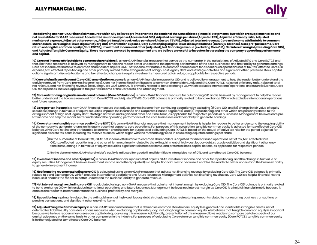 ALLY FINANCIAL INC. The following are non-GAAP financial measures which Ally believes are important to the reader of the Consolidated Financial Statements, but which are supplemental to and not a substitute for GAAP measures: Accelerated issuance expense (Accelerated OID), Adjusted earnings per share (Adjusted EPS), Adjusted efficiency ratio, Adjusted noninterest expense, Adjusted other revenue, Adjusted tangible book value per share (Adjusted TBVPS), Adjusted total net revenue, Core net income attributable to common shareholders, Core original issue discount (Core OID) amortization expense, Core outstanding original issue discount balance (Core OID balance), Core pre-tax income, Core return on tangible common equity (Core ROTCE), Investment income and other (adjusted), Net financing revenue (excluding Core OID), Net interest margin (excluding Core OID), and Adjusted Tangible Common Equity. These measures are used by management and we believe are useful to investors in assessing the company’s operating performance and capital. 10) Core net income attributable to common shareholders is a non-GAAP financial measure that serves as the numerator in the calculations of Adjusted EPS and Core ROTCE and that, like those measures, is believed by management to help the reader better understand the operating performance of the core businesses and their ability to generate earnings. Core net income attributable to common shareholders adjusts GAAP net income attributable to common shareholders for discontinued operations net of tax, tax-effected Core OID expense, tax-effected repositioning and other primarily related to the extinguishment of high-cost legacy debt and strategic activities and significant other, preferred stock capital actions, significant discrete tax items and tax-effected changes in equity investments measured at fair value, as applicable for respective periods. 11) Core original issue discount (Core OID) amortization expense is a non-GAAP financial measure for OID and is believed by management to help the reader better understand the activity removed from: Core pre-tax income (loss), Core net income (loss) attributable to common shareholders, Adjusted EPS, Core ROTCE, Adjusted efficiency ratio, Adjusted total net revenue, and Net financing revenue (excluding Core OID). Core OID is primarily related to bond exchange OID which excludes international operations and future issuances. Core OID for all periods shown is applied to the pre-tax income of the Corporate and Other segment. 12) Core outstanding original issue discount balance (Core OID balance) is a non-GAAP financial measure for outstanding OID and is believed by management to help the reader better understand the balance removed from Core ROTCE and Adjusted TBVPS. Core OID balance is primarily related to bond exchange OID which excludes international operations and future issuances. 13) Core pre-tax income is a non-GAAP financial measure that adjusts pre-tax income from continuing operations by excluding (1) Core OID, and (2) change in fair value of equity securities (change in fair value of equity securities impacts the Insurance and Corporate Finance segments), and (3) Repositioning and other which are primarily related to the extinguishment of high cost legacy debt, strategic activities and significant other one-time items, as applicable for respective periods or businesses. Management believes core pre- tax income can help the reader better understand the operating performance of the core businesses and their ability to generate earnings. 14) Core return on tangible common equity (Core ROTCE) is a non-GAAP financial measure that management believes is helpful for readers to better understand the ongoing ability of the company to generate returns on its equity base that supports core operations. For purposes of this calculation, tangible common equity is adjusted for tax-effected Core OID balance. Ally’s Core net income attributable to common shareholders for purposes of calculating Core ROTCE is based on the actual effective tax rate for the period adjusted for significant discrete tax items including tax reserve releases, which aligns with the methodology used in calculating adjusted earnings per share. (1) In the numerator of Core ROTCE, GAAP net income attributable to common shareholders is adjusted for discontinued operations net of tax, tax-effected Core OID, tax-effected repositioning and other which are primarily related to the extinguishment of high-cost legacy debt, strategic activities and significant other one- time items, change in fair value of equity securities, significant discrete tax items, and preferred stock capital actions, as applicable for respective periods. (2) In the denominator, GAAP shareholder’s equity is adjusted for goodwill and identifiable intangibles net of DTL, and tax-effected Core OID balance. 15) Investment income and other (adjusted) is a non-GAAP financial measure that adjusts GAAP investment income and other for repositioning, and the change in fair value of equity securities. Management believes investment income and other (adjusted) is a helpful financial metric because it enables the reader to better understand the business' ability to generate investment income. 16) Net financing revenue excluding core OID is calculated using a non-GAAP measure that adjusts net financing revenue by excluding Core OID. The Core OID balance is primarily related to bond exchange OID which excludes international operations and future issuances. Management believes net financing revenue ex. Core OID is a helpful financial metric because it enables the reader to better understand the business' ability to generate revenue. 17) Net interest margin excluding core OID is calculated using a non-GAAP measure that adjusts net interest margin by excluding Core OID. The Core OID balance is primarily related to bond exchange OID which excludes international operations and future issuances. Management beli