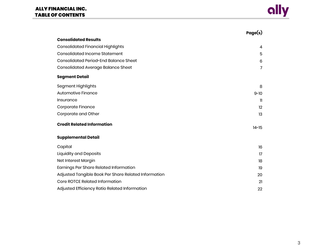 ALLY FINANCIAL INC. TABLE OF CONTENTS Page(s) Consolidated Results Consolidated Financial Highlights 4 Consolidated Income Statement 5 Consolidated Period-End Balance Sheet 6 Consolidated Average Balance Sheet 7 Segment Detail Segment Highlights 8 Automotive Finance 9-10 Insurance 11 Corporate Finance 12 Corporate and Other 13 Credit Related Information 14-15 Supplemental Detail Capital 16 Liquidity and Deposits 17 Net Interest Margin 18 Earnings Per Share Related Information 19 Adjusted Tangible Book Per Share Related Information 20 Core ROTCE Related Information 21 Adjusted Efficiency Ratio Related Information 22 3