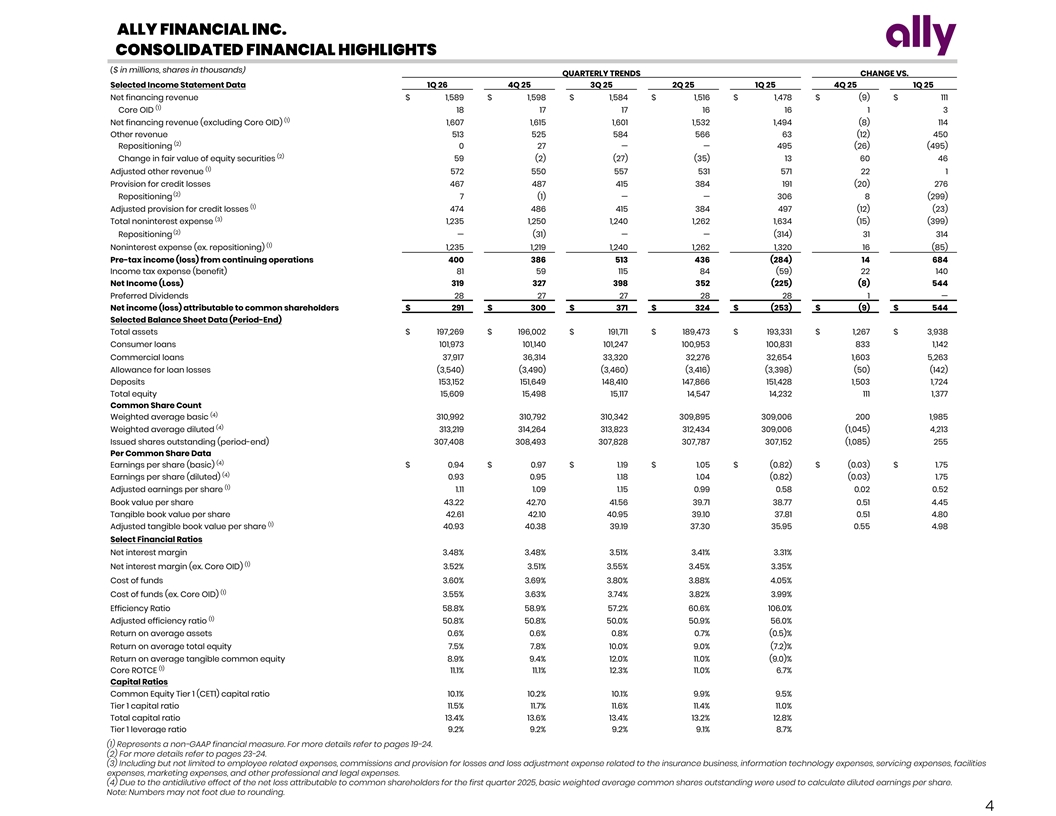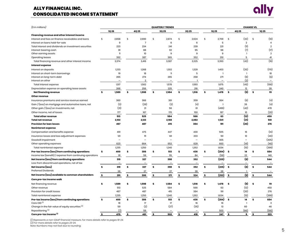 ALLY FINANCIAL INC. CONSOLIDATED FINANCIAL HIGHLIGHTS ($ in millions, shares in thousands) QUARTERLY TRENDS CHANGE VS. Selected Income Statement Data 1Q 26 4Q 25 3Q 25 2Q 25 1Q 25 4Q 25 1Q 25 Net financing revenue $ 1,589 $ 1,598 $ 1,584 $ 1,516 $ 1,478 $ (9) $ 111 (1) Core OID 18 17 17 16 16 1 3 (1) Net financing revenue (excluding Core OID) 1,607 1,615 1,601 1,532 1,494 (8) 114 Other revenue 513 525 584 566 63 (12) 450 (2) Repositioning 0 27 — — 495 (26) (495) (2) Change in fair value of equity securities 59 (2) (27) (35) 13 60 46 (1) Adjusted other revenue 572 550 557 531 571 22 1 Provision for credit losses 467 487 415 384 191 (20) 276 (2) Repositioning 7 (1) — — 306 8 (299) (1) Adjusted provision for credit losses 474 486 415 384 497 (12) (23) (3) Total noninterest expense 1,235 1,250 1,240 1,262 1,634 (15) (399) (2) Repositioning — (31) — — (314) 31 314 (1) Noninterest expense (ex. repositioning) 1,235 1,219 1,240 1,262 1,320 16 (85) Pre-tax income (loss) from continuing operations 400 386 513 436 (284) 14 684 Income tax expense (benefit) 81 59 115 84 (59) 22 140 Net Income (Loss) 319 327 398 352 (225) (8) 544 Preferred Dividends 28 27 27 28 28 1 — Net income (loss) attributable to common shareholders $ 291 $ 300 $ 371 $ 324 $ (253) $ (9) $ 544 Selected Balance Sheet Data (Period-End) Total assets $ 197,269 $ 196,002 $ 191,711 $ 189,473 $ 193,331 $ 1,267 $ 3,938 Consumer loans 101,973 101,140 101,247 100,953 100,831 833 1,142 Commercial loans 37,917 36,314 33,320 32,276 32,654 1,603 5,263 Allowance for loan losses (3,540) (3,490) (3,460) (3,416) (3,398) (50) (142) Deposits 153,152 151,649 148,410 147,866 151,428 1,503 1,724 Total equity 15,609 15,498 15,117 14,547 14,232 111 1,377 Common Share Count (4) Weighted average basic 310,992 310,792 310,342 309,895 309,006 200 1,985 (4) Weighted average diluted 313,219 314,264 313,823 312,434 309,006 (1,045) 4,213 Issued shares outstanding (period-end) 307,408 308,493 307,828 307,787 307,152 (1,085) 255 Per Common Share Data (4) Earnings per share (basic) $ 0.94 $ 0.97 $ 1.19 $ 1.05 $ (0.82) $ (0.03) $ 1.75 (4) Earnings per share (diluted) 0.93 0.95 1.18 1.04 (0.82) (0.03) 1.75 (1) Adjusted earnings per share 1.11 1.09 1.15 0.99 0.58 0.02 0.52 Book value per share 43.22 42.70 41.56 39.71 38.77 0.51 4.45 Tangible book value per share 42.61 42.10 40.95 39.10 37.81 0.51 4.80 (1) Adjusted tangible book value per share 40.93 40.38 39.19 37.30 35.95 0.55 4.98 Select Financial Ratios Net interest margin 3.48% 3 .48% 3 .51 % 3.41% 3 .31% (1) Net interest margin (ex. Core OID) 3 .52% 3 .51 % 3.55 % 3 .45% 3.35% Cost of funds 3 .60 % 3.69% 3.80 % 3 .88% 4 .05 % (1) Cost of funds (ex. Core OID) 3.55 % 3.63 % 3 .74 % 3.82% 3.99 % Efficiency Ratio 5 8.8 % 5 8.9 % 5 7.2 % 60.6% 106.0 % (1) Adjusted efficiency ratio 5 0.8% 5 0.8 % 50.0% 5 0.9% 5 6.0 % Return on average assets 0 .6% 0.6 % 0.8% 0.7 % ( 0.5) % Return on average total equity 7 .5 % 7.8 % 1 0.0 % 9.0 % (7.2)% Return on average tangible common equity 8 .9% 9.4 % 12.0 % 11.0% (9.0)% (1) Core ROTCE 11.1 % 1 1.1% 1 2.3 % 1 1.0 % 6.7 % Capital Ratios Common Equity Tier 1 (CET1) capital ratio 1 0.1% 1 0.2 % 1 0.1 % 9.9 % 9.5 % Tier 1 capital ratio 1 1.5 % 11.7% 1 1.6% 1 1.4 % 11.0 % Total capital ratio 1 3.4% 13.6 % 1 3.4% 1 3.2 % 1 2.8 % Tier 1 leverage ratio 9.2 % 9 .2% 9.2 % 9.1 % 8.7 % (1) Represents a non-GAAP financial measure. For more details refer to pages 19-24. (2) For more details refer to pages 23-24. (3) Including but not limited to employee related expenses, commissions and provision for losses and loss adjustment expense related to the insurance business, information technology expenses, servicing expenses, facilities expenses, marketing expenses, and other professional and legal expenses. (4) Due to the antidilutive effect of the net loss attributable to common shareholders for the first quarter 2025, basic weighted average common shares outstanding were used to calculate diluted earnings per share. Note: Numbers may not foot due to rounding. 4