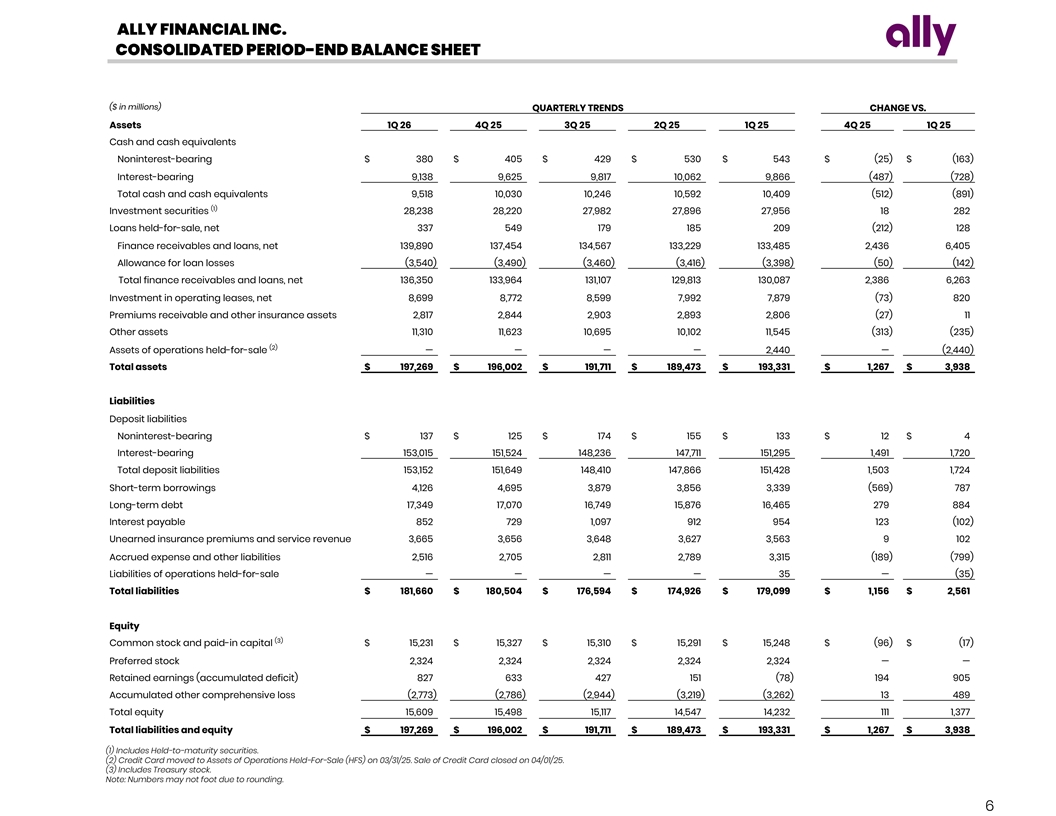 ALLY FINANCIAL INC. CONSOLIDATED INCOME STATEMENT ($ in millions) QUARTERLY TRENDS CHANGE VS. 1Q 26 4Q 25 3Q 25 2Q 25 1Q 25 4Q 25 1Q 25 Financing revenue and other interest income Interest and fees on finance receivables and loans $ 2,658 $ 2,690 $ 2,674 $ 2,624 $ 2,709 $ (32) $ (51) Interest on loans held-for-sale 9 7 6 6 5 2 4 Total interest and dividends on investment securities 223 234 241 239 221 (11) 2 Interest-bearing cash 81 88 92 95 98 (7) (17) Other earning assets 11 10 9 9 9 1 2 Operating leases 392 387 365 352 351 5 41 Total financing revenue and other interest income 3,374 3,416 3,387 3,325 3,393 (42) (19) Interest expense Interest on deposits 1,233 1,268 1,302 1,329 1,403 (35) (170) Interest on short-term borrowings 19 18 11 5 1 1 18 Interest on long-term debt 265 274 265 258 271 (9) (6) Interest on other — 2 — 1 — (2) — Total interest expense 1,517 1,562 1,578 1,593 1,675 (45) (158) Depreciation expense on operating lease assets 268 256 225 216 240 12 28 Net financing revenue $ 1,589 $ 1,598 $ 1,584 $ 1,516 $ 1,478 $ (9) $ 111 Other revenue Insurance premiums and service revenue earned 360 366 361 359 364 (6) (4) Gain / (loss) on mortgage and automotive loans, net (3) (29) (3) (4) 1 26 (4) Other gain / (loss) on investments, net (21) 21 56 61 (499) (42) 478 Other income, net of losses 177 167 170 150 197 10 (20) Total other revenue 513 525 584 566 63 (12) 450 Total net revenue 2,102 2,123 2,168 2,082 1,541 (21) 561 Provision for loan losses 467 487 415 384 191 (20) 276 Noninterest expense Compensation and benefits expense 491 475 447 430 505 16 (14) Insurance losses and loss adjustment expenses 121 111 141 203 161 10 (40) Goodwill impairment — — — — 305 — (305) Other operating expenses 623 664 652 629 663 (41) (40) Total noninterest expense 1,235 1,250 1,240 1,262 1,634 (15) (399) Pre-tax income (loss) from continuing operations $ 400 $ 386 $ 513 $ 436 $ (284) $ 14 $ 684 Income tax (benefit) / expense from continuing operations 81 59 115 84 (59) 22 140 Net income (loss) from continuing operations 319 327 398 352 (225) (8) 544 Loss from discontinued operations, net of tax — — — — — — — Net income (loss) $ 319 $ 327 $ 398 $ 352 $ (225) $ (8) $ 544 Preferred Dividends 28 27 27 28 28 1 — Net income (loss) available to common shareholders $ 291 $ 300 $ 371 $ 324 $ (253) $ (9) $ 544 Core pre-tax Income walk Net financing revenue $ 1,589 $ 1,598 $ 1,584 $ 1,516 $ 1,478 $ (9) $ 111 Other revenue 513 525 584 566 63 (12) 450 Provision for credit losses 467 487 415 384 191 (20) 276 Total noninterest expense 1,235 1,250 1,240 1,262 1,634 (15) (399) Pre-tax income (loss) from continuing operations $ 400 $ 386 $ 513 $ 436 $ (284) $ 14 $ 684 (1) Core OID 18 17 17 16 16 1 3 (2) Change in the fair value of equity securities 59 (2) (27) (35) 13 60 46 (2) Repositioning (7) 59 — — 503 (66) (510) (1) Core pre-tax income $ 470 $ 461 $ 502 $ 418 $ 247 $ 9 $ 223 (1) Represents a non-GAAP financial measure. For more details refer to pages 19-24. (2) For more details refer to pages 23-24. Note: Numbers may not foot due to rounding. 5