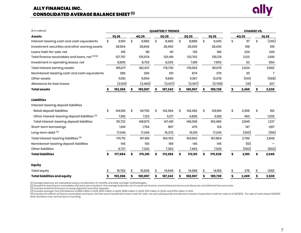 ALLY FINANCIAL INC. CONSOLIDATED PERIOD-END BALANCE SHEET ($ in millions) QUARTERLY TRENDS CHANGE VS. Assets 1Q 26 4Q 25 3Q 25 2Q 25 1Q 25 4Q 25 1Q 25 Cash and cash equivalents Noninterest-bearing $ 380 $ 405 $ 429 $ 530 $ 543 $ (25) $ (163) Interest-bearing 9,138 9,625 9,817 10,062 9,866 (487) (728) Total cash and cash equivalents 9,518 10,030 10,246 10,592 10,409 (512) (891) (1) Investment securities 28,238 28,220 27,982 27,896 27,956 18 282 Loans held-for-sale, net 337 549 179 185 209 (212) 128 Finance receivables and loans, net 139,890 137,454 134,567 133,229 133,485 2,436 6,405 Allowance for loan losses (3,540) (3,490) (3,460) (3,416) (3,398) (50) (142) Total finance receivables and loans, net 136,350 133,964 131,107 129,813 130,087 2,386 6,263 Investment in operating leases, net 8,699 8,772 8,599 7,992 7,879 (73) 820 Premiums receivable and other insurance assets 2,817 2,844 2,903 2,893 2,806 (27) 11 Other assets 11,310 11,623 10,695 10,102 11,545 (313) (235) (2) Assets of operations held-for-sale — — — — 2,440 — (2,440) Total assets $ 197,269 $ 196,002 $ 191,711 $ 189,473 $ 193,331 $ 1,267 $ 3,938 Liabilities Deposit liabilities Noninterest-bearing $ 137 $ 125 $ 174 $ 155 $ 133 $ 12 $ 4 Interest-bearing 153,015 151,524 148,236 147,711 151,295 1,491 1,720 Total deposit liabilities 153,152 151,649 148,410 147,866 151,428 1,503 1,724 Short-term borrowings 4,126 4,695 3,879 3,856 3,339 (569) 787 Long-term debt 17,349 17,070 16,749 15,876 16,465 279 884 Interest payable 852 729 1,097 912 954 123 (102) Unearned insurance premiums and service revenue 3,665 3,656 3,648 3,627 3,563 9 102 Accrued expense and other liabilities 2,516 2,705 2,811 2,789 3,315 (189) (799) Liabilities of operations held-for-sale — — — — 35 — (35) Total liabilities $ 181,660 $ 180,504 $ 176,594 $ 174,926 $ 179,099 $ 1,156 $ 2,561 Equity (3) Common stock and paid-in capital $ 15,231 $ 15,327 $ 15,310 $ 15,291 $ 15,248 $ (96) $ (17) Preferred stock 2,324 2,324 2,324 2,324 2,324 — — Retained earnings (accumulated deficit) 827 633 427 151 (78) 194 905 Accumulated other comprehensive loss (2,773) (2,786) (2,944) (3,219) (3,262) 13 489 Total equity 15,609 15,498 15,117 14,547 14,232 111 1,377 Total liabilities and equity $ 197,269 $ 196,002 $ 191,711 $ 189,473 $ 193,331 $ 1,267 $ 3,938 (1) Includes Held-to-maturity securities. (2) Credit Card moved to Assets of Operations Held-For-Sale (HFS) on 03/31/25. Sale of Credit Card closed on 04/01/25. (3) Includes Treasury stock. Note: Numbers may not foot due to rounding. 6