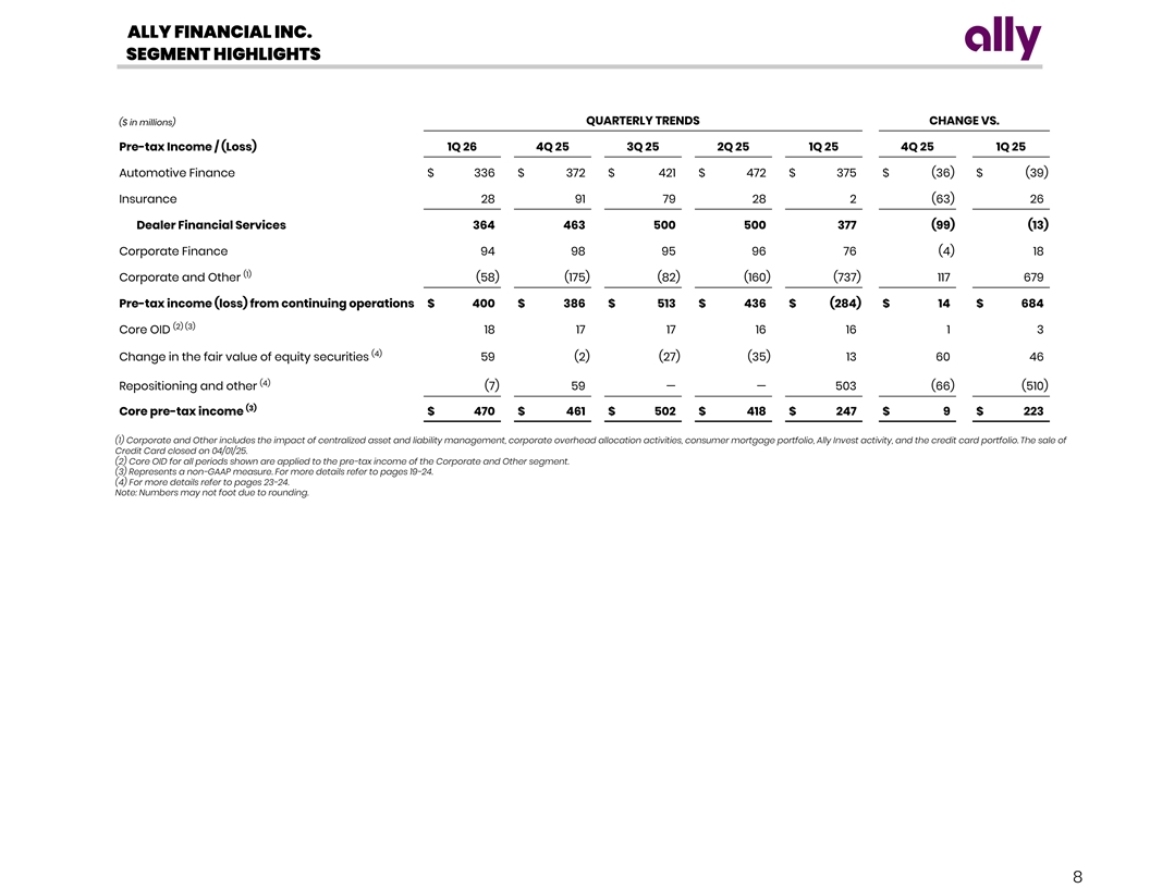 ALLY FINANCIAL INC. SEGMENT HIGHLIGHTS QUARTERLY TRENDS CHANGE VS. ($ in millions) Pre-tax Income / (Loss) 1Q 26 4Q 25 3Q 25 2Q 25 1Q 25 4Q 25 1Q 25 Automotive Finance $ 336 $ 372 $ 421 $ 472 $ 375 $ (36) $ (39) Insurance 28 91 79 28 2 (63) 26 Dealer Financial Services 364 463 500 500 377 (99) (13) Corporate Finance 94 98 95 96 76 (4) 18 (1) Corporate and Other (58) (175) (82) (160) (737) 117 679 Pre-tax income (loss) from continuing operations $ 400 $ 386 $ 513 $ 436 $ (284) $ 14 $ 684 (2) (3) Core OID 18 17 17 16 16 1 3 (4) Change in the fair value of equity securities 59 (2) (27) (35) 13 60 46 (4) Repositioning and other (7) 59 — — 503 (66) (510) (3) Core pre-tax income $ 470 $ 461 $ 502 $ 418 $ 247 $ 9 $ 223 (1) Corporate and Other includes the impact of centralized asset and liability management, corporate overhead allocation activities, consumer mortgage portfolio, Ally Invest activity, and the credit card portfolio. The sale of Credit Card closed on 04/01/25. (2) Core OID for all periods shown are applied to the pre-tax income of the Corporate and Other segment. (3) Represents a non-GAAP measure. For more details refer to pages 19-24. (4) For more details refer to pages 23-24. Note: Numbers may not foot due to rounding. 8