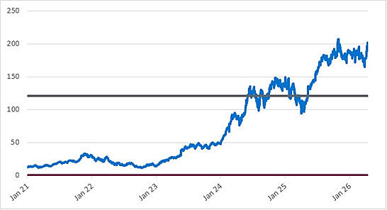 The following graph sets forth the daily historical performance of NVDA in the period from January 2, 2021 through April 17, 2026. We obtained this historical data from Bloomberg L.P. We have not independently verified the accuracy or completeness of the information obtained from Bloomberg L.P. The horizontal line in the graph represents NVDA’s hypothetical Threshold Price of $121.008, which is 60% of NVDA’s hypothetical Starting Price of $201.68, which was its closing price on April 17, 2026. The actual Starting Price and Threshold Price will be determined on the Pricing Date.