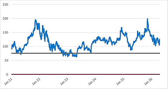 The following graph sets forth the daily historical performance of DDOG in the period from January 2, 2021 through April 17, 2026. We obtained this historical data from Bloomberg L.P. We have not independently verified the accuracy or completeness of the information obtained from Bloomberg L.P. The horizontal line in the graph represents DDOG’s hypothetical Threshold Price of $75.966, which is 60% of DDOG’s hypothetical Starting Price of $126.61, which was its stock closing price on April 17, 2026. The actual Starting Price and Threshold Price will be determined on the Pricing Date.