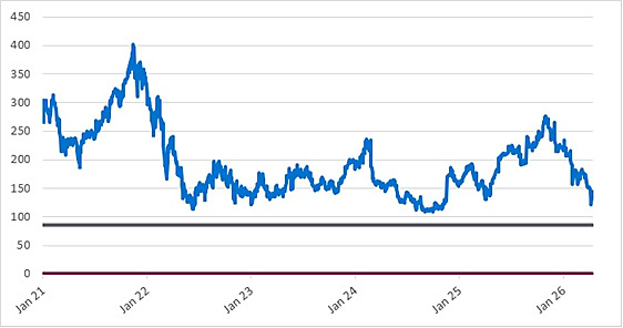 The following graph sets forth the daily historical performance of SNOW in the period from January 2, 2021 through April 17, 2026. We obtained this historical data from Bloomberg L.P. We have not independently verified the accuracy or completeness of the information obtained from Bloomberg L.P. The horizontal line in the graph represents SNOW’s hypothetical Threshold Price of $86.388, which is 60% of SNOW’s hypothetical Starting Price of $143.98, which was its stock closing price on April 17, 2026. The actual Starting Price and Threshold Price will be determined on the Pricing Date.
