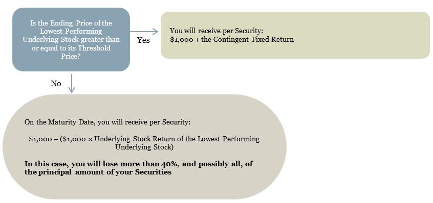 On the Maturity Date, you will be entitled to receive a cash payment per Security in U.S. dollars equal to the Maturity Payment Amount. The “Maturity Payment Amount” per Security will equal: • if the Ending Price of the Lowest Performing Underlying Stock is greater than or equal to its Threshold Price: $1,000 + the Contingent Fixed Return; |