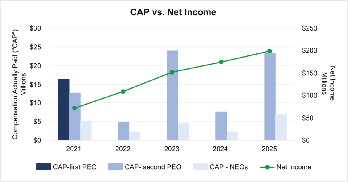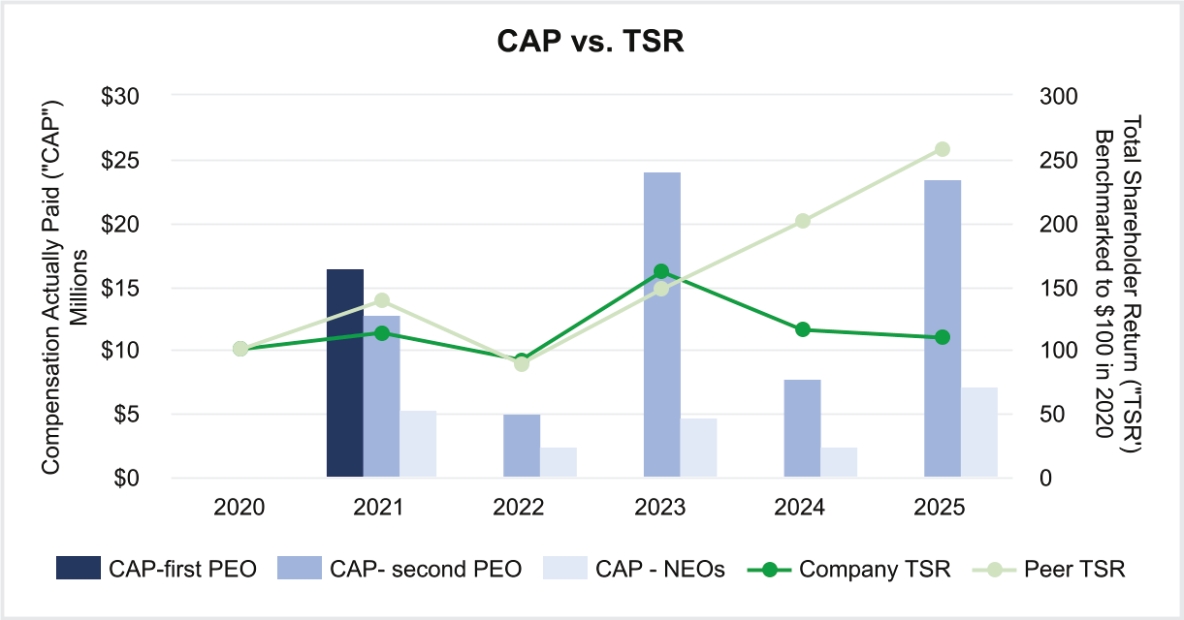Pay Versus Performance As required by Section 953(a) of the Dodd-Frank Wall Street Reform and Consumer Protection Act and Item 402(v) of Regulation S-K, we are providing the following information about the relationship between executive compensation and certain financial performance measures of the Company. For further information concerning the Company’s pay-for-performance philosophy and how executive compensation aligns with the Company’s performance, please see the “Executive Compensation — Compensation Discussion and Analysis” section of this proxy statement. Pay Versus Performance Table | | | | | | | | | | | | | | | | | | | | | | | | | | | | | | | 2025 | | | $— | | | $— | | | $15,947,158 | | | $23,511,311 | | | $5,544,470 | | | $7,060,857 | | | $109.05 | | | $258.44 | | | $198.3 | | | $669.1 | | | 2024 | | | $— | | | $— | | | $15,650,272 | | | $7,830,649 | | | $5,514,326 | | | $2,529,577 | | | $115.06 | | | $200.98 | | | $173.7 | | | $607.6 | | | 2023 | | | $— | | | $— | | | $7,783,232 | | | $23,974,241 | | | $2,503,572 | | | $4,719,665 | | | $161.06 | | | $147.39 | | | $151.6 | | | $554.5 | | | 2022 | | | $— | | | $— | | | $11,392,553 | | | $5,138,863 | | | $4,444,562 | | | $2,529,882 | | | $92.09 | | | $88.54 | | | $108.0 | | | $489.7 | | | 2021 | | | $20,875,111 | | | $16,450,909 | | | $9,396,664 | | | $12,827,121 | | | $4,140,001 | | | $5,326,529 | | | $112.60 | | | $137.86 | | | $71.0 | | | $411.2 | |