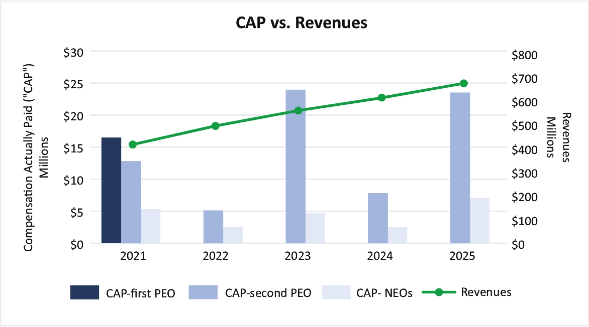 Compensation Actually Paid and Revenues The following chart reflects the amount of compensation actually paid to Mr. Thakar (for 2025, 2024, 2023, 2022 and 2021), Mr. Courtot (for 2021), and the average amount of compensation actually paid to our NEOs as a group (excluding the PEOs in each given year) in relation to the Company’s revenues over the five years presented in the table. While we utilize a number of performance measures to evaluate company performance, we have determined that revenues is the most important financial performance measure (not otherwise required to be disclosed in the table) to link compensation actually paid to the our NEOs to Company performance. We use revenue growth when setting goals for our corporate bonus plan and PRSUs granted to our NEOs.