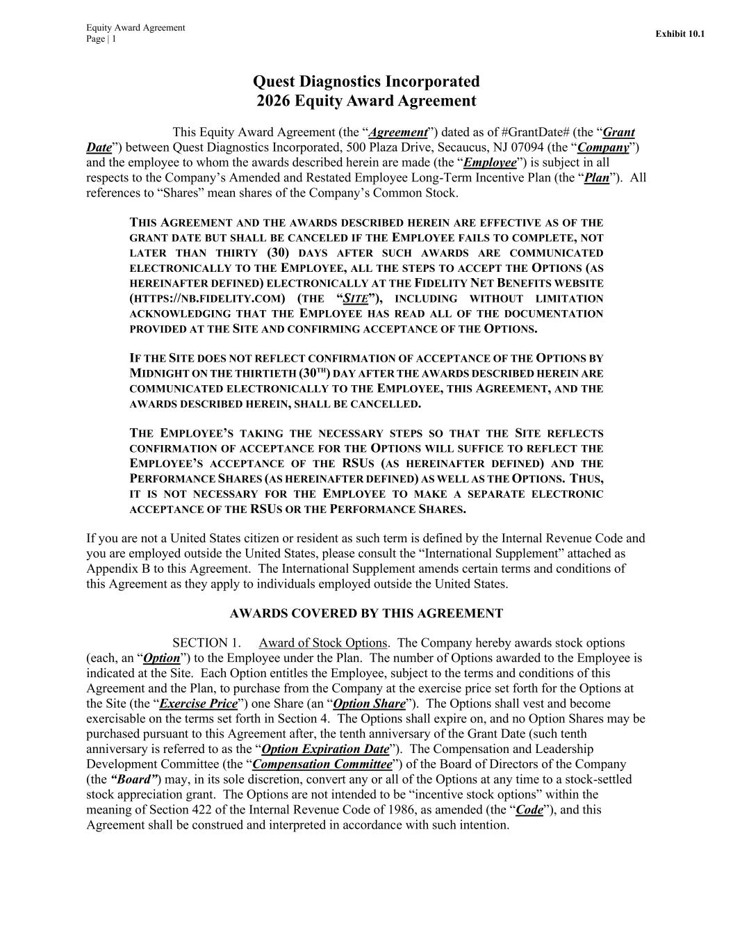 Equity Award Agreement Page | 1 Quest Diagnostics Incorporated 2026 Equity Award Agreement This Equity Award Agreement (the “Agreement”) dated as of #GrantDate# (the “Grant Date”) between Quest Diagnostics Incorporated, 500 Plaza Drive, Secaucus, NJ 07094 (the “Company”) and the employee to whom the awards described herein are made (the “Employee”) is subject in all respects to the Company’s Amended and Restated Employee Long-Term Incentive Plan (the “Plan”). All references to “Shares” mean shares of the Company’s Common Stock. THIS AGREEMENT AND THE AWARDS DESCRIBED HEREIN ARE EFFECTIVE AS OF THE GRANT DATE BUT SHALL BE CANCELED IF THE EMPLOYEE FAILS TO COMPLETE, NOT LATER THAN THIRTY (30) DAYS AFTER SUCH AWARDS ARE COMMUNICATED ELECTRONICALLY TO THE EMPLOYEE, ALL THE STEPS TO ACCEPT THE OPTIONS (AS HEREINAFTER DEFINED) ELECTRONICALLY AT THE FIDELITY NET BENEFITS WEBSITE (HTTPS://NB.FIDELITY.COM) (THE “SITE”), INCLUDING WITHOUT LIMITATION ACKNOWLEDGING THAT THE EMPLOYEE HAS READ ALL OF THE DOCUMENTATION PROVIDED AT THE SITE AND CONFIRMING ACCEPTANCE OF THE OPTIONS. IF THE SITE DOES NOT REFLECT CONFIRMATION OF ACCEPTANCE OF THE OPTIONS BY MIDNIGHT ON THE THIRTIETH (30TH) DAY AFTER THE AWARDS DESCRIBED HEREIN ARE COMMUNICATED ELECTRONICALLY TO THE EMPLOYEE, THIS AGREEMENT, AND THE AWARDS DESCRIBED HEREIN, SHALL BE CANCELLED. THE EMPLOYEE’S TAKING THE NECESSARY STEPS SO THAT THE SITE REFLECTS CONFIRMATION OF ACCEPTANCE FOR THE OPTIONS WILL SUFFICE TO REFLECT THE EMPLOYEE’S ACCEPTANCE OF THE RSUS (AS HEREINAFTER DEFINED) AND THE PERFORMANCE SHARES (AS HEREINAFTER DEFINED) AS WELL AS THE OPTIONS. THUS, IT IS NOT NECESSARY FOR THE EMPLOYEE TO MAKE A SEPARATE ELECTRONIC ACCEPTANCE OF THE RSUS OR THE PERFORMANCE SHARES. If you are not a United States citizen or resident as such term is defined by the Internal Revenue Code and you are employed outside the United States, please consult the “International Supplement” attached as Appendix B to this Agreement. The International Supplement amends certain terms and conditions of this Agreement as they apply to individuals employed outside the United States. AWARDS COVERED BY THIS AGREEMENT SECTION 1. Award of Stock Options. The Company hereby awards stock options (each, an “Option”) to the Employee under the Plan. The number of Options awarded to the Employee is indicated at the Site. Each Option entitles the Employee, subject to the terms and conditions of this Agreement and the Plan, to purchase from the Company at the exercise price set forth for the Options at the Site (the “Exercise Price”) one Share (an “Option Share”). The Options shall vest and become exercisable on the terms set forth in Section 4. The Options shall expire on, and no Option Shares may be purchased pursuant to this Agreement after, the tenth anniversary of the Grant Date (such tenth anniversary is referred to as the “Option Expiration Date”). The Compensation and Leadership Development Committee (the “Compensation Committee”) of the Board of Directors of the Company (the “Board”) may, in its sole discretion, convert any or all of the Options at any time to a stock-settled stock appreciation grant. The Options are not intended to be “incentive stock options” within the meaning of Section 422 of the Internal Revenue Code of 1986, as amended (the “Code”), and this Agreement shall be construed and interpreted in accordance with such intention. Exhibit 10.1