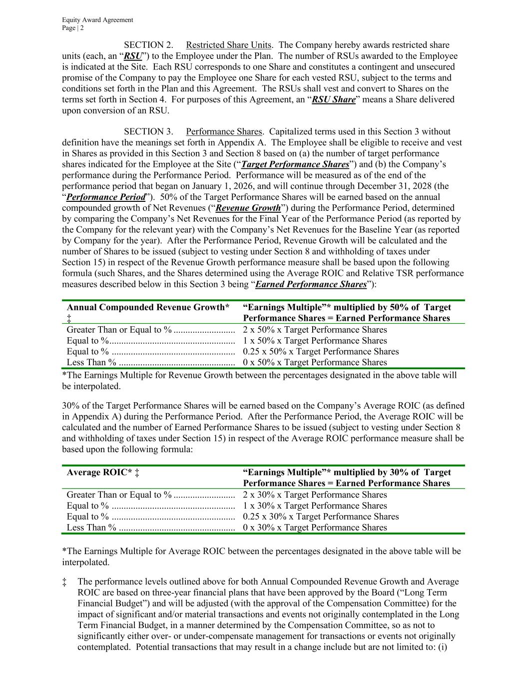 Equity Award Agreement Page | 2 SECTION 2. Restricted Share Units. The Company hereby awards restricted share units (each, an “RSU”) to the Employee under the Plan. The number of RSUs awarded to the Employee is indicated at the Site. Each RSU corresponds to one Share and constitutes a contingent and unsecured promise of the Company to pay the Employee one Share for each vested RSU, subject to the terms and conditions set forth in the Plan and this Agreement. The RSUs shall vest and convert to Shares on the terms set forth in Section 4. For purposes of this Agreement, an “RSU Share” means a Share delivered upon conversion of an RSU. SECTION 3. Performance Shares. Capitalized terms used in this Section 3 without definition have the meanings set forth in Appendix A. The Employee shall be eligible to receive and vest in Shares as provided in this Section 3 and Section 8 based on (a) the number of target performance shares indicated for the Employee at the Site (“Target Performance Shares”) and (b) the Company’s performance during the Performance Period. Performance will be measured as of the end of the performance period that began on January 1, 2026, and will continue through December 31, 2028 (the “Performance Period”). 50% of the Target Performance Shares will be earned based on the annual compounded growth of Net Revenues (“Revenue Growth”) during the Performance Period, determined by comparing the Company’s Net Revenues for the Final Year of the Performance Period (as reported by the Company for the relevant year) with the Company’s Net Revenues for the Baseline Year (as reported by Company for the year). After the Performance Period, Revenue Growth will be calculated and the number of Shares to be issued (subject to vesting under Section 8 and withholding of taxes under Section 15) in respect of the Revenue Growth performance measure shall be based upon the following formula (such Shares, and the Shares determined using the Average ROIC and Relative TSR performance measures described below in this Section 3 being “Earned Performance Shares”): Annual Compounded Revenue Growth* ‡ “Earnings Multiple”* multiplied by 50% of Target Performance Shares = Earned Performance Shares Greater Than or Equal to % .......................... Equal to % ..................................................... 2 x 50% x Target Performance Shares 1 x 50% x Target Performance Shares Equal to % .................................................... 0.25 x 50% x Target Performance Shares Less Than % ................................................. 0 x 50% x Target Performance Shares *The Earnings Multiple for Revenue Growth between the percentages designated in the above table will be interpolated. 30% of the Target Performance Shares will be earned based on the Company’s Average ROIC (as defined in Appendix A) during the Performance Period. After the Performance Period, the Average ROIC will be calculated and the number of Earned Performance Shares to be issued (subject to vesting under Section 8 and withholding of taxes under Section 15) in respect of the Average ROIC performance measure shall be based upon the following formula: Average ROIC* ‡ “Earnings Multiple”* multiplied by 30% of Target Performance Shares = Earned Performance Shares Greater Than or Equal to % .......................... Equal to % .................................................... 2 x 30% x Target Performance Shares 1 x 30% x Target Performance Shares Equal to % .................................................... 0.25 x 30% x Target Performance Shares Less Than % ................................................. 0 x 30% x Target Performance Shares *The Earnings Multiple for Average ROIC between the percentages designated in the above table will be interpolated. ‡ The performance levels outlined above for both Annual Compounded Revenue Growth and Average ROIC are based on three-year financial plans that have been approved by the Board (“Long Term Financial Budget”) and will be adjusted (with the approval of the Compensation Committee) for the impact of significant and/or material transactions and events not originally contemplated in the Long Term Financial Budget, in a manner determined by the Compensation Committee, so as not to significantly either over- or under-compensate management for transactions or events not originally contemplated. Potential transactions that may result in a change include but are not limited to: (i)