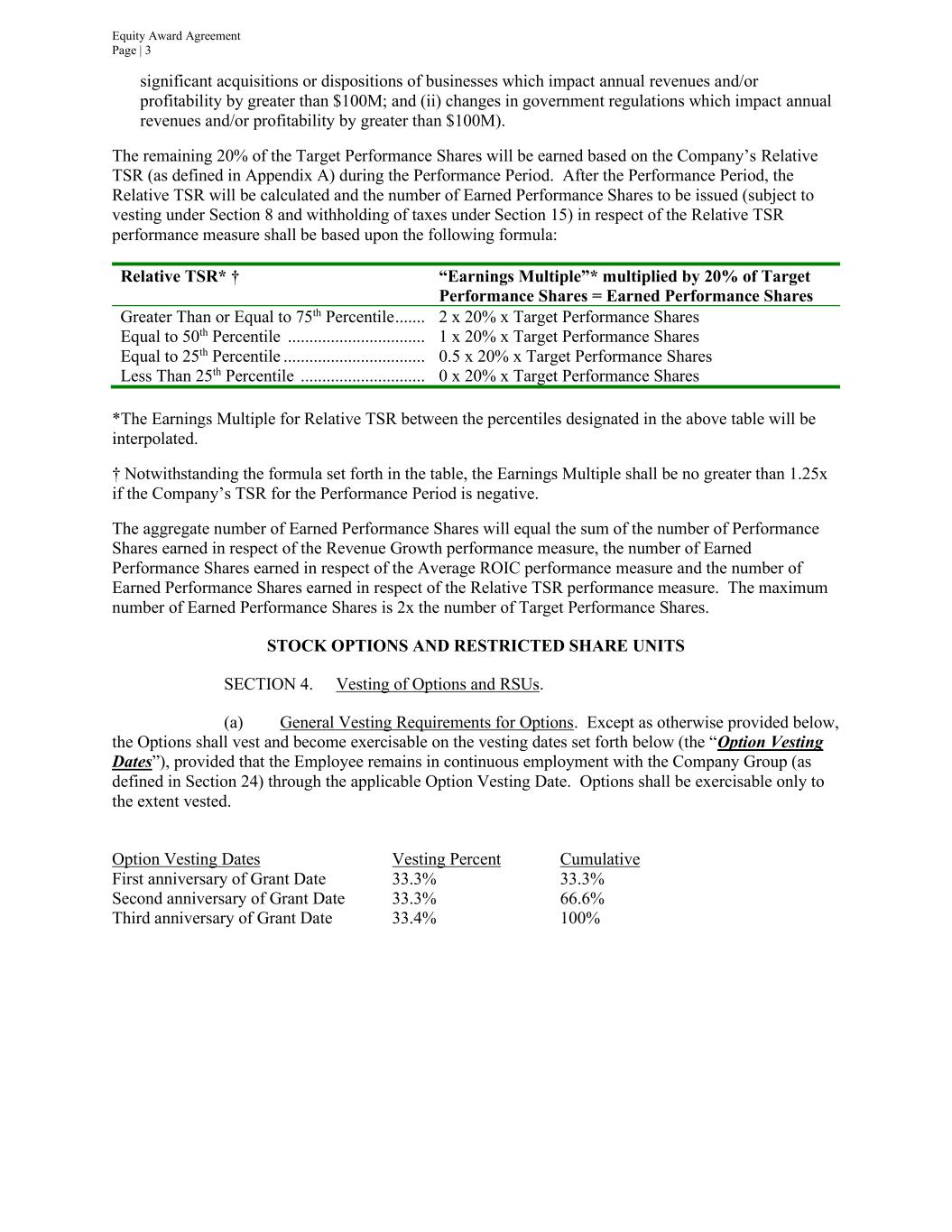 Equity Award Agreement Page | 3 significant acquisitions or dispositions of businesses which impact annual revenues and/or profitability by greater than $100M; and (ii) changes in government regulations which impact annual revenues and/or profitability by greater than $100M). The remaining 20% of the Target Performance Shares will be earned based on the Company’s Relative TSR (as defined in Appendix A) during the Performance Period. After the Performance Period, the Relative TSR will be calculated and the number of Earned Performance Shares to be issued (subject to vesting under Section 8 and withholding of taxes under Section 15) in respect of the Relative TSR performance measure shall be based upon the following formula: Relative TSR* † “Earnings Multiple”* multiplied by 20% of Target Performance Shares = Earned Performance Shares Greater Than or Equal to 75th Percentile ....... 2 x 20% x Target Performance Shares Equal to 50th Percentile ................................ 1 x 20% x Target Performance Shares Equal to 25th Percentile ................................. 0.5 x 20% x Target Performance Shares Less Than 25th Percentile ............................. 0 x 20% x Target Performance Shares *The Earnings Multiple for Relative TSR between the percentiles designated in the above table will be interpolated. † Notwithstanding the formula set forth in the table, the Earnings Multiple shall be no greater than 1.25x if the Company’s TSR for the Performance Period is negative. The aggregate number of Earned Performance Shares will equal the sum of the number of Performance Shares earned in respect of the Revenue Growth performance measure, the number of Earned Performance Shares earned in respect of the Average ROIC performance measure and the number of Earned Performance Shares earned in respect of the Relative TSR performance measure. The maximum number of Earned Performance Shares is 2x the number of Target Performance Shares. STOCK OPTIONS AND RESTRICTED SHARE UNITS SECTION 4. Vesting of Options and RSUs. (a) General Vesting Requirements for Options. Except as otherwise provided below, the Options shall vest and become exercisable on the vesting dates set forth below (the “Option Vesting Dates”), provided that the Employee remains in continuous employment with the Company Group (as defined in Section 24) through the applicable Option Vesting Date. Options shall be exercisable only to the extent vested. Option Vesting Dates Vesting Percent Cumulative First anniversary of Grant Date 33.3% 33.3% Second anniversary of Grant Date 33.3% 66.6% Third anniversary of Grant Date 33.4% 100%