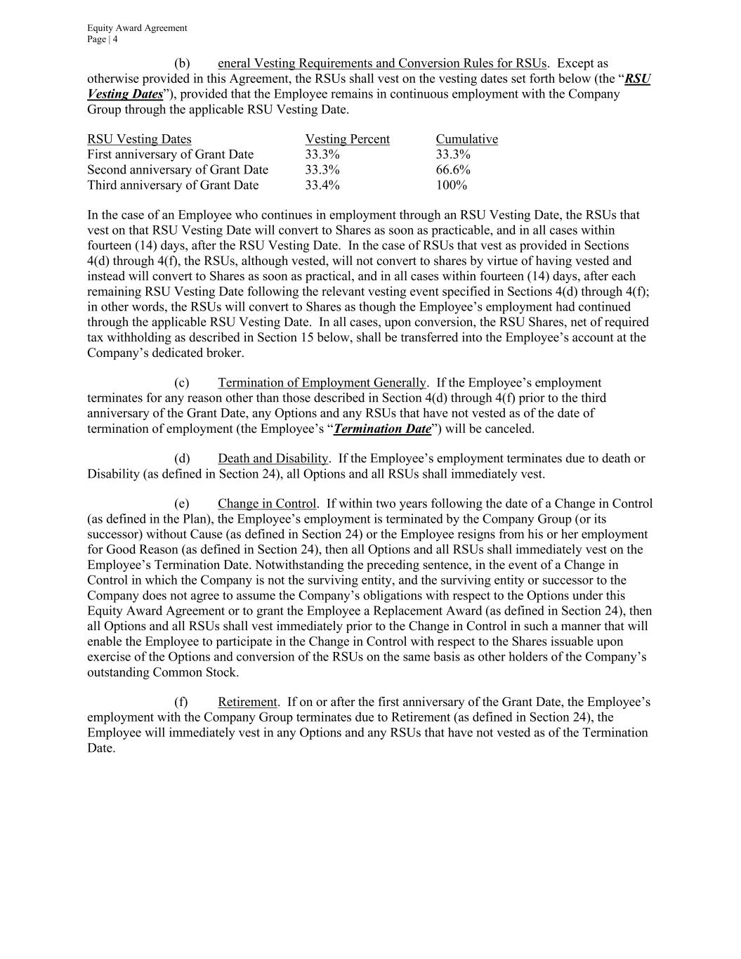 Equity Award Agreement Page | 4 (b) eneral Vesting Requirements and Conversion Rules for RSUs. Except as otherwise provided in this Agreement, the RSUs shall vest on the vesting dates set forth below (the “RSU Vesting Dates”), provided that the Employee remains in continuous employment with the Company Group through the applicable RSU Vesting Date. RSU Vesting Dates Vesting Percent Cumulative First anniversary of Grant Date 33.3% 33.3% Second anniversary of Grant Date 33.3% 66.6% Third anniversary of Grant Date 33.4% 100% In the case of an Employee who continues in employment through an RSU Vesting Date, the RSUs that vest on that RSU Vesting Date will convert to Shares as soon as practicable, and in all cases within fourteen (14) days, after the RSU Vesting Date. In the case of RSUs that vest as provided in Sections 4(d) through 4(f), the RSUs, although vested, will not convert to shares by virtue of having vested and instead will convert to Shares as soon as practical, and in all cases within fourteen (14) days, after each remaining RSU Vesting Date following the relevant vesting event specified in Sections 4(d) through 4(f); in other words, the RSUs will convert to Shares as though the Employee’s employment had continued through the applicable RSU Vesting Date. In all cases, upon conversion, the RSU Shares, net of required tax withholding as described in Section 15 below, shall be transferred into the Employee’s account at the Company’s dedicated broker. (c) Termination of Employment Generally. If the Employee’s employment terminates for any reason other than those described in Section 4(d) through 4(f) prior to the third anniversary of the Grant Date, any Options and any RSUs that have not vested as of the date of termination of employment (the Employee’s “Termination Date”) will be canceled. (d) Death and Disability. If the Employee’s employment terminates due to death or Disability (as defined in Section 24), all Options and all RSUs shall immediately vest. (e) Change in Control. If within two years following the date of a Change in Control (as defined in the Plan), the Employee’s employment is terminated by the Company Group (or its successor) without Cause (as defined in Section 24) or the Employee resigns from his or her employment for Good Reason (as defined in Section 24), then all Options and all RSUs shall immediately vest on the Employee’s Termination Date. Notwithstanding the preceding sentence, in the event of a Change in Control in which the Company is not the surviving entity, and the surviving entity or successor to the Company does not agree to assume the Company’s obligations with respect to the Options under this Equity Award Agreement or to grant the Employee a Replacement Award (as defined in Section 24), then all Options and all RSUs shall vest immediately prior to the Change in Control in such a manner that will enable the Employee to participate in the Change in Control with respect to the Shares issuable upon exercise of the Options and conversion of the RSUs on the same basis as other holders of the Company’s outstanding Common Stock. (f) Retirement. If on or after the first anniversary of the Grant Date, the Employee’s employment with the Company Group terminates due to Retirement (as defined in Section 24), the Employee will immediately vest in any Options and any RSUs that have not vested as of the Termination Date.