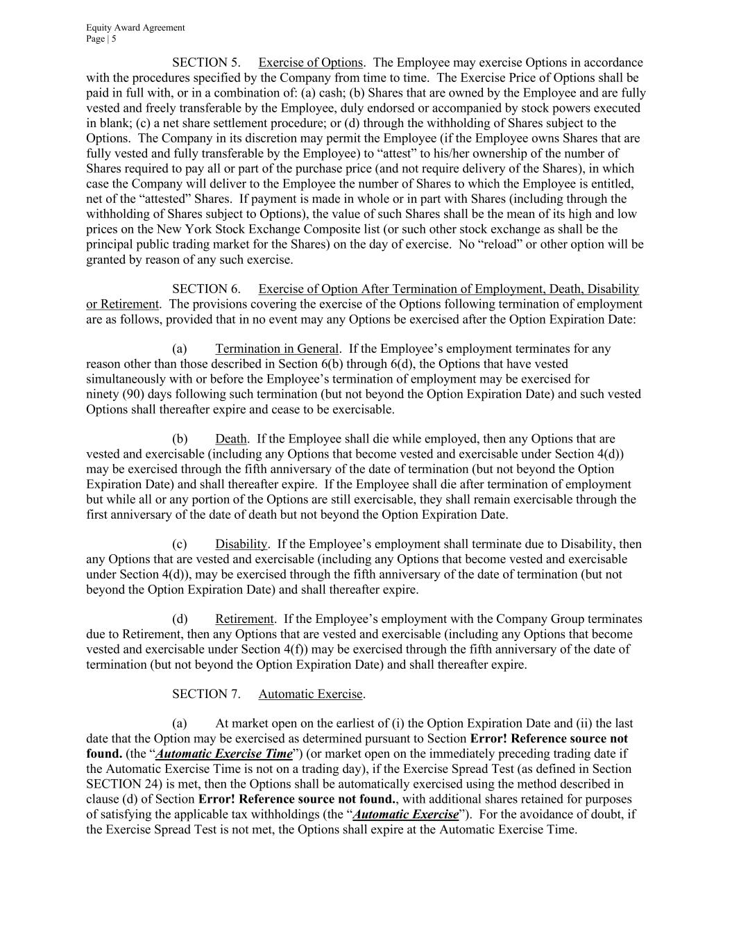 Equity Award Agreement Page | 5 SECTION 5. Exercise of Options. The Employee may exercise Options in accordance with the procedures specified by the Company from time to time. The Exercise Price of Options shall be paid in full with, or in a combination of: (a) cash; (b) Shares that are owned by the Employee and are fully vested and freely transferable by the Employee, duly endorsed or accompanied by stock powers executed in blank; (c) a net share settlement procedure; or (d) through the withholding of Shares subject to the Options. The Company in its discretion may permit the Employee (if the Employee owns Shares that are fully vested and fully transferable by the Employee) to “attest” to his/her ownership of the number of Shares required to pay all or part of the purchase price (and not require delivery of the Shares), in which case the Company will deliver to the Employee the number of Shares to which the Employee is entitled, net of the “attested” Shares. If payment is made in whole or in part with Shares (including through the withholding of Shares subject to Options), the value of such Shares shall be the mean of its high and low prices on the New York Stock Exchange Composite list (or such other stock exchange as shall be the principal public trading market for the Shares) on the day of exercise. No “reload” or other option will be granted by reason of any such exercise. SECTION 6. Exercise of Option After Termination of Employment, Death, Disability or Retirement. The provisions covering the exercise of the Options following termination of employment are as follows, provided that in no event may any Options be exercised after the Option Expiration Date: (a) Termination in General. If the Employee’s employment terminates for any reason other than those described in Section 6(b) through 6(d), the Options that have vested simultaneously with or before the Employee’s termination of employment may be exercised for ninety (90) days following such termination (but not beyond the Option Expiration Date) and such vested Options shall thereafter expire and cease to be exercisable. (b) Death. If the Employee shall die while employed, then any Options that are vested and exercisable (including any Options that become vested and exercisable under Section 4(d)) may be exercised through the fifth anniversary of the date of termination (but not beyond the Option Expiration Date) and shall thereafter expire. If the Employee shall die after termination of employment but while all or any portion of the Options are still exercisable, they shall remain exercisable through the first anniversary of the date of death but not beyond the Option Expiration Date. (c) Disability. If the Employee’s employment shall terminate due to Disability, then any Options that are vested and exercisable (including any Options that become vested and exercisable under Section 4(d)), may be exercised through the fifth anniversary of the date of termination (but not beyond the Option Expiration Date) and shall thereafter expire. (d) Retirement. If the Employee’s employment with the Company Group terminates due to Retirement, then any Options that are vested and exercisable (including any Options that become vested and exercisable under Section 4(f)) may be exercised through the fifth anniversary of the date of termination (but not beyond the Option Expiration Date) and shall thereafter expire. SECTION 7. Automatic Exercise. (a) At market open on the earliest of (i) the Option Expiration Date and (ii) the last date that the Option may be exercised as determined pursuant to Section Error! Reference source not found. (the “Automatic Exercise Time”) (or market open on the immediately preceding trading date if the Automatic Exercise Time is not on a trading day), if the Exercise Spread Test (as defined in Section SECTION 24) is met, then the Options shall be automatically exercised using the method described in clause (d) of Section Error! Reference source not found., with additional shares retained for purposes of satisfying the applicable tax withholdings (the “Automatic Exercise”). For the avoidance of doubt, if the Exercise Spread Test is not met, the Options shall expire at the Automatic Exercise Time.