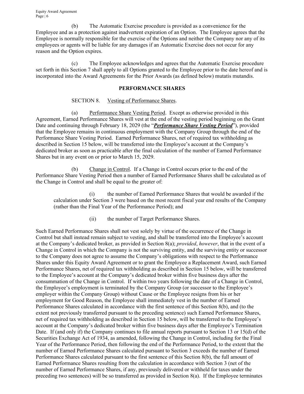 Equity Award Agreement Page | 6 (b) The Automatic Exercise procedure is provided as a convenience for the Employee and as a protection against inadvertent expiration of an Option. The Employee agrees that the Employee is normally responsible for the exercise of the Options and neither the Company nor any of its employees or agents will be liable for any damages if an Automatic Exercise does not occur for any reason and the Option expires. (c) The Employee acknowledges and agrees that the Automatic Exercise procedure set forth in this Section 7 shall apply to all Options granted to the Employee prior to the date hereof and is incorporated into the Award Agreements for the Prior Awards (as defined below) mutatis mutandis. PERFORMANCE SHARES SECTION 8. Vesting of Performance Shares. (a) Performance Share Vesting Period. Except as otherwise provided in this Agreement, Earned Performance Shares will vest at the end of the vesting period beginning on the Grant Date and continuing through February 18, 2029 (the “Performance Share Vesting Period”), provided that the Employee remains in continuous employment with the Company Group through the end of the Performance Share Vesting Period. Earned Performance Shares, net of required tax withholding as described in Section 15 below, will be transferred into the Employee’s account at the Company’s dedicated broker as soon as practicable after the final calculation of the number of Earned Performance Shares but in any event on or prior to March 15, 2029. (b) Change in Control. If a Change in Control occurs prior to the end of the Performance Share Vesting Period then a number of Earned Performance Shares shall be calculated as of the Change in Control and shall be equal to the greater of: (i) the number of Earned Performance Shares that would be awarded if the calculation under Section 3 were based on the most recent fiscal year end results of the Company (rather than the Final Year of the Performance Period); and (ii) the number of Target Performance Shares. Such Earned Performance Shares shall not vest solely by virtue of the occurrence of the Change in Control but shall instead remain subject to vesting, and shall be transferred into the Employee’s account at the Company’s dedicated broker, as provided in Section 8(a); provided, however, that in the event of a Change in Control in which the Company is not the surviving entity, and the surviving entity or successor to the Company does not agree to assume the Company’s obligations with respect to the Performance Shares under this Equity Award Agreement or to grant the Employee a Replacement Award, such Earned Performance Shares, net of required tax withholding as described in Section 15 below, will be transferred to the Employee’s account at the Company’s dedicated broker within five business days after the consummation of the Change in Control. If within two years following the date of a Change in Control, the Employee’s employment is terminated by the Company Group (or successor to the Employee’s employer within the Company Group) without Cause or the Employee resigns from his or her employment for Good Reason, the Employee shall immediately vest in the number of Earned Performance Shares calculated in accordance with the first sentence of this Section 8(b), and (to the extent not previously transferred pursuant to the preceding sentence) such Earned Performance Shares, net of required tax withholding as described in Section 15 below, will be transferred to the Employee’s account at the Company’s dedicated broker within five business days after the Employee’s Termination Date. If (and only if) the Company continues to file annual reports pursuant to Section 13 or 15(d) of the Securities Exchange Act of 1934, as amended, following the Change in Control, including for the Final Year of the Performance Period, then following the end of the Performance Period, to the extent that the number of Earned Performance Shares calculated pursuant to Section 3 exceeds the number of Earned Performance Shares calculated pursuant to the first sentence of this Section 8(b), the full amount of Earned Performance Shares resulting from the calculation in accordance with Section 3 (net of the number of Earned Performance Shares, if any, previously delivered or withheld for taxes under the preceding two sentences) will be so transferred as provided in Section 8(a). If the Employee terminates