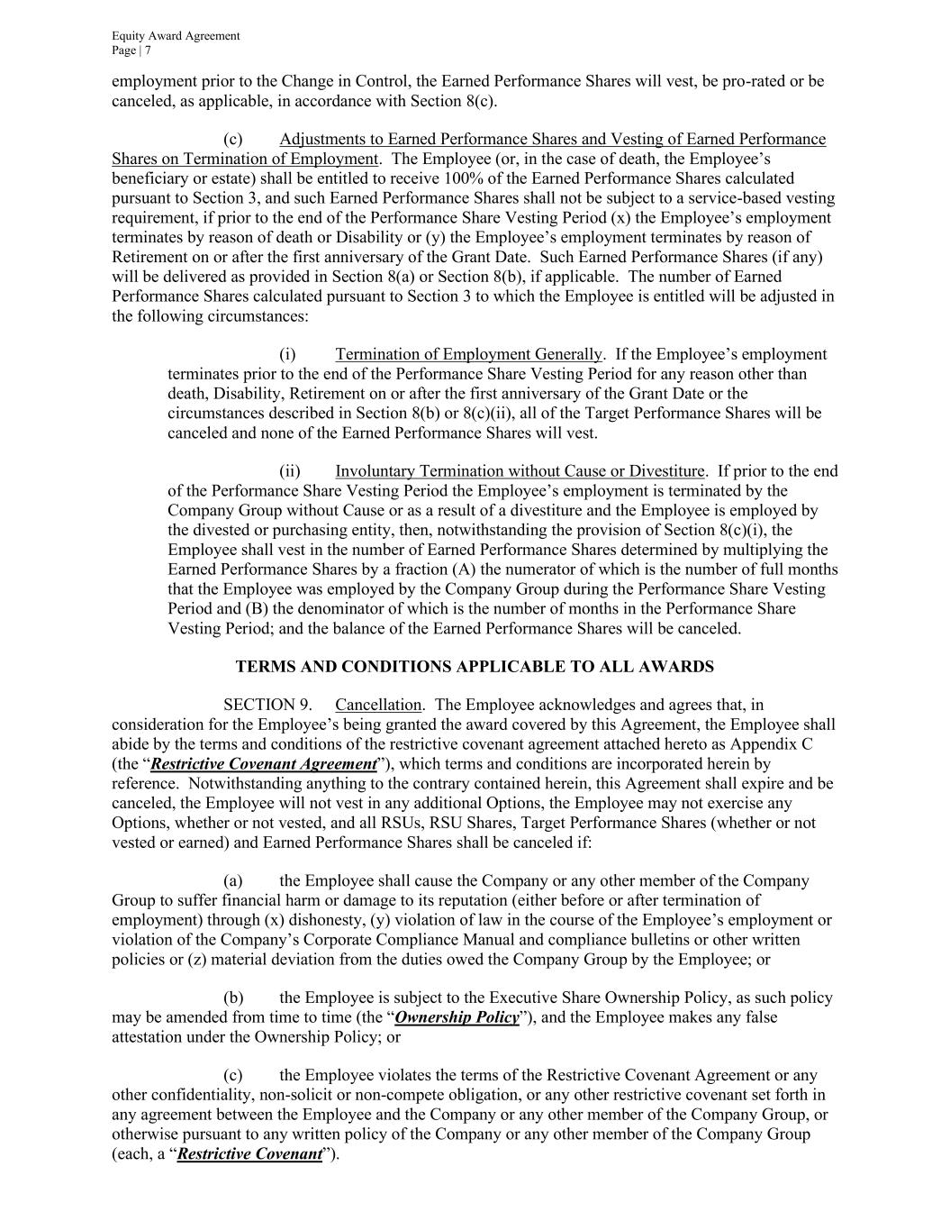 Equity Award Agreement Page | 7 employment prior to the Change in Control, the Earned Performance Shares will vest, be pro-rated or be canceled, as applicable, in accordance with Section 8(c). (c) Adjustments to Earned Performance Shares and Vesting of Earned Performance Shares on Termination of Employment. The Employee (or, in the case of death, the Employee’s beneficiary or estate) shall be entitled to receive 100% of the Earned Performance Shares calculated pursuant to Section 3, and such Earned Performance Shares shall not be subject to a service-based vesting requirement, if prior to the end of the Performance Share Vesting Period (x) the Employee’s employment terminates by reason of death or Disability or (y) the Employee’s employment terminates by reason of Retirement on or after the first anniversary of the Grant Date. Such Earned Performance Shares (if any) will be delivered as provided in Section 8(a) or Section 8(b), if applicable. The number of Earned Performance Shares calculated pursuant to Section 3 to which the Employee is entitled will be adjusted in the following circumstances: (i) Termination of Employment Generally. If the Employee’s employment terminates prior to the end of the Performance Share Vesting Period for any reason other than death, Disability, Retirement on or after the first anniversary of the Grant Date or the circumstances described in Section 8(b) or 8(c)(ii), all of the Target Performance Shares will be canceled and none of the Earned Performance Shares will vest. (ii) Involuntary Termination without Cause or Divestiture. If prior to the end of the Performance Share Vesting Period the Employee’s employment is terminated by the Company Group without Cause or as a result of a divestiture and the Employee is employed by the divested or purchasing entity, then, notwithstanding the provision of Section 8(c)(i), the Employee shall vest in the number of Earned Performance Shares determined by multiplying the Earned Performance Shares by a fraction (A) the numerator of which is the number of full months that the Employee was employed by the Company Group during the Performance Share Vesting Period and (B) the denominator of which is the number of months in the Performance Share Vesting Period; and the balance of the Earned Performance Shares will be canceled. TERMS AND CONDITIONS APPLICABLE TO ALL AWARDS SECTION 9. Cancellation. The Employee acknowledges and agrees that, in consideration for the Employee’s being granted the award covered by this Agreement, the Employee shall abide by the terms and conditions of the restrictive covenant agreement attached hereto as Appendix C (the “Restrictive Covenant Agreement”), which terms and conditions are incorporated herein by reference. Notwithstanding anything to the contrary contained herein, this Agreement shall expire and be canceled, the Employee will not vest in any additional Options, the Employee may not exercise any Options, whether or not vested, and all RSUs, RSU Shares, Target Performance Shares (whether or not vested or earned) and Earned Performance Shares shall be canceled if: (a) the Employee shall cause the Company or any other member of the Company Group to suffer financial harm or damage to its reputation (either before or after termination of employment) through (x) dishonesty, (y) violation of law in the course of the Employee’s employment or violation of the Company’s Corporate Compliance Manual and compliance bulletins or other written policies or (z) material deviation from the duties owed the Company Group by the Employee; or (b) the Employee is subject to the Executive Share Ownership Policy, as such policy may be amended from time to time (the “Ownership Policy”), and the Employee makes any false attestation under the Ownership Policy; or (c) the Employee violates the terms of the Restrictive Covenant Agreement or any other confidentiality, non-solicit or non-compete obligation, or any other restrictive covenant set forth in any agreement between the Employee and the Company or any other member of the Company Group, or otherwise pursuant to any written policy of the Company or any other member of the Company Group (each, a “Restrictive Covenant”).