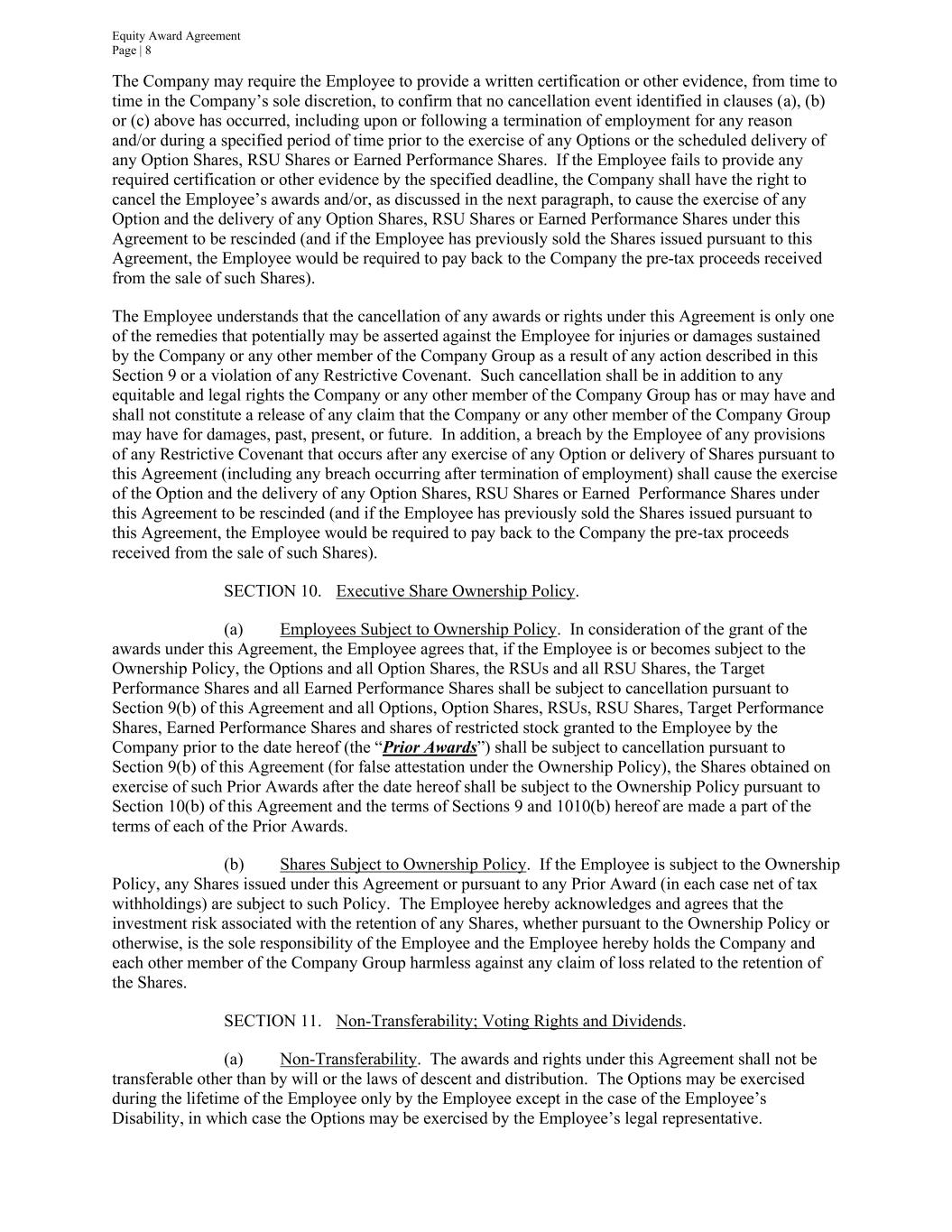 Equity Award Agreement Page | 8 The Company may require the Employee to provide a written certification or other evidence, from time to time in the Company’s sole discretion, to confirm that no cancellation event identified in clauses (a), (b) or (c) above has occurred, including upon or following a termination of employment for any reason and/or during a specified period of time prior to the exercise of any Options or the scheduled delivery of any Option Shares, RSU Shares or Earned Performance Shares. If the Employee fails to provide any required certification or other evidence by the specified deadline, the Company shall have the right to cancel the Employee’s awards and/or, as discussed in the next paragraph, to cause the exercise of any Option and the delivery of any Option Shares, RSU Shares or Earned Performance Shares under this Agreement to be rescinded (and if the Employee has previously sold the Shares issued pursuant to this Agreement, the Employee would be required to pay back to the Company the pre-tax proceeds received from the sale of such Shares). The Employee understands that the cancellation of any awards or rights under this Agreement is only one of the remedies that potentially may be asserted against the Employee for injuries or damages sustained by the Company or any other member of the Company Group as a result of any action described in this Section 9 or a violation of any Restrictive Covenant. Such cancellation shall be in addition to any equitable and legal rights the Company or any other member of the Company Group has or may have and shall not constitute a release of any claim that the Company or any other member of the Company Group may have for damages, past, present, or future. In addition, a breach by the Employee of any provisions of any Restrictive Covenant that occurs after any exercise of any Option or delivery of Shares pursuant to this Agreement (including any breach occurring after termination of employment) shall cause the exercise of the Option and the delivery of any Option Shares, RSU Shares or Earned Performance Shares under this Agreement to be rescinded (and if the Employee has previously sold the Shares issued pursuant to this Agreement, the Employee would be required to pay back to the Company the pre-tax proceeds received from the sale of such Shares). SECTION 10. Executive Share Ownership Policy. (a) Employees Subject to Ownership Policy. In consideration of the grant of the awards under this Agreement, the Employee agrees that, if the Employee is or becomes subject to the Ownership Policy, the Options and all Option Shares, the RSUs and all RSU Shares, the Target Performance Shares and all Earned Performance Shares shall be subject to cancellation pursuant to Section 9(b) of this Agreement and all Options, Option Shares, RSUs, RSU Shares, Target Performance Shares, Earned Performance Shares and shares of restricted stock granted to the Employee by the Company prior to the date hereof (the “Prior Awards”) shall be subject to cancellation pursuant to Section 9(b) of this Agreement (for false attestation under the Ownership Policy), the Shares obtained on exercise of such Prior Awards after the date hereof shall be subject to the Ownership Policy pursuant to Section 10(b) of this Agreement and the terms of Sections 9 and 1010(b) hereof are made a part of the terms of each of the Prior Awards. (b) Shares Subject to Ownership Policy. If the Employee is subject to the Ownership Policy, any Shares issued under this Agreement or pursuant to any Prior Award (in each case net of tax withholdings) are subject to such Policy. The Employee hereby acknowledges and agrees that the investment risk associated with the retention of any Shares, whether pursuant to the Ownership Policy or otherwise, is the sole responsibility of the Employee and the Employee hereby holds the Company and each other member of the Company Group harmless against any claim of loss related to the retention of the Shares. SECTION 11. Non-Transferability; Voting Rights and Dividends. (a) Non-Transferability. The awards and rights under this Agreement shall not be transferable other than by will or the laws of descent and distribution. The Options may be exercised during the lifetime of the Employee only by the Employee except in the case of the Employee’s Disability, in which case the Options may be exercised by the Employee’s legal representative.