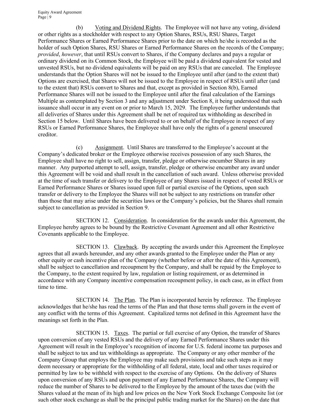 Equity Award Agreement Page | 9 (b) Voting and Dividend Rights. The Employee will not have any voting, dividend or other rights as a stockholder with respect to any Option Shares, RSUs, RSU Shares, Target Performance Shares or Earned Performance Shares prior to the date on which he/she is recorded as the holder of such Option Shares, RSU Shares or Earned Performance Shares on the records of the Company; provided, however, that until RSUs convert to Shares, if the Company declares and pays a regular or ordinary dividend on its Common Stock, the Employee will be paid a dividend equivalent for vested and unvested RSUs, but no dividend equivalents will be paid on any RSUs that are canceled. The Employee understands that the Option Shares will not be issued to the Employee until after (and to the extent that) Options are exercised, that Shares will not be issued to the Employee in respect of RSUs until after (and to the extent that) RSUs convert to Shares and that, except as provided in Section 8(b), Earned Performance Shares will not be issued to the Employee until after the final calculation of the Earnings Multiple as contemplated by Section 3 and any adjustment under Section 8, it being understood that such issuance shall occur in any event on or prior to March 15, 2029. The Employee further understands that all deliveries of Shares under this Agreement shall be net of required tax withholding as described in Section 15 below. Until Shares have been delivered to or on behalf of the Employee in respect of any RSUs or Earned Performance Shares, the Employee shall have only the rights of a general unsecured creditor. (c) Assignment. Until Shares are transferred to the Employee’s account at the Company’s dedicated broker or the Employee otherwise receives possession of any such Shares, the Employee shall have no right to sell, assign, transfer, pledge or otherwise encumber Shares in any manner. Any purported attempt to sell, assign, transfer, pledge or otherwise encumber any award under this Agreement will be void and shall result in the cancellation of such award. Unless otherwise provided at the time of such transfer or delivery to the Employee of any Shares issued in respect of vested RSUs or Earned Performance Shares or Shares issued upon full or partial exercise of the Options, upon such transfer or delivery to the Employee the Shares will not be subject to any restrictions on transfer other than those that may arise under the securities laws or the Company’s policies, but the Shares shall remain subject to cancellation as provided in Section 9. SECTION 12. Consideration. In consideration for the awards under this Agreement, the Employee hereby agrees to be bound by the Restrictive Covenant Agreement and all other Restrictive Covenants applicable to the Employee. SECTION 13. Clawback. By accepting the awards under this Agreement the Employee agrees that all awards hereunder, and any other awards granted to the Employee under the Plan or any other equity or cash incentive plan of the Company (whether before or after the date of this Agreement), shall be subject to cancellation and recoupment by the Company, and shall be repaid by the Employee to the Company, to the extent required by law, regulation or listing requirement, or as determined in accordance with any Company incentive compensation recoupment policy, in each case, as in effect from time to time. SECTION 14. The Plan. The Plan is incorporated herein by reference. The Employee acknowledges that he/she has read the terms of the Plan and that those terms shall govern in the event of any conflict with the terms of this Agreement. Capitalized terms not defined in this Agreement have the meanings set forth in the Plan. SECTION 15. Taxes. The partial or full exercise of any Option, the transfer of Shares upon conversion of any vested RSUs and the delivery of any Earned Performance Shares under this Agreement will result in the Employee’s recognition of income for U.S. federal income tax purposes and shall be subject to tax and tax withholdings as appropriate. The Company or any other member of the Company Group that employs the Employee may make such provisions and take such steps as it may deem necessary or appropriate for the withholding of all federal, state, local and other taxes required or permitted by law to be withheld with respect to the exercise of any Options. On the delivery of Shares upon conversion of any RSUs and upon payment of any Earned Performance Shares, the Company will reduce the number of Shares to be delivered to the Employee by the amount of the taxes due (with the Shares valued at the mean of its high and low prices on the New York Stock Exchange Composite list (or such other stock exchange as shall be the principal public trading market for the Shares) on the date that