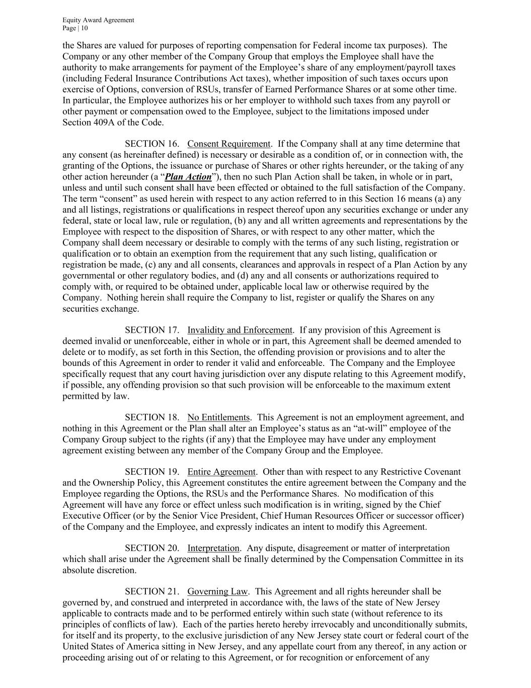 Equity Award Agreement Page | 10 the Shares are valued for purposes of reporting compensation for Federal income tax purposes). The Company or any other member of the Company Group that employs the Employee shall have the authority to make arrangements for payment of the Employee’s share of any employment/payroll taxes (including Federal Insurance Contributions Act taxes), whether imposition of such taxes occurs upon exercise of Options, conversion of RSUs, transfer of Earned Performance Shares or at some other time. In particular, the Employee authorizes his or her employer to withhold such taxes from any payroll or other payment or compensation owed to the Employee, subject to the limitations imposed under Section 409A of the Code. SECTION 16. Consent Requirement. If the Company shall at any time determine that any consent (as hereinafter defined) is necessary or desirable as a condition of, or in connection with, the granting of the Options, the issuance or purchase of Shares or other rights hereunder, or the taking of any other action hereunder (a “Plan Action”), then no such Plan Action shall be taken, in whole or in part, unless and until such consent shall have been effected or obtained to the full satisfaction of the Company. The term “consent” as used herein with respect to any action referred to in this Section 16 means (a) any and all listings, registrations or qualifications in respect thereof upon any securities exchange or under any federal, state or local law, rule or regulation, (b) any and all written agreements and representations by the Employee with respect to the disposition of Shares, or with respect to any other matter, which the Company shall deem necessary or desirable to comply with the terms of any such listing, registration or qualification or to obtain an exemption from the requirement that any such listing, qualification or registration be made, (c) any and all consents, clearances and approvals in respect of a Plan Action by any governmental or other regulatory bodies, and (d) any and all consents or authorizations required to comply with, or required to be obtained under, applicable local law or otherwise required by the Company. Nothing herein shall require the Company to list, register or qualify the Shares on any securities exchange. SECTION 17. Invalidity and Enforcement. If any provision of this Agreement is deemed invalid or unenforceable, either in whole or in part, this Agreement shall be deemed amended to delete or to modify, as set forth in this Section, the offending provision or provisions and to alter the bounds of this Agreement in order to render it valid and enforceable. The Company and the Employee specifically request that any court having jurisdiction over any dispute relating to this Agreement modify, if possible, any offending provision so that such provision will be enforceable to the maximum extent permitted by law. SECTION 18. No Entitlements. This Agreement is not an employment agreement, and nothing in this Agreement or the Plan shall alter an Employee’s status as an “at-will” employee of the Company Group subject to the rights (if any) that the Employee may have under any employment agreement existing between any member of the Company Group and the Employee. SECTION 19. Entire Agreement. Other than with respect to any Restrictive Covenant and the Ownership Policy, this Agreement constitutes the entire agreement between the Company and the Employee regarding the Options, the RSUs and the Performance Shares. No modification of this Agreement will have any force or effect unless such modification is in writing, signed by the Chief Executive Officer (or by the Senior Vice President, Chief Human Resources Officer or successor officer) of the Company and the Employee, and expressly indicates an intent to modify this Agreement. SECTION 20. Interpretation. Any dispute, disagreement or matter of interpretation which shall arise under the Agreement shall be finally determined by the Compensation Committee in its absolute discretion. SECTION 21. Governing Law. This Agreement and all rights hereunder shall be governed by, and construed and interpreted in accordance with, the laws of the state of New Jersey applicable to contracts made and to be performed entirely within such state (without reference to its principles of conflicts of law). Each of the parties hereto hereby irrevocably and unconditionally submits, for itself and its property, to the exclusive jurisdiction of any New Jersey state court or federal court of the United States of America sitting in New Jersey, and any appellate court from any thereof, in any action or proceeding arising out of or relating to this Agreement, or for recognition or enforcement of any